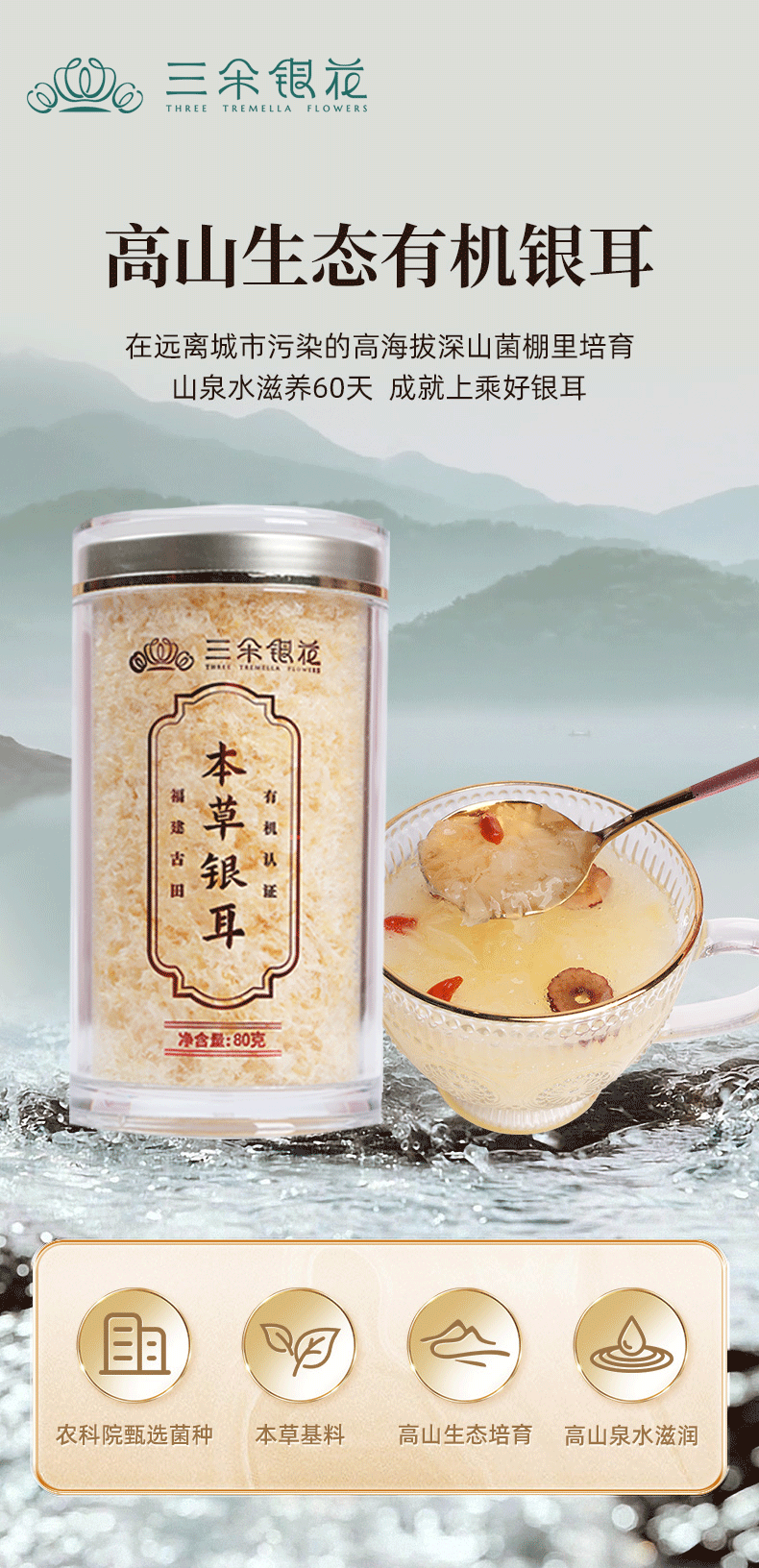 三朵银花 有机本草银耳80克/罐 免洗免煮 开水焖泡速食即食 可搭配红枣枸杞