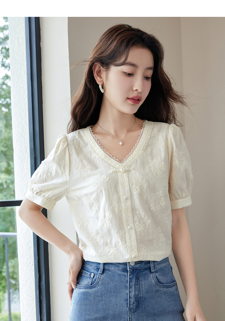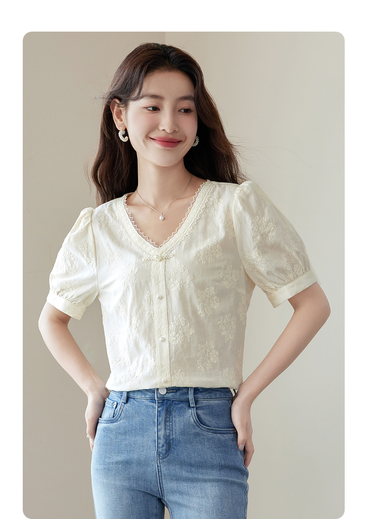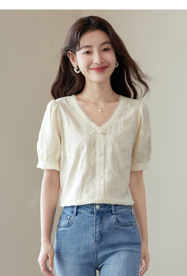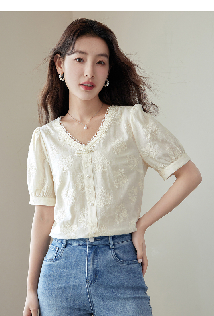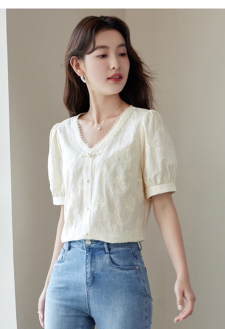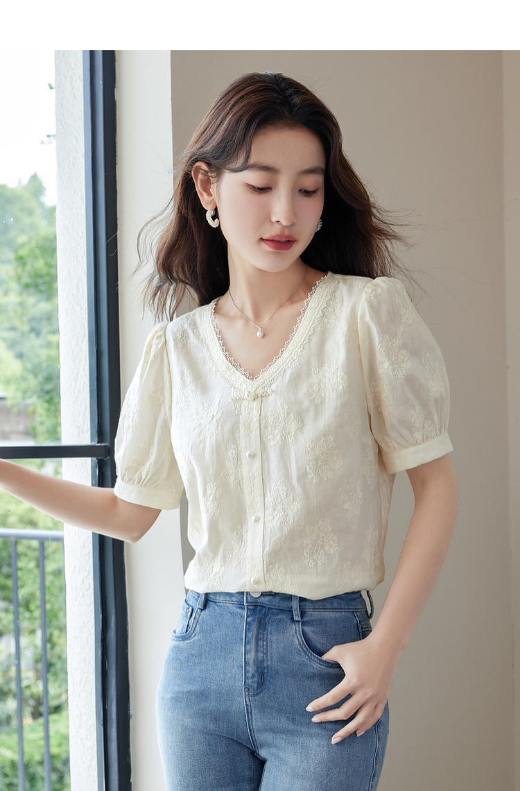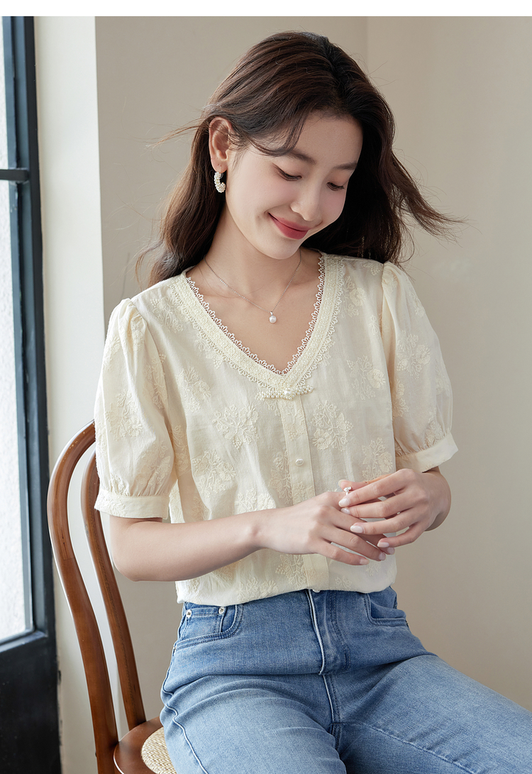 【五折购】熙世界夏女装中式国风珍珠盘扣V领绣花雪纺衬衫泡泡袖纯棉上衣