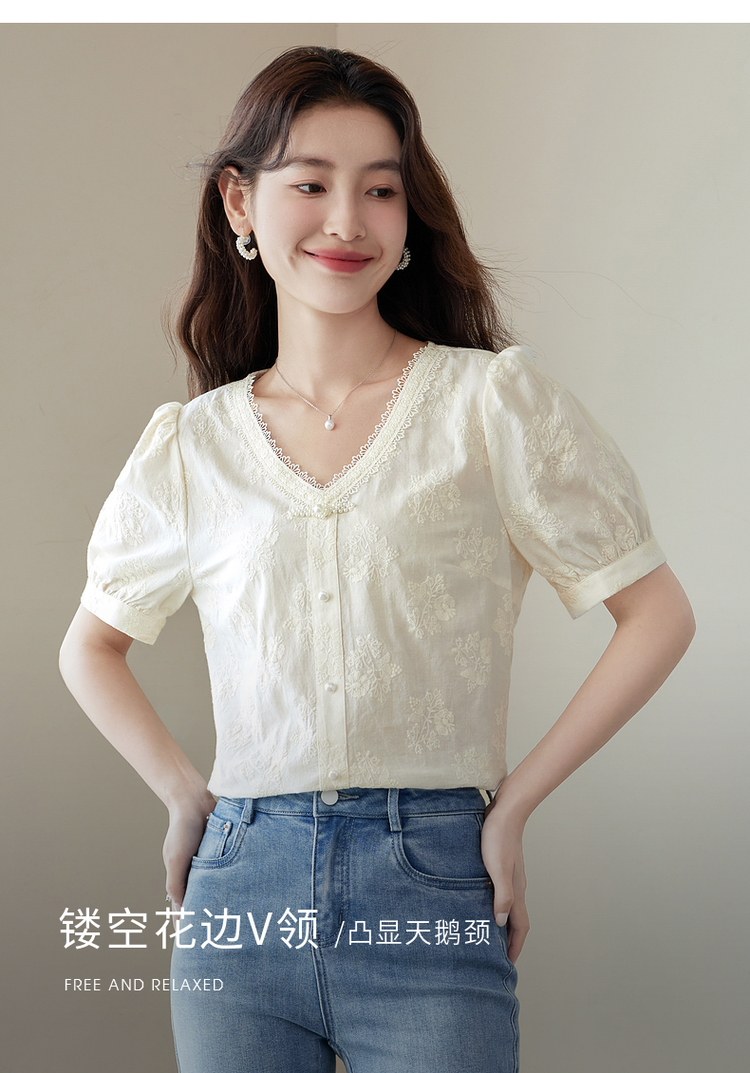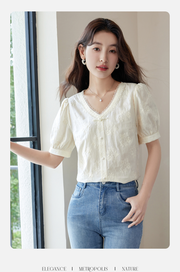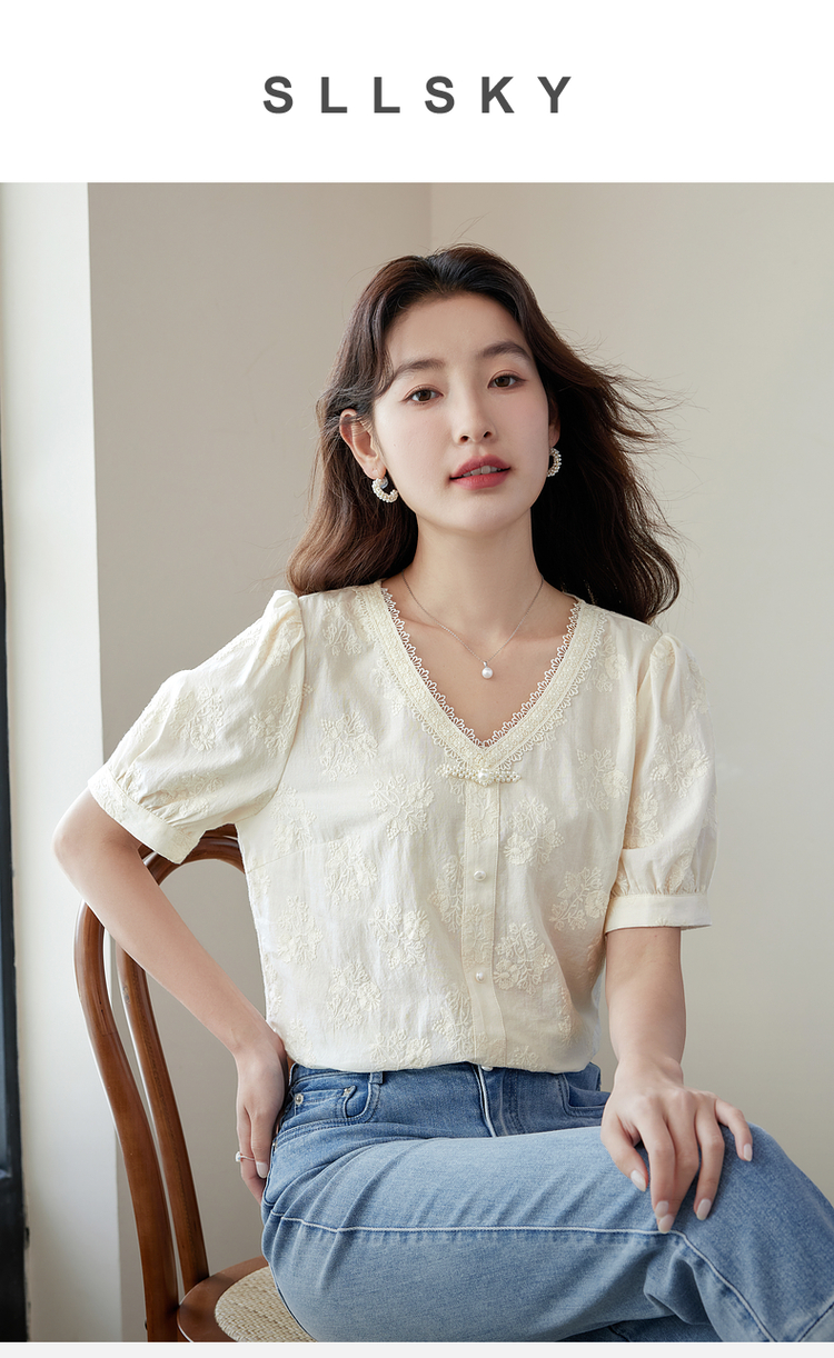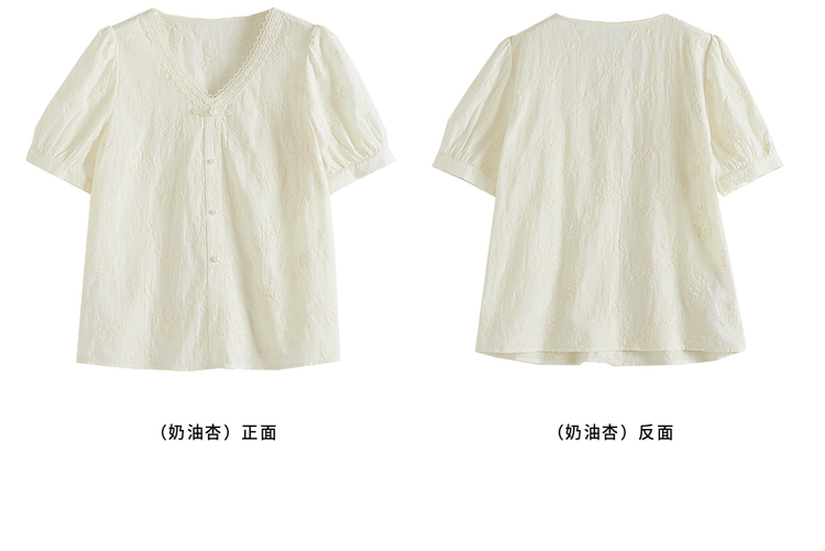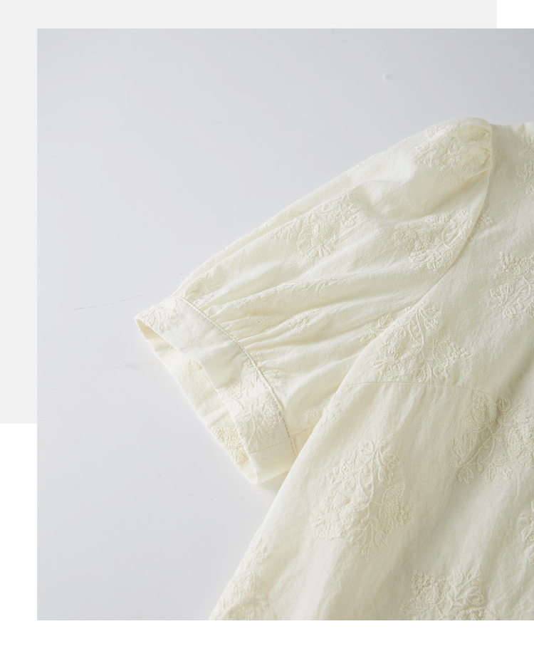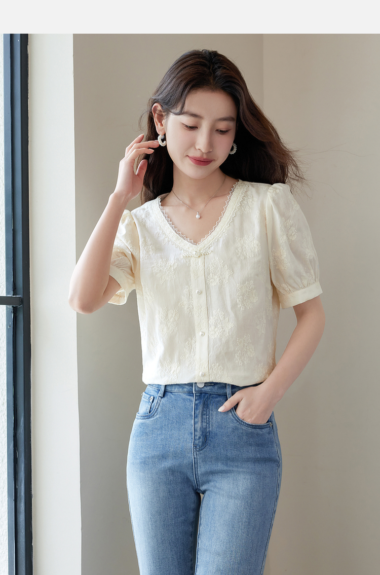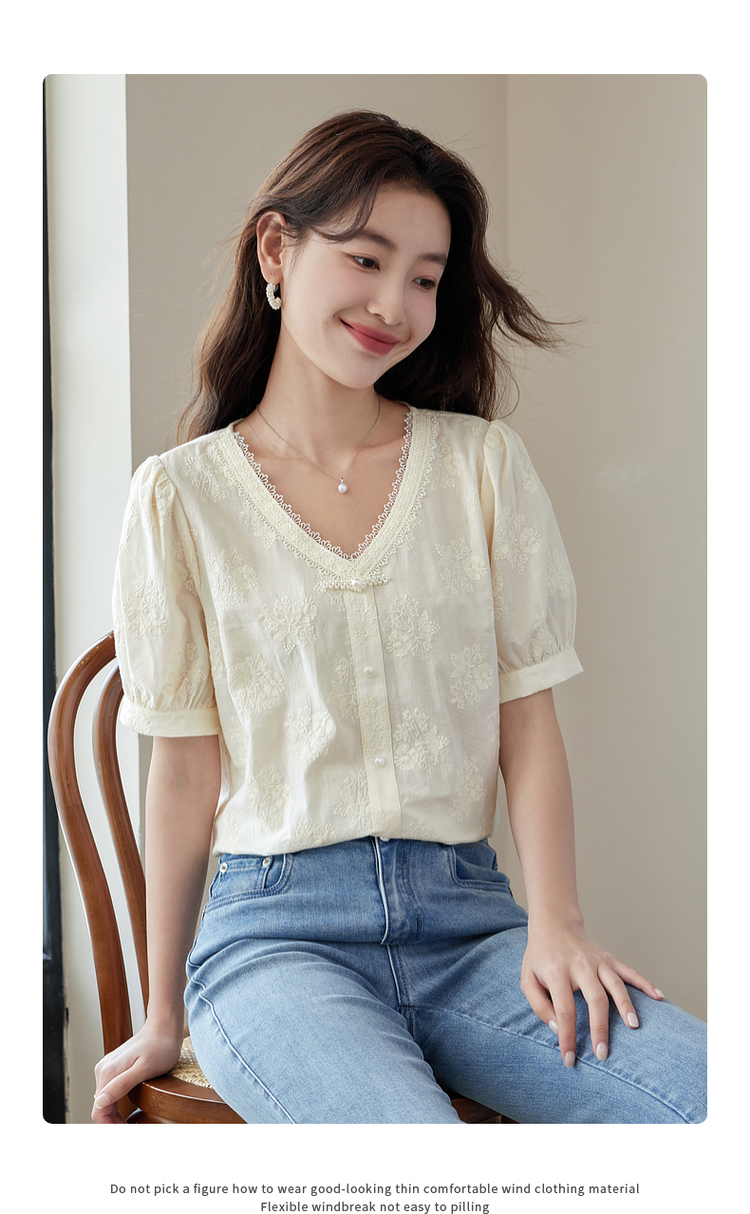【五折购】熙世界夏女装中式国风珍珠盘扣V领绣花雪纺衬衫泡泡袖纯棉上衣