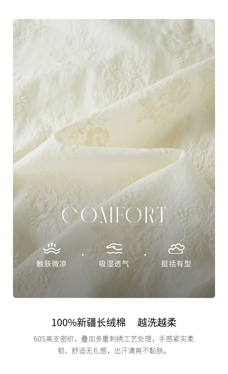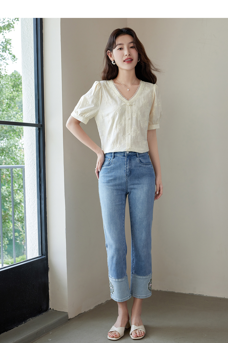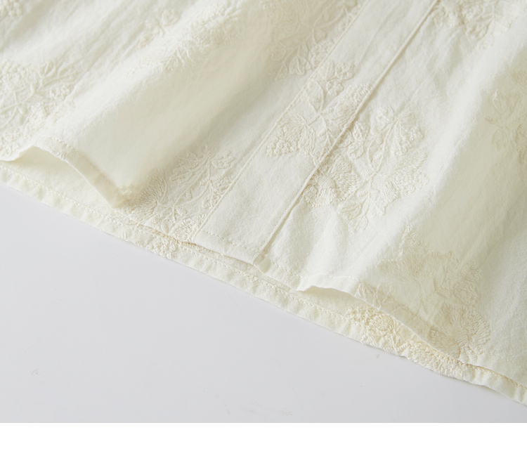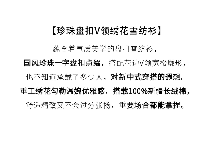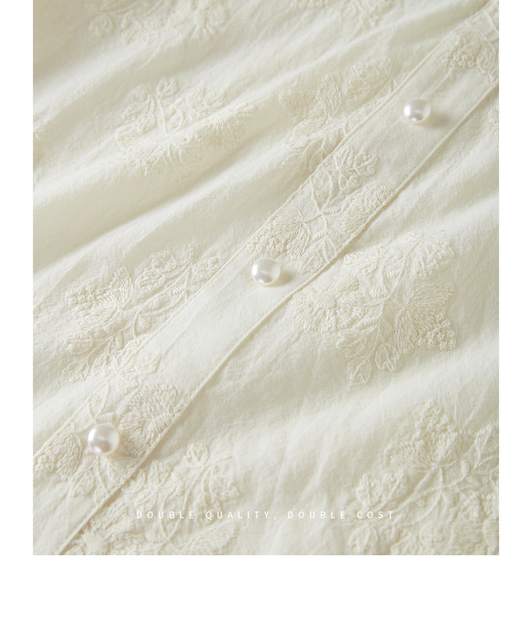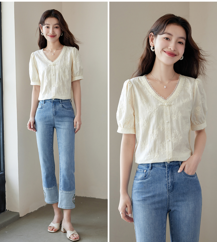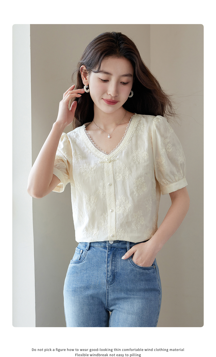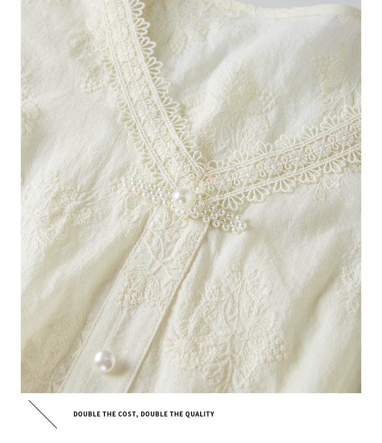 【五折购】熙世界夏女装中式国风珍珠盘扣V领绣花雪纺衬衫泡泡袖纯棉上衣