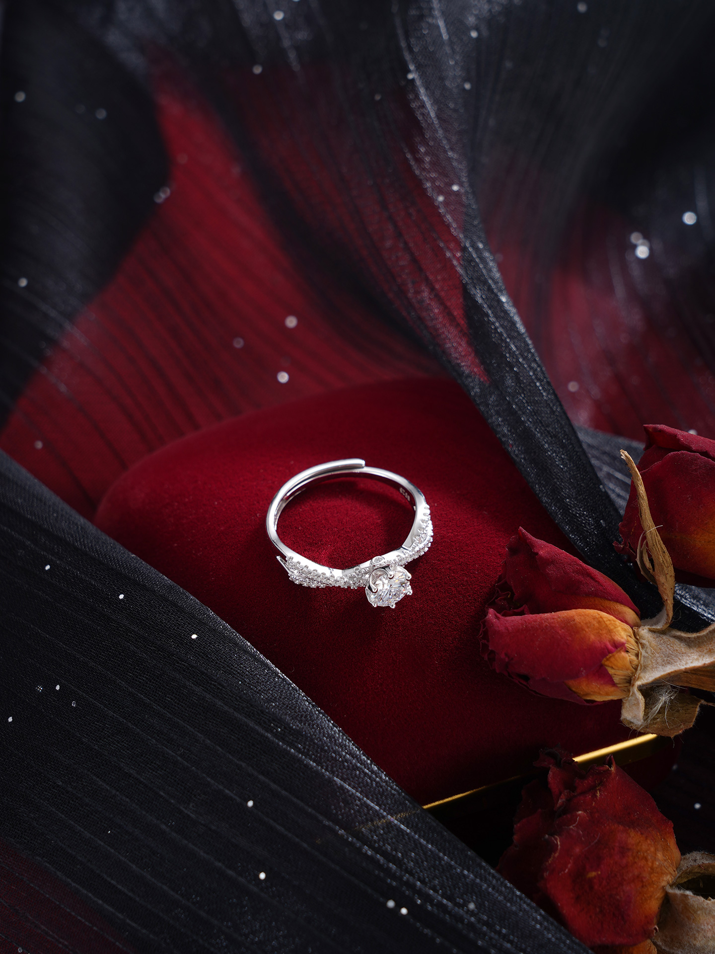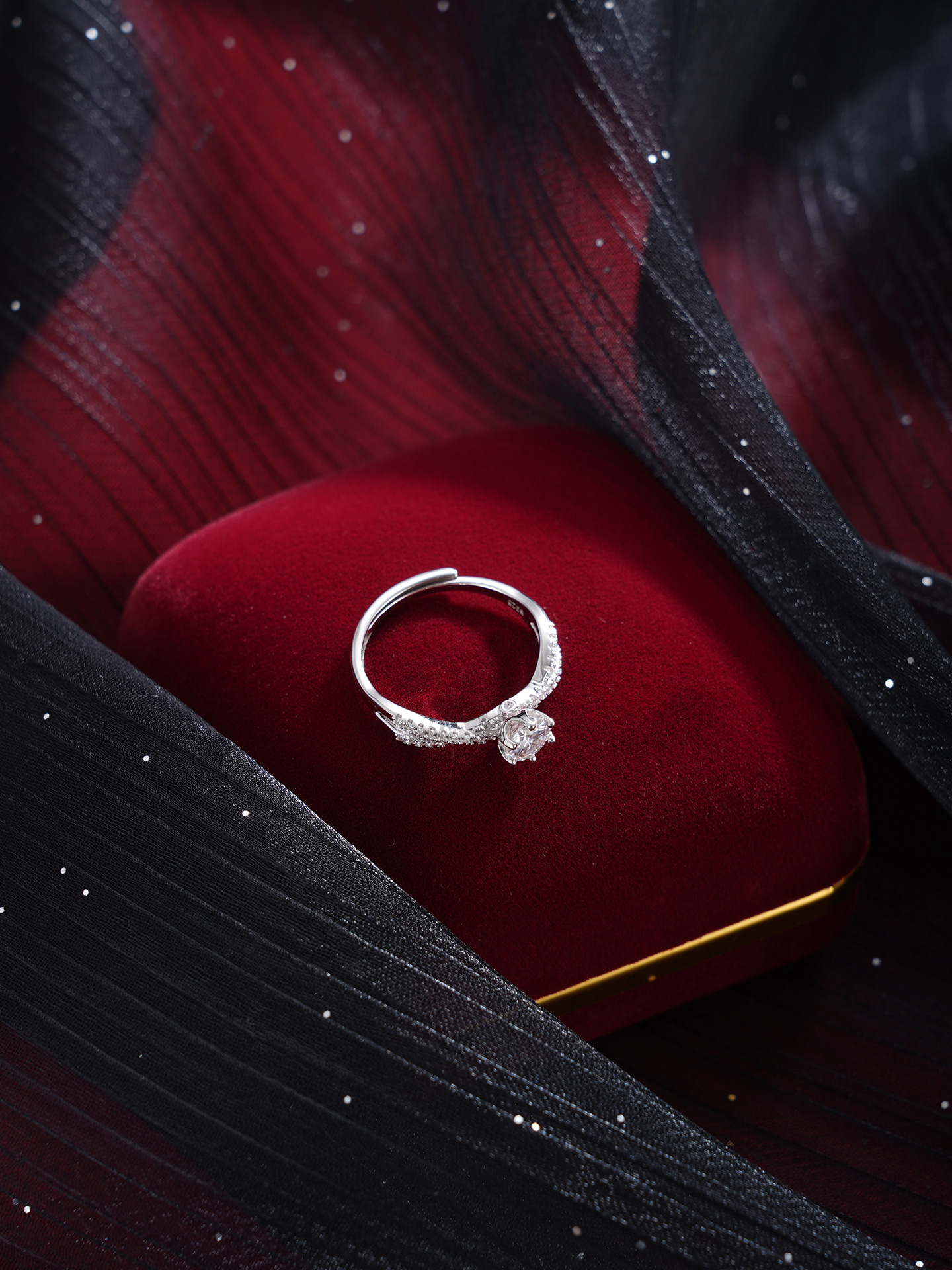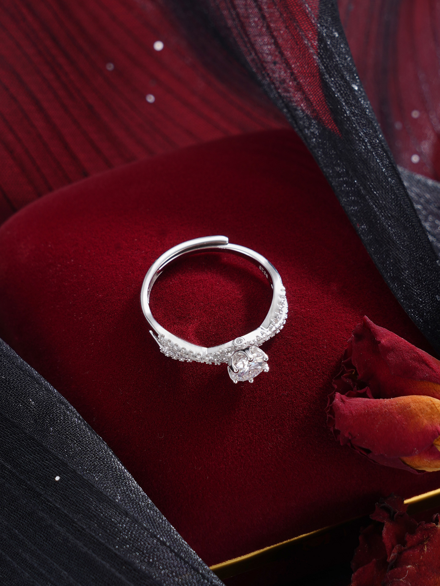 【寓意】:纯银戒指,融合锆石镶嵌工艺,搭配交织缠绵设计,象征相爱之人始终不离不弃,恩爱如初。