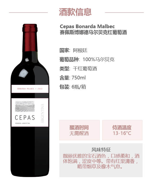阿根廷原瓶进口红酒 赛佩斯博娜德马尔贝克红葡萄酒 Cepas Bonarda Malbec 单支装750ml