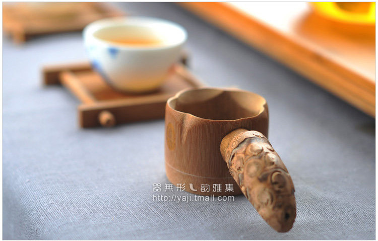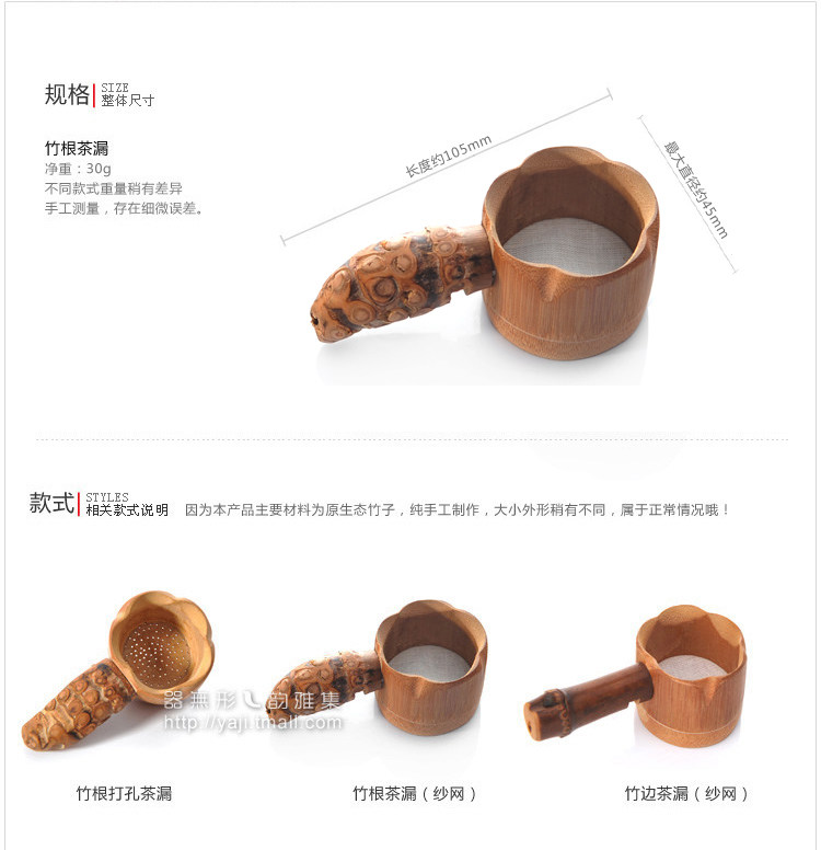 | 贤雅系列竹根茶漏 ------------ BE0116 浙江 纯手工制作 是 竹制 约30g 茶漏*1 图片为近距拍摄,具体参数请参考尺寸图 |
