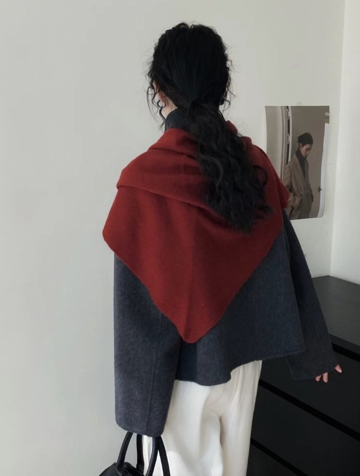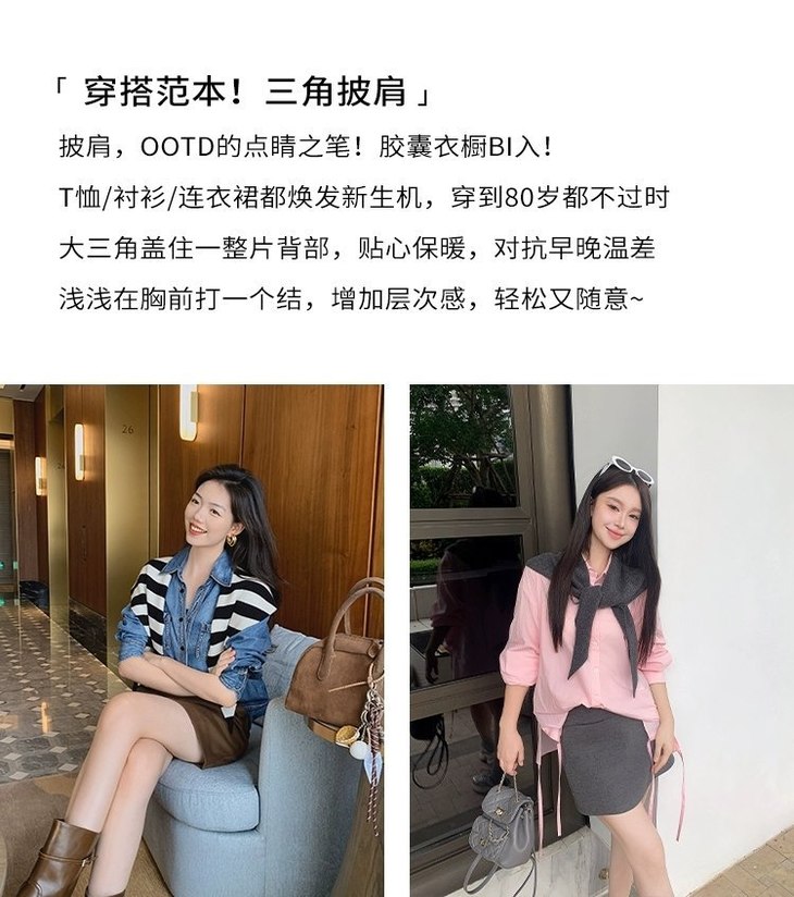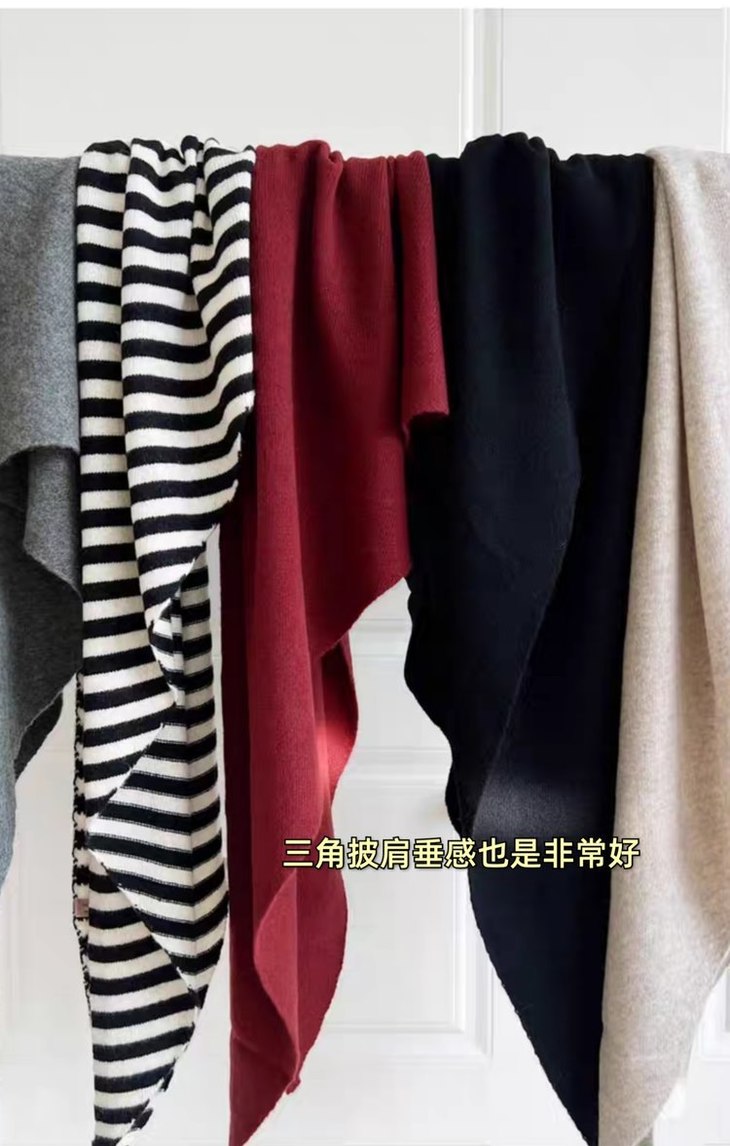 这款披肩是纯羊毛的哦,亲肤度爆表, 冬天披上它,仿佛被一团柔软的云朵包裹着,超级舒适! 而且它的设计超级时尚,三角形状既显瘦又显高,不管是叠搭在外套里面还是直接围在脖子上,都能成为整个穿搭的亮点! 保暖效果也是一级棒!在寒冷的冬天,它能够帮你抵御寒风,让你在室外也能保持温暖如春。 而且它的颜色超级多,无论是经典的纯色系,还是休闲的条纹系,总有一款是你的最爱! 而且它的性价比超高,这么一件高品质的羊毛披肩,价格却非常亲民,绝对是物超所值! 如果你也在寻找一款既保暖又时尚的秋冬单品,那么这款纯羊毛三角大披肩绝对是你的不二之选! 快来入手一件吧,让你的冬天变得更加温暖又时尚!