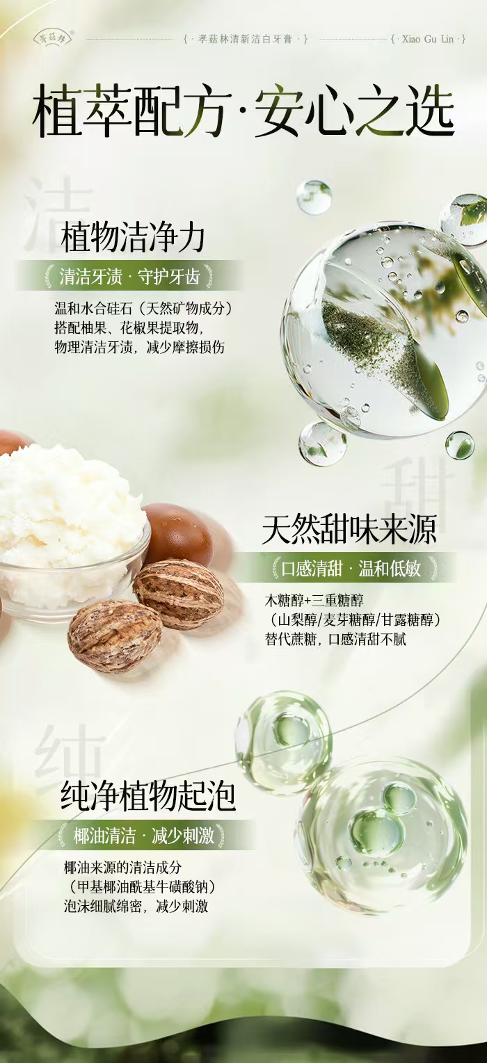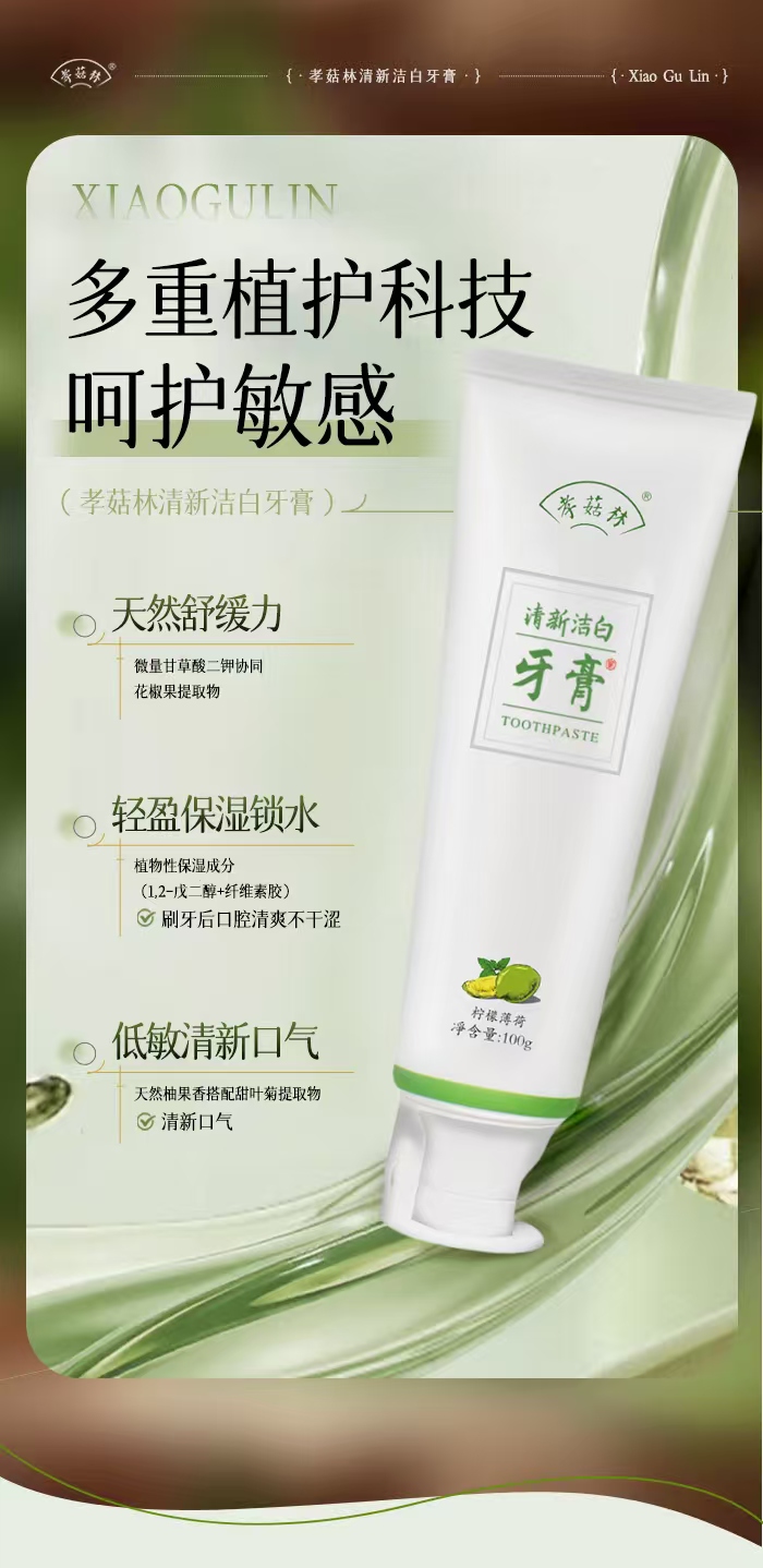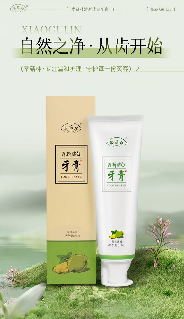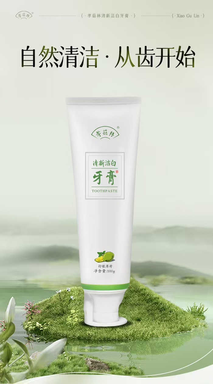 孝菇林清新洁白牙膏| 纯素洗护、泡沫绵密不辣口、温和清洁牙齿清新口气