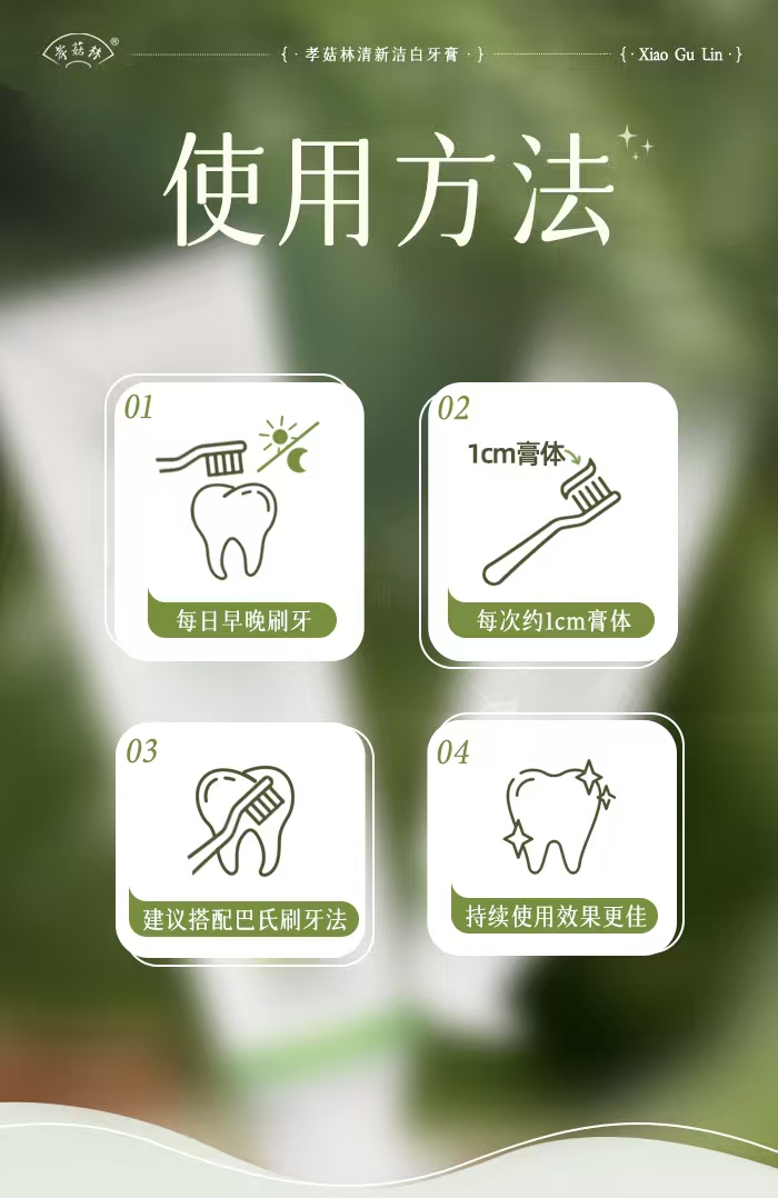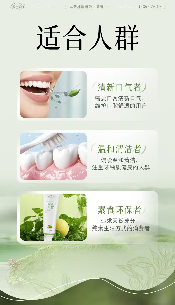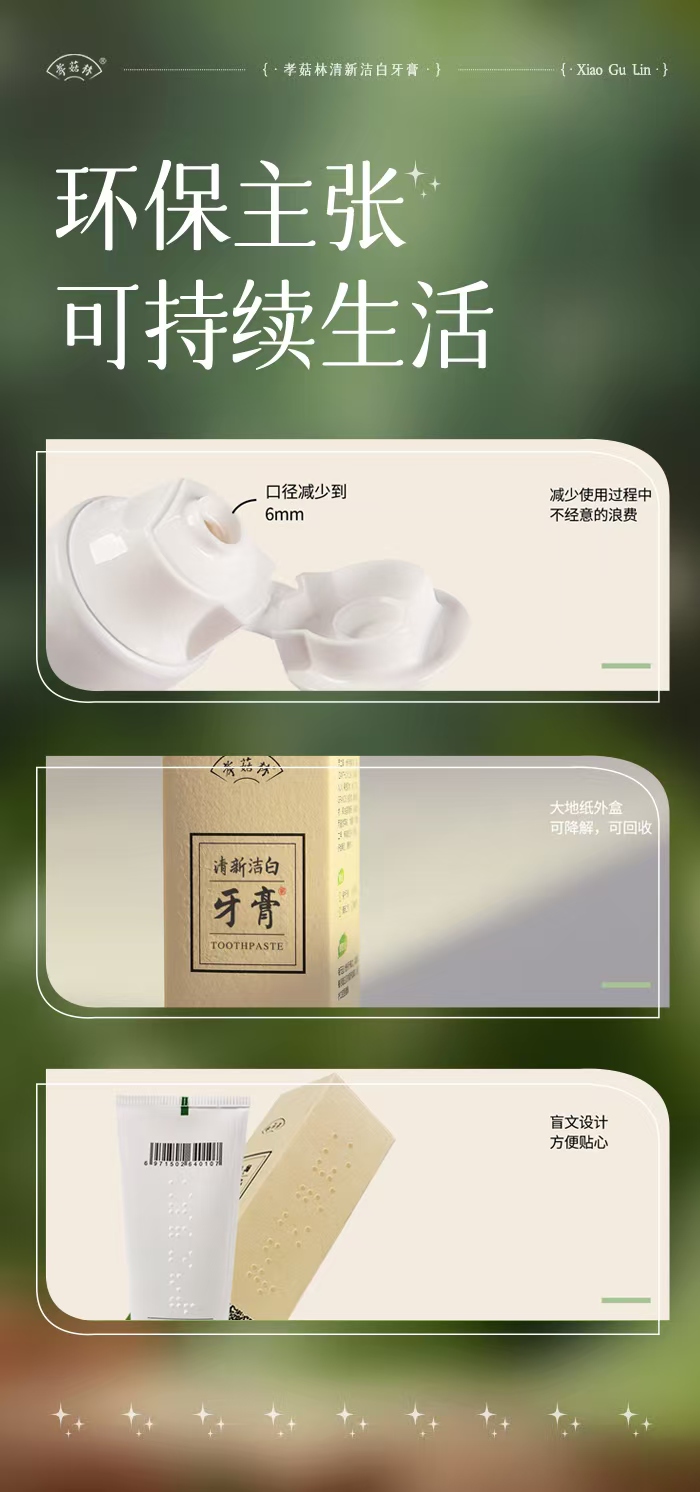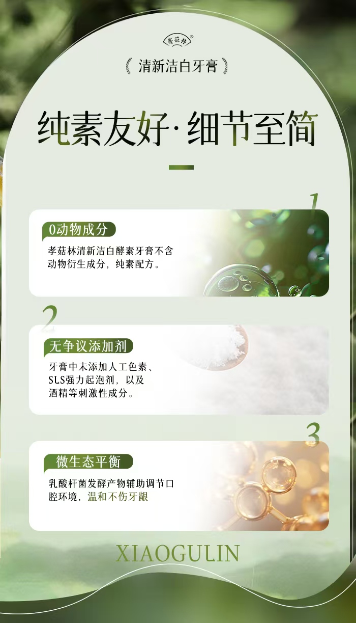 孝菇林清新洁白牙膏| 纯素洗护、泡沫绵密不辣口、温和清洁牙齿清新口气