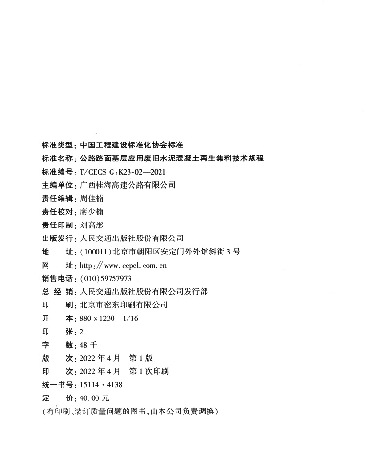 书名:公路路面基层应用废旧水泥混凝土再生集料技术规程(T/CECS G:K23-02—2021)