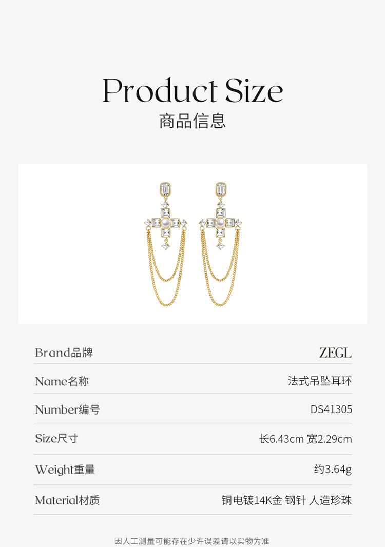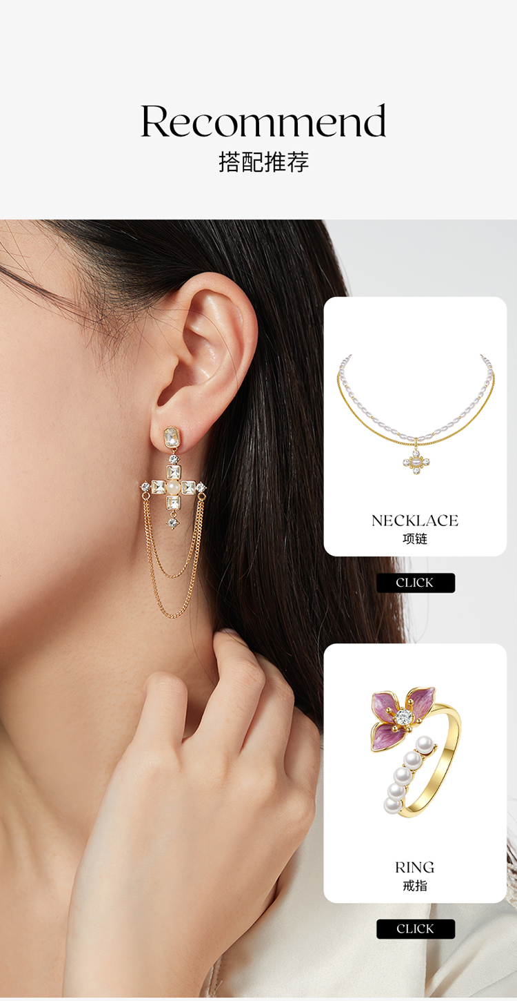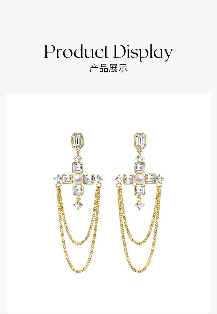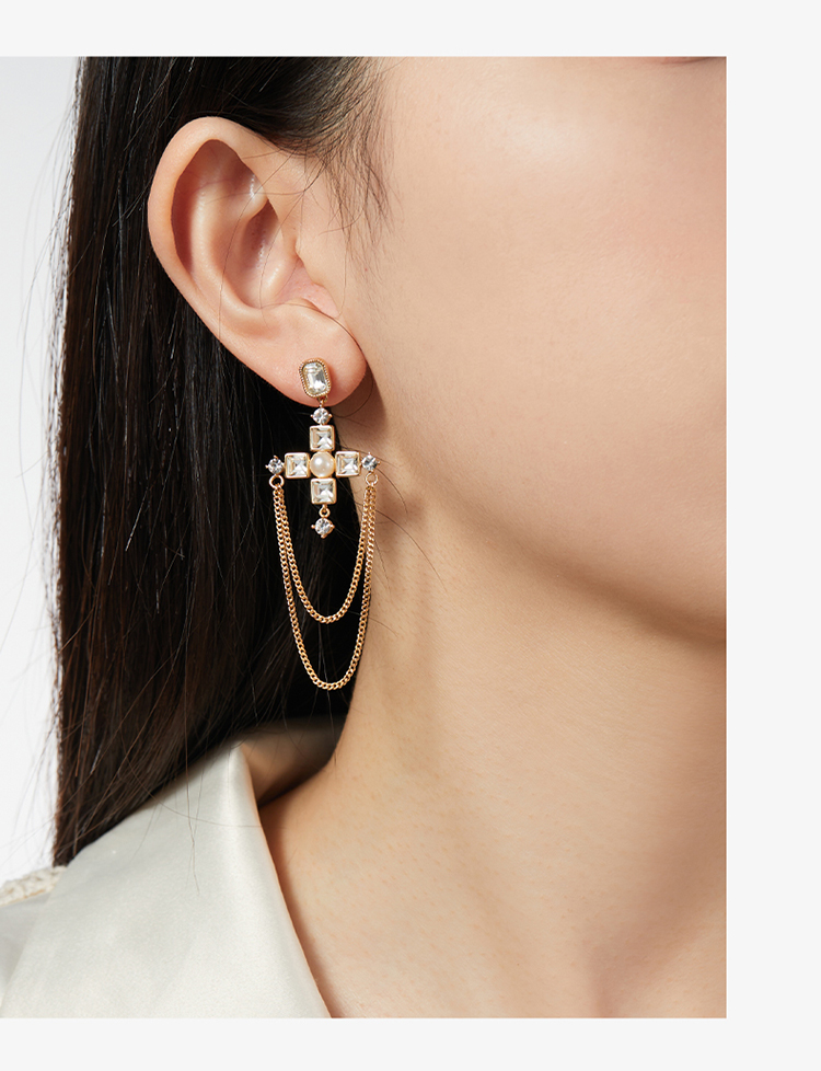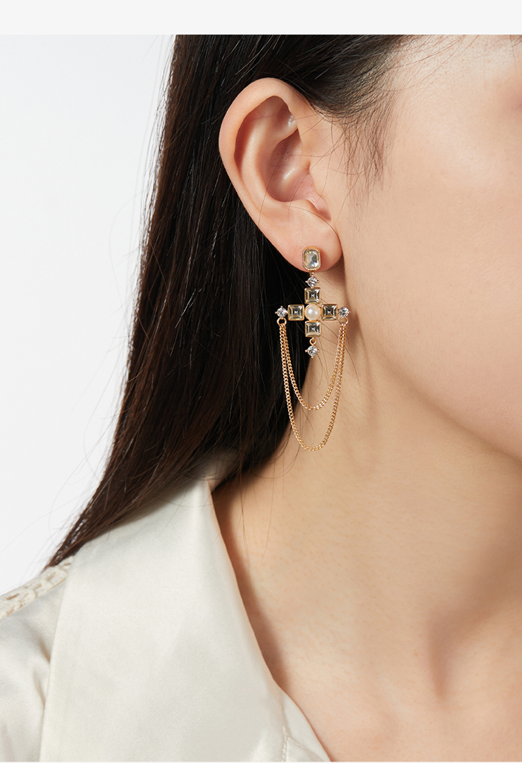 ZEGL设计师法式十字架系列流苏仿珍珠耳环女复古耳钉气质银针耳饰