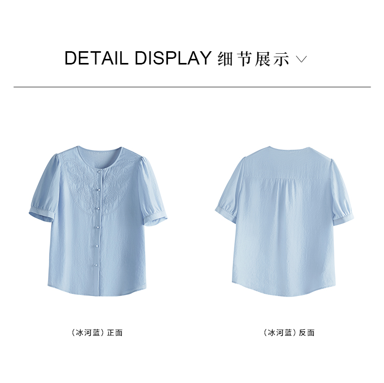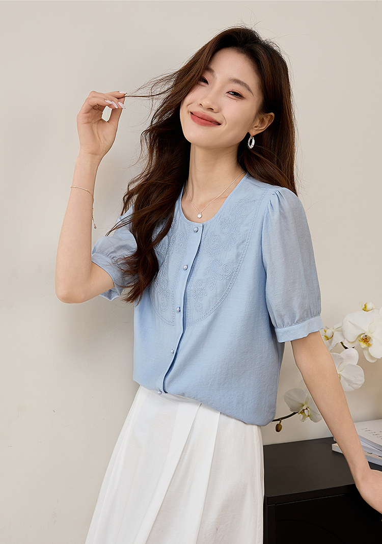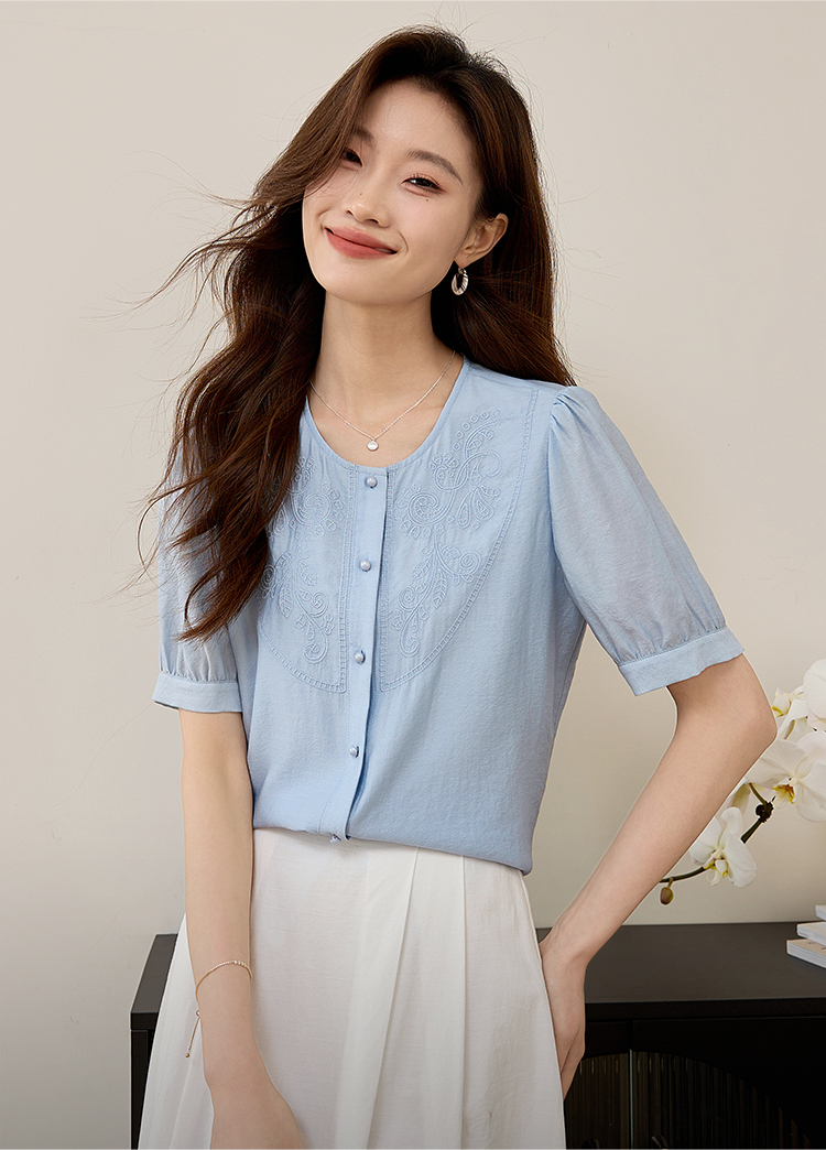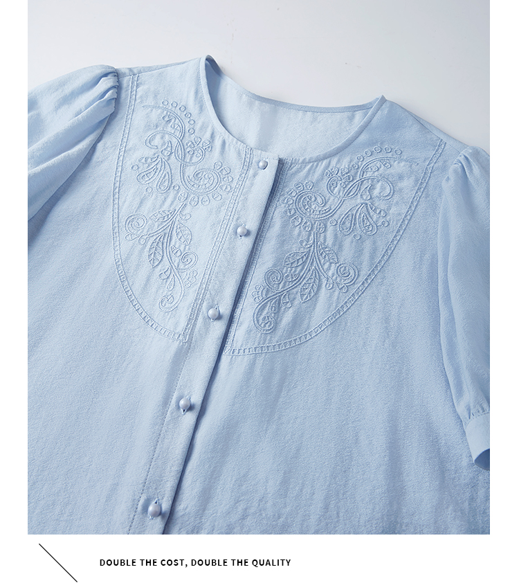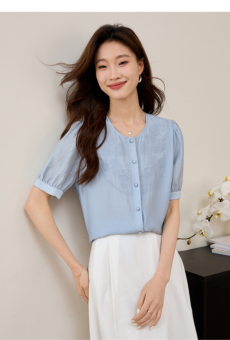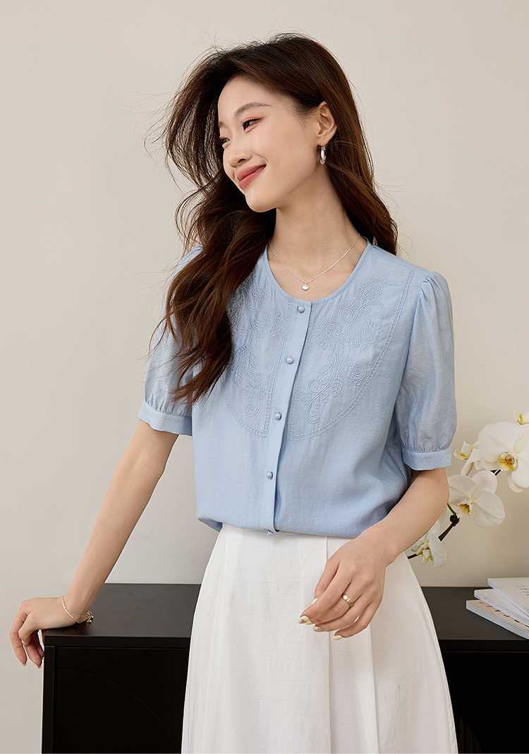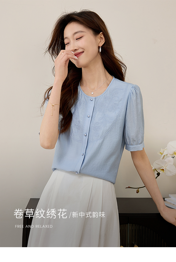 【五折购】熙世界轻国风刺绣醋酸衬衫女2025夏装新款泡泡袖新中式衬衣上衣