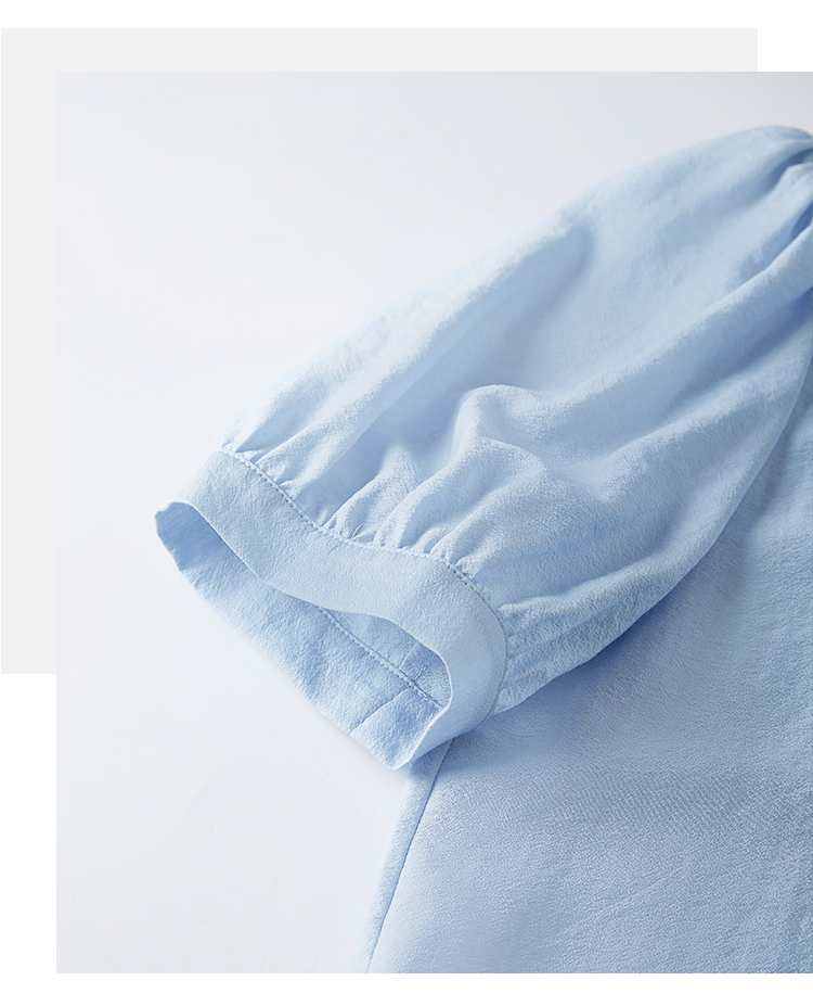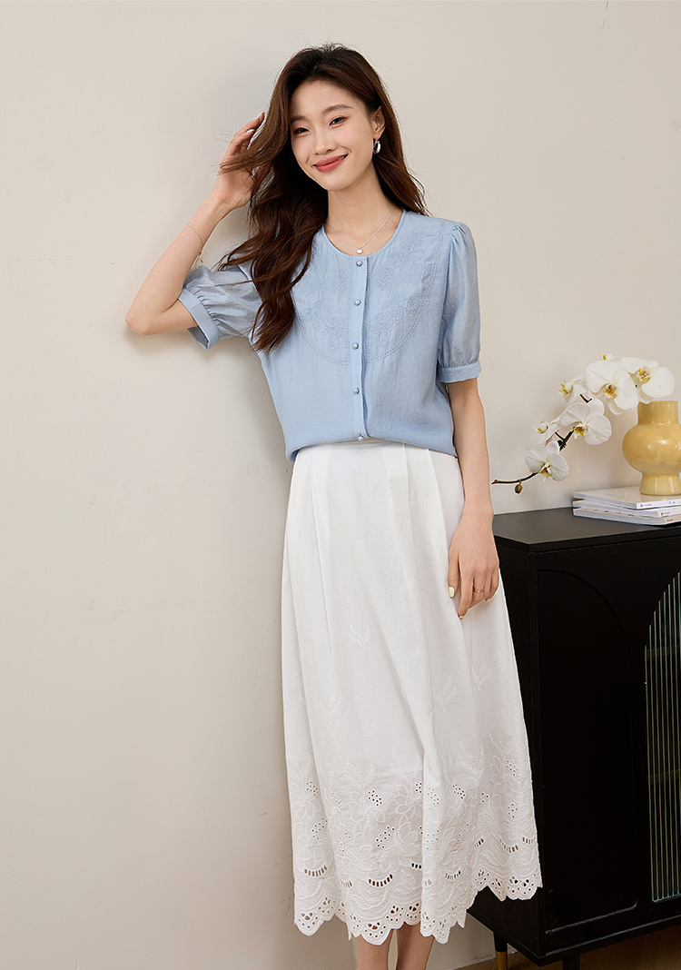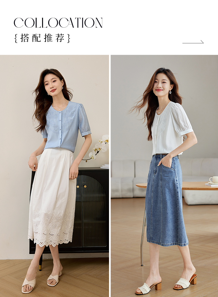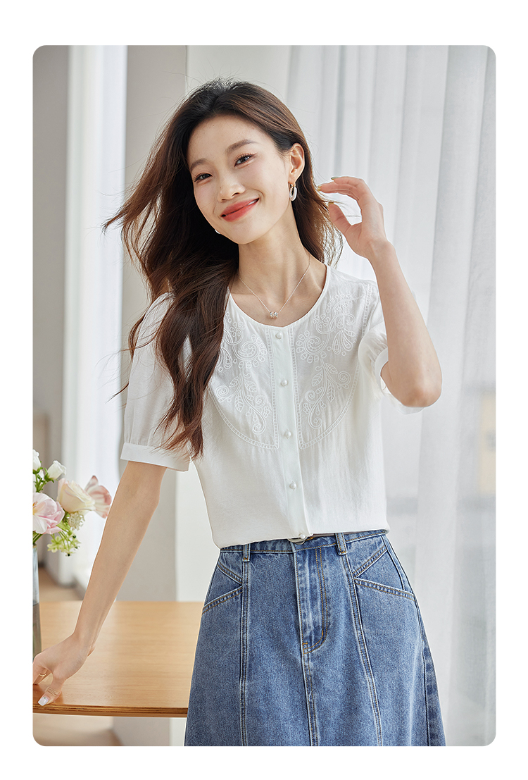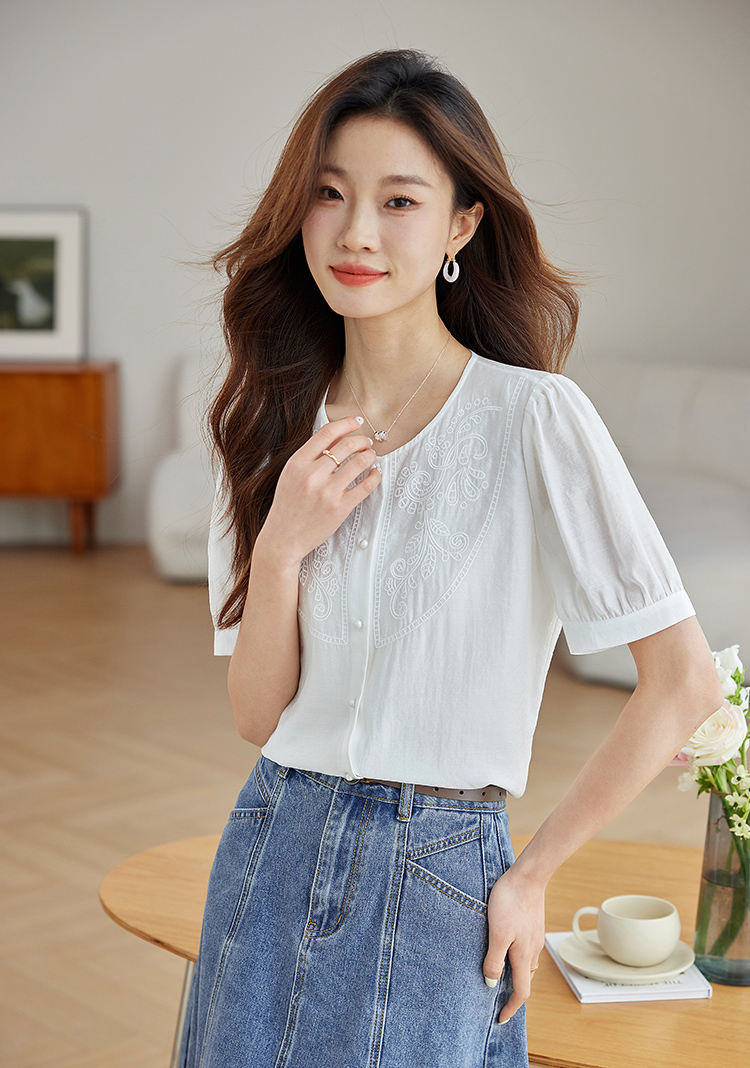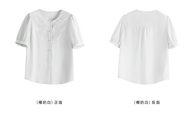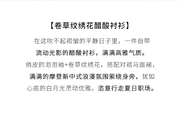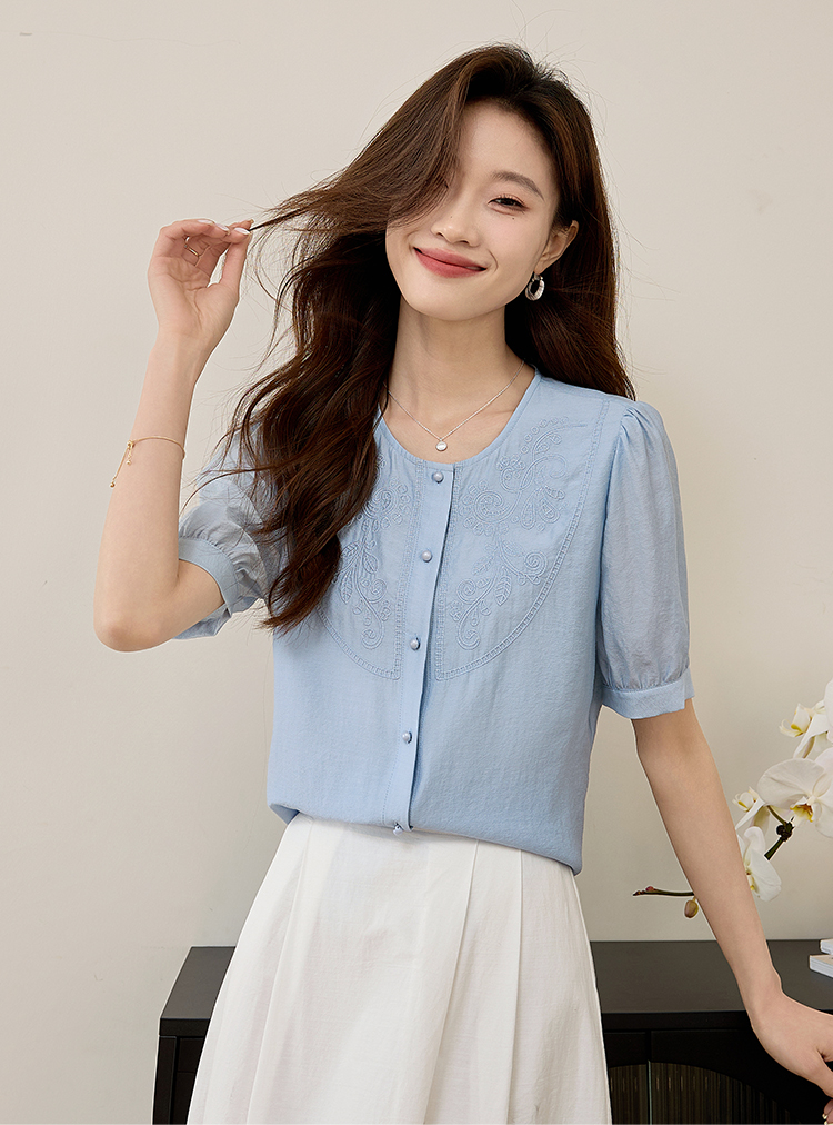 【五折购】熙世界轻国风刺绣醋酸衬衫女2025夏装新款泡泡袖新中式衬衣上衣