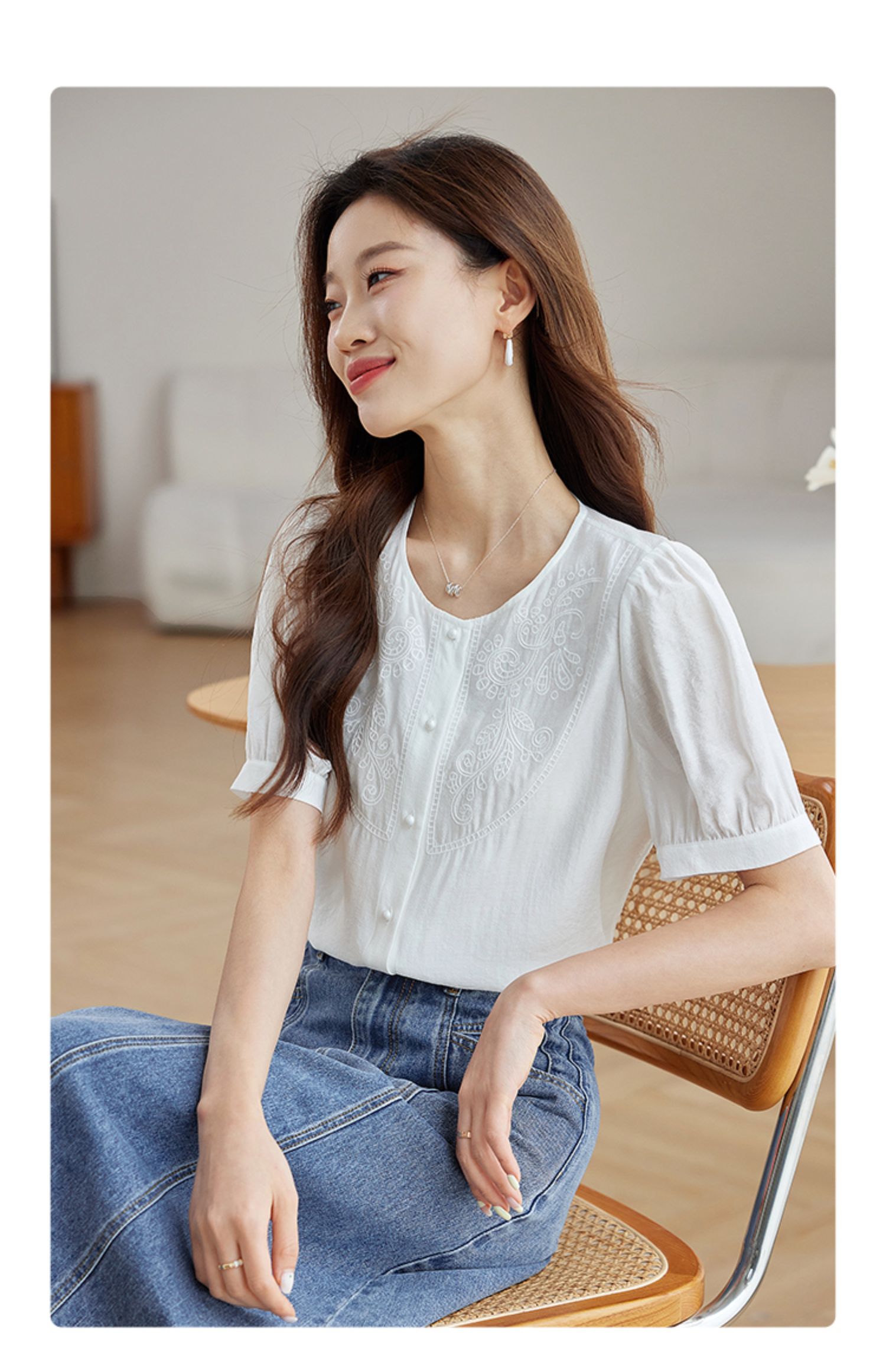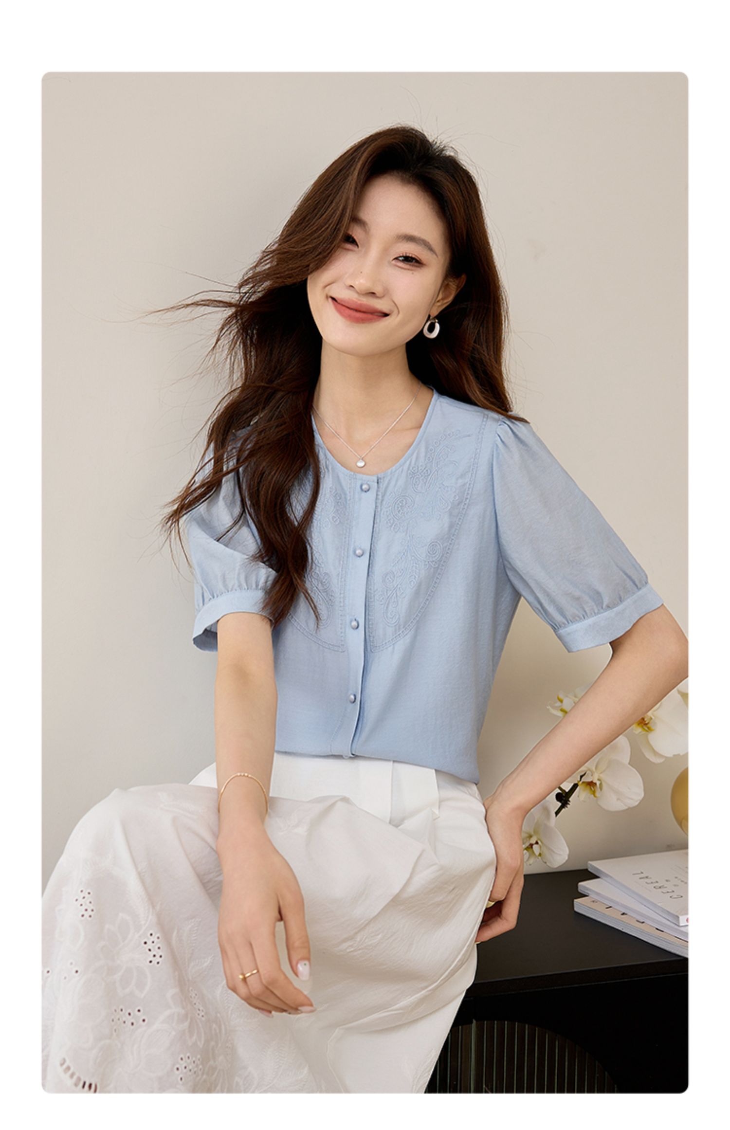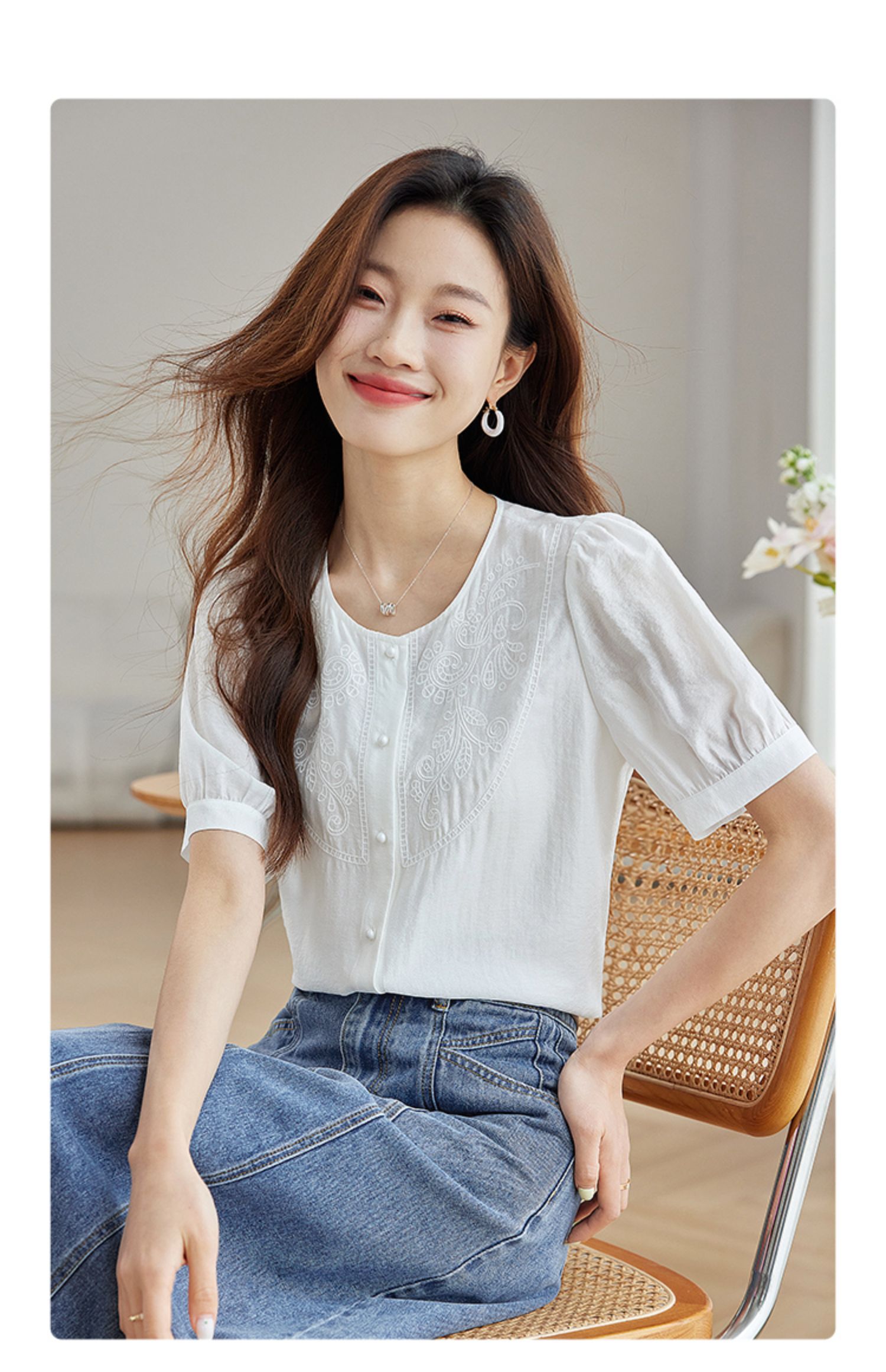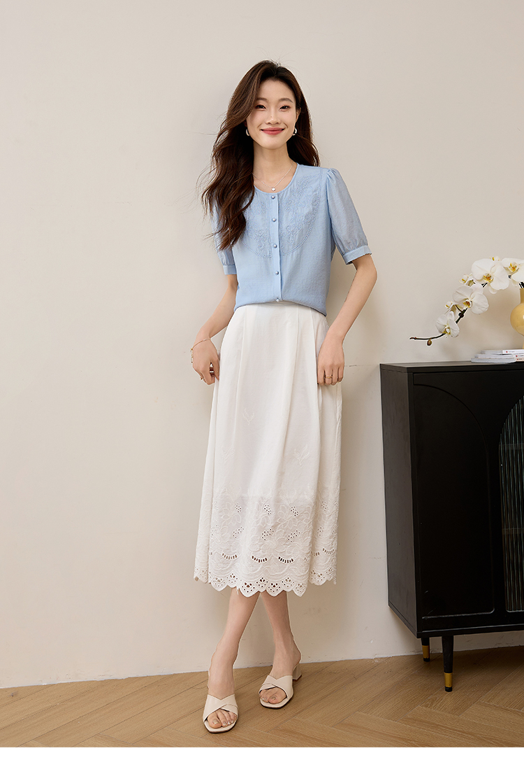 【五折购】熙世界轻国风刺绣醋酸衬衫女2025夏装新款泡泡袖新中式衬衣上衣