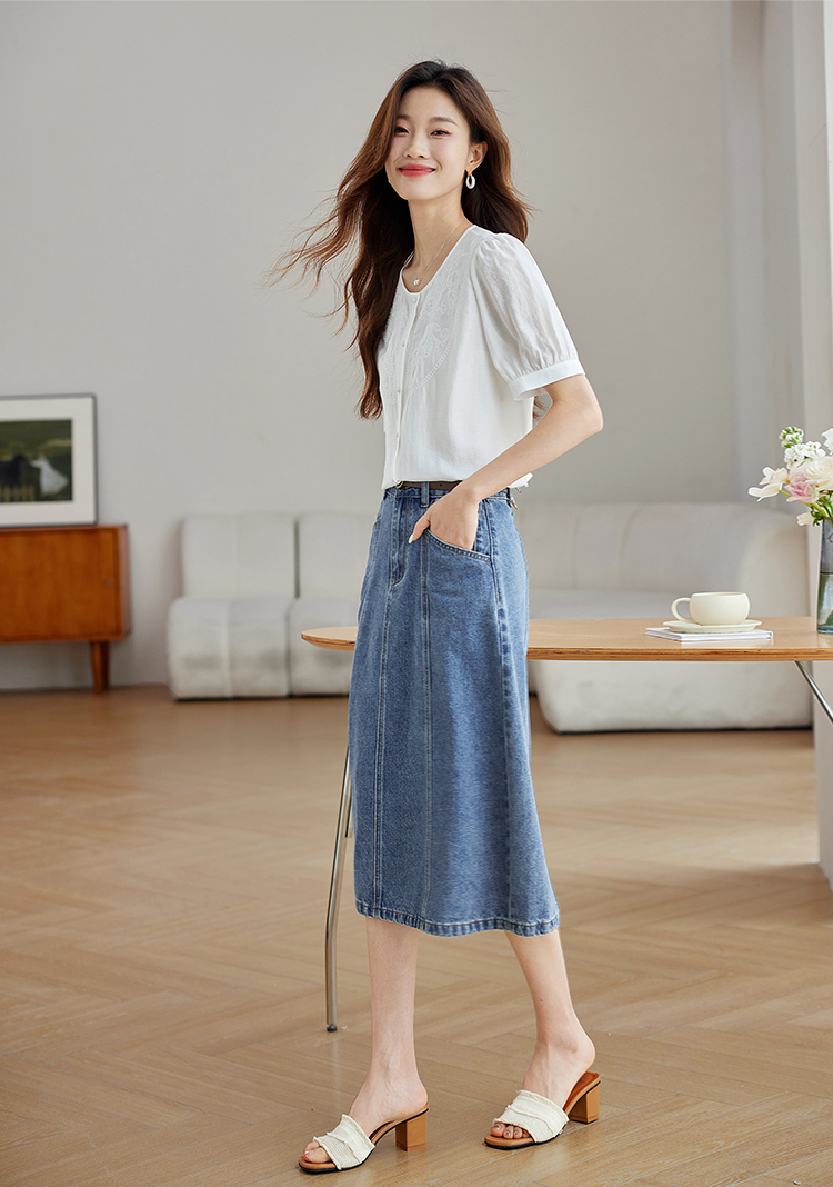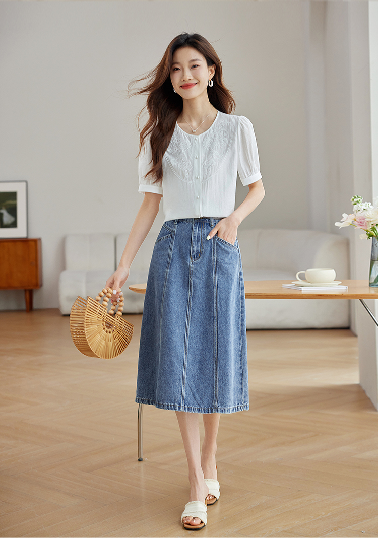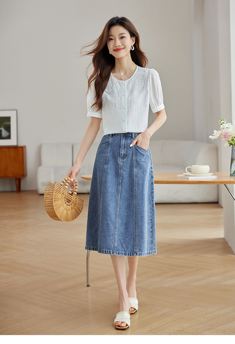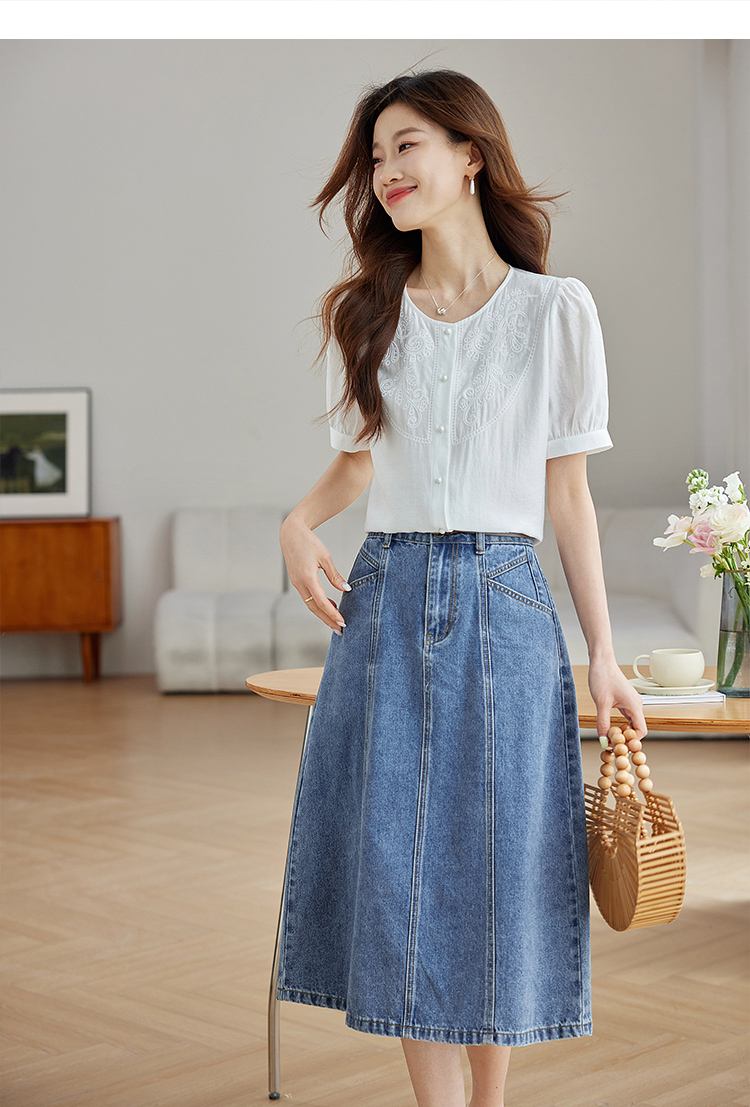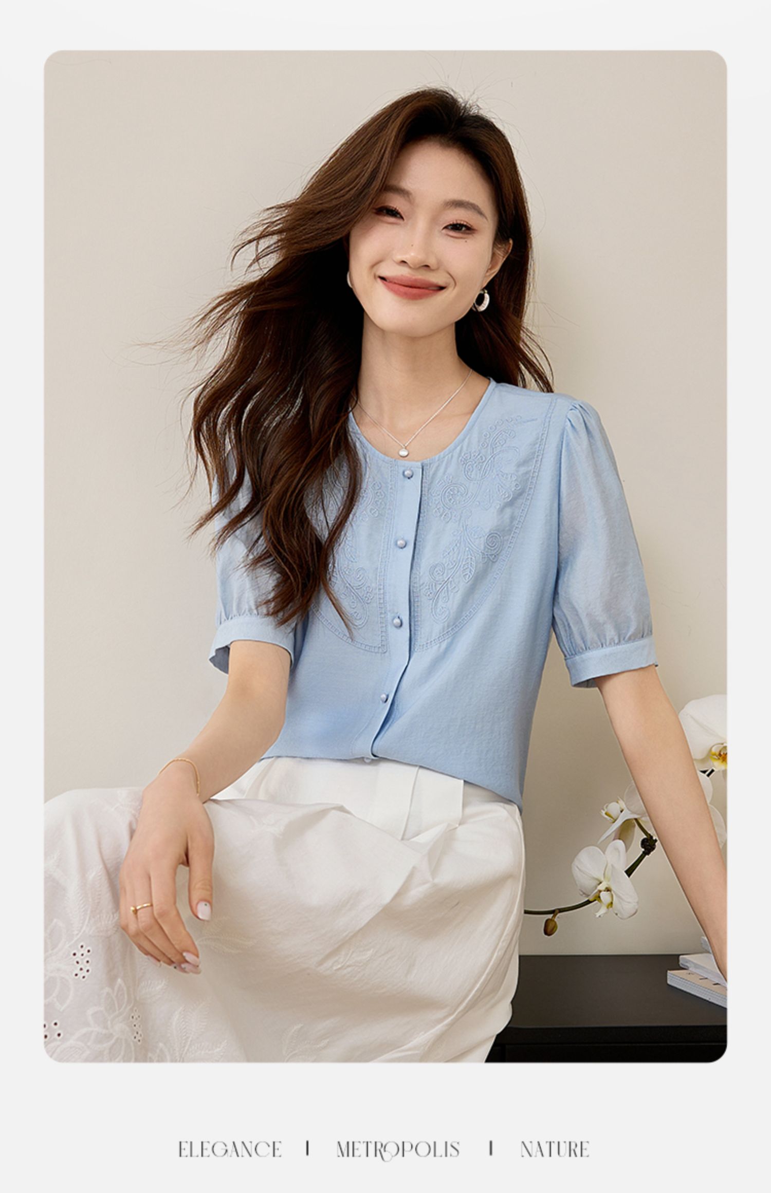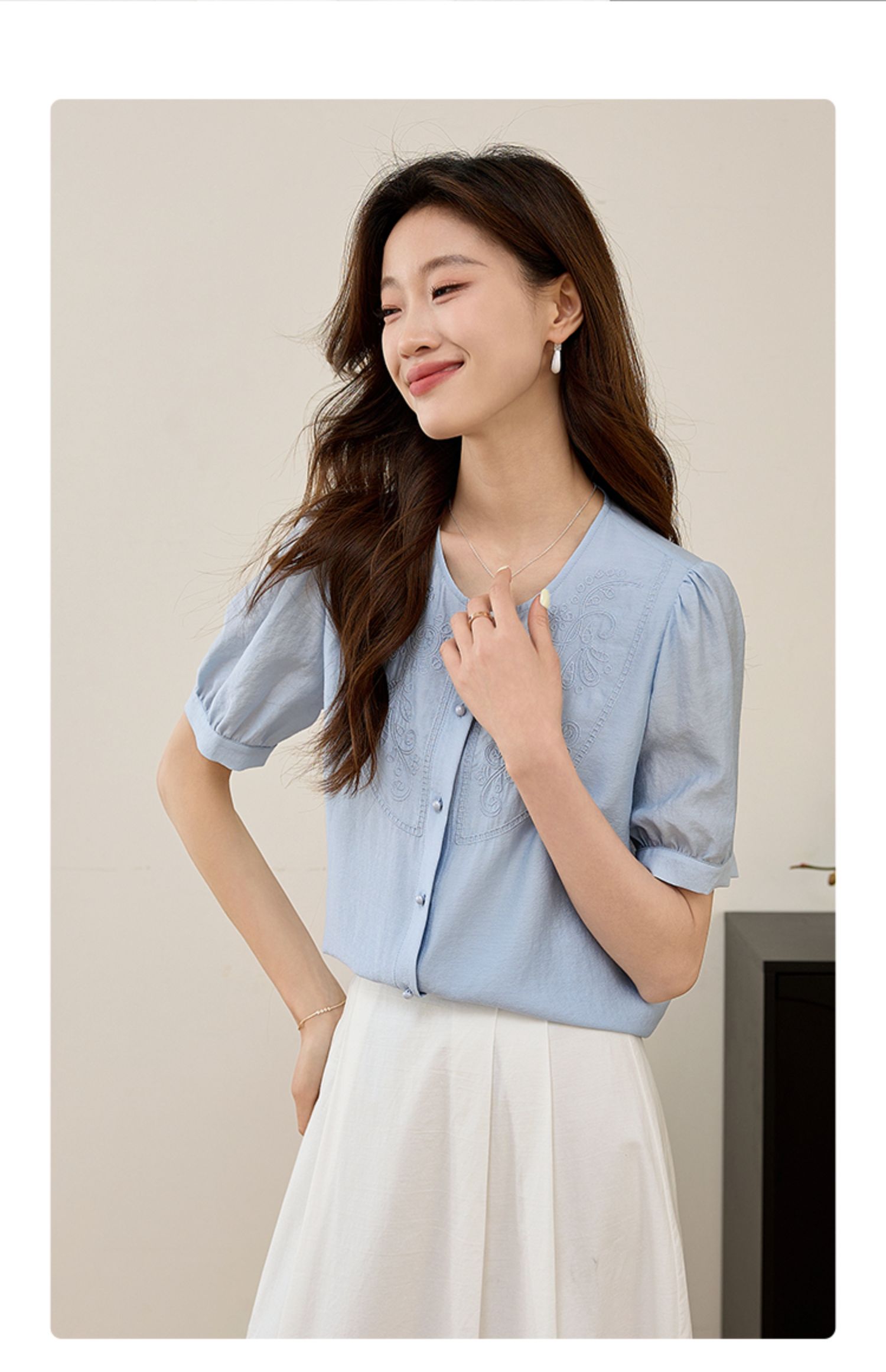 【五折购】熙世界轻国风刺绣醋酸衬衫女2025夏装新款泡泡袖新中式衬衣上衣