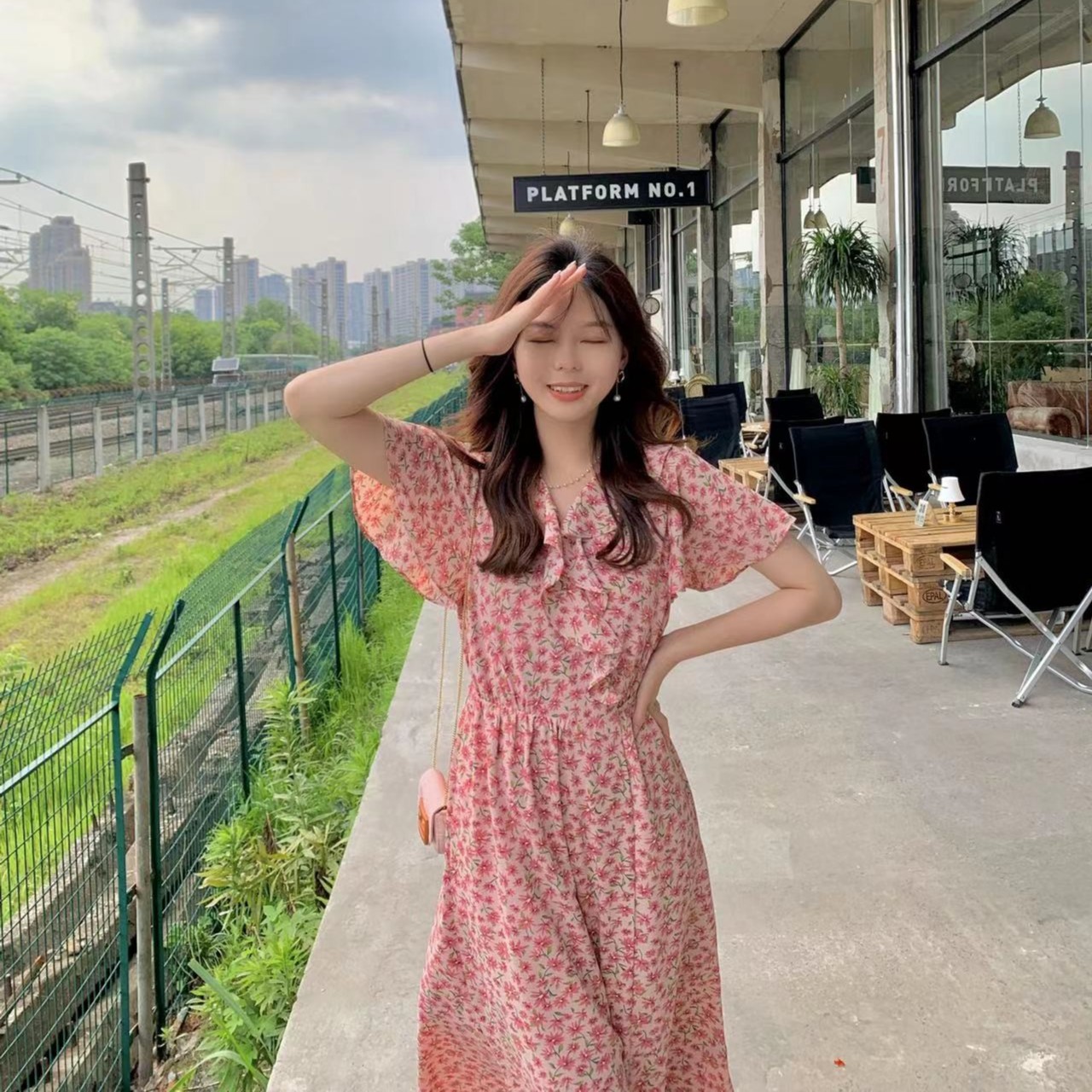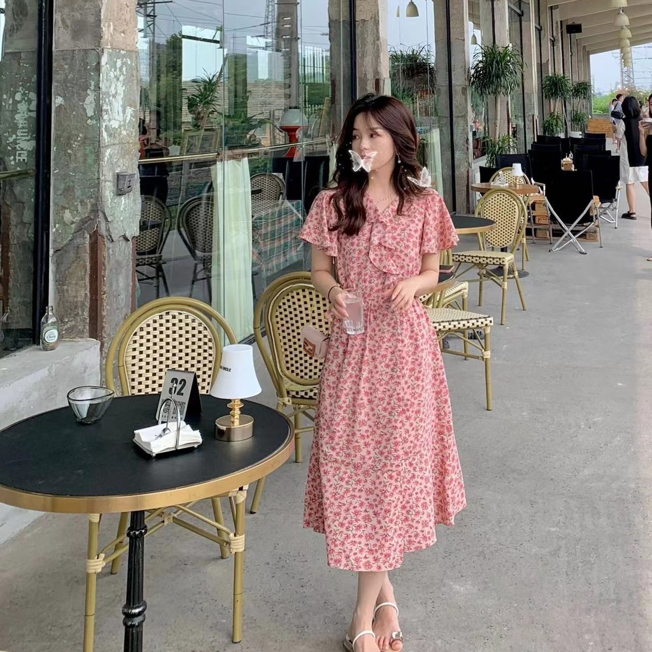 【弗洛花室】腰部绑带设计!v领荷叶边碎花连衣裙