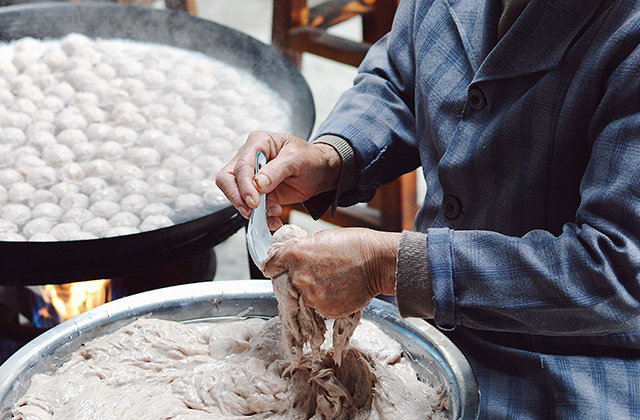 坊中洗净跺泥,手工挤丸制肠,一气呵成!今天推荐三款:五福鱼丸;墨鱼肠;虾肠