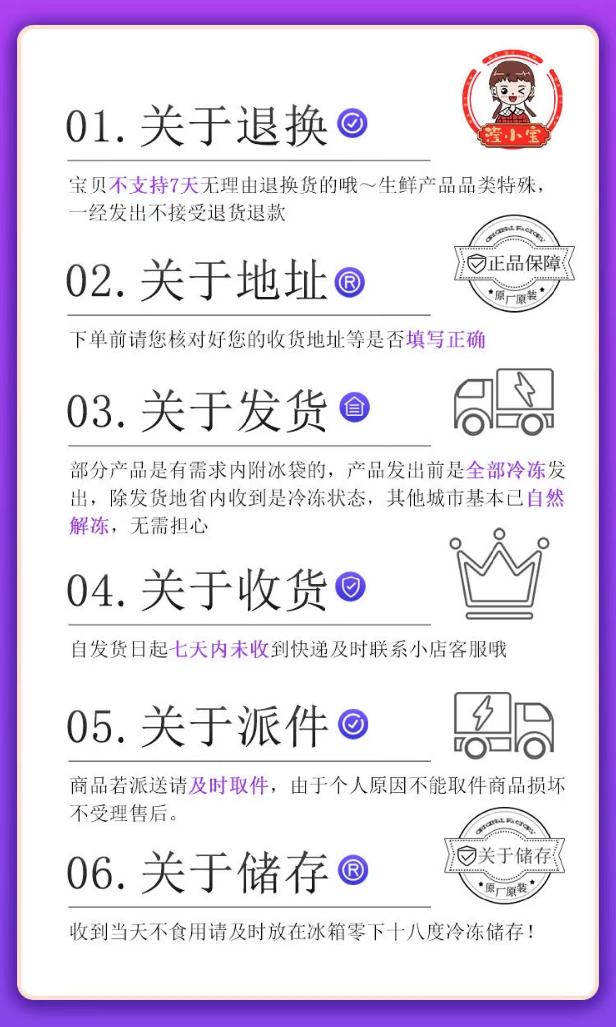 【发货快递】:中通 【运费政策】:新疆、西藏、内蒙、海南、青海、云南、宁夏、甘肃不发货 【发货地】:山东烟台 【发货时效】:48小时内,特殊情况及节假日提前通知 【售后政策】:1. 冷冻食品不支持7天无理由!!食品拒收无售后! ! !签收24小时后无售后! ! ! 2.签收24小时之内将问题产品连同快递箱上的快递面单一同拍照反馈,我们会在第一时间赔付(申请售后,必须提供售后标准照片,不按要求提供,不售后;不支持聊天记录截图) 3.特别强调!!因收件人个人原因(电话号填错、地址填错、不详细等,打电话不接,发信息不回等,导致派件员联系不到买家)无法正常派送或快件退回的,不做售后赔付!!! 【注】: 1.下单后72小时内发货,出单号后不支持退单!出单号后不可更改地址!地址不详电话错误等导致派件失败退回的做弃件处理不售后! 2.不甜、不香、不好吃等个人癖好,不售后。 3.如因客户未及时签收导致的商品质量问题,暂不支持退换(如果不是立即食用,放冰箱冷冻保存,时间可以放300天)