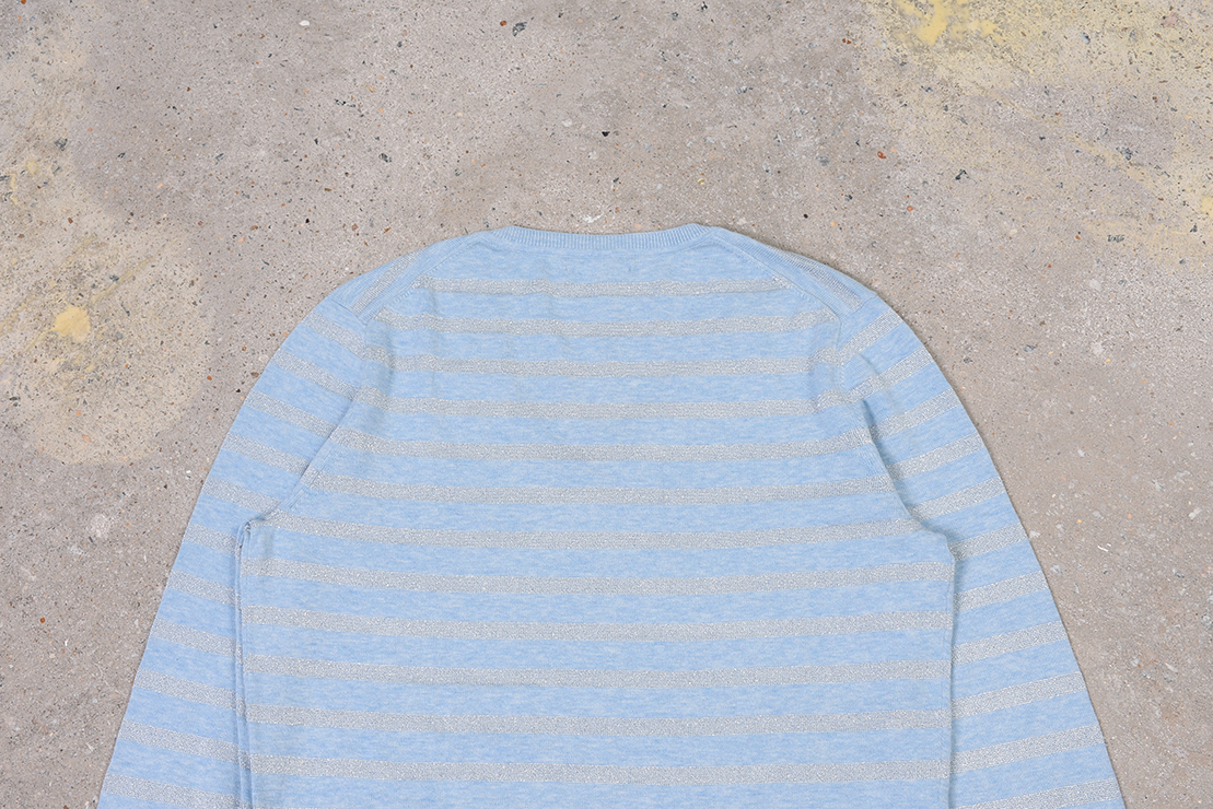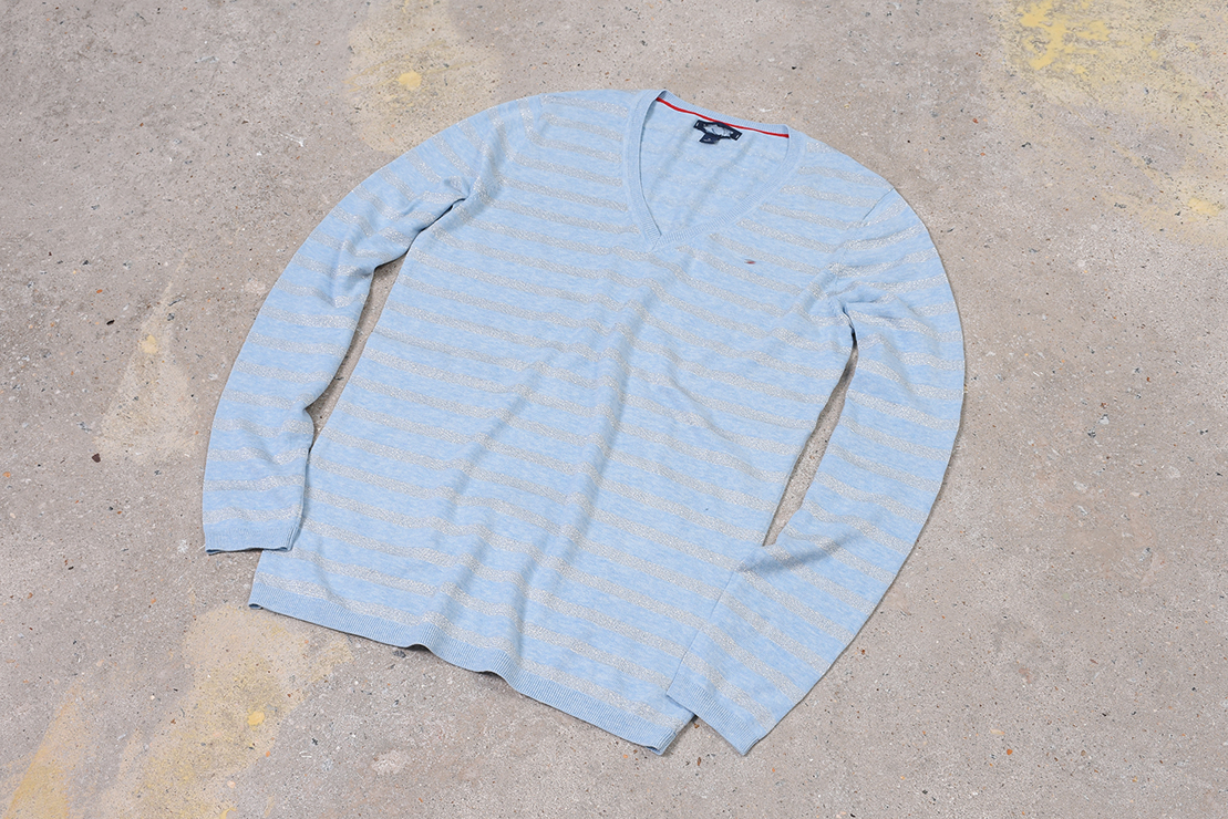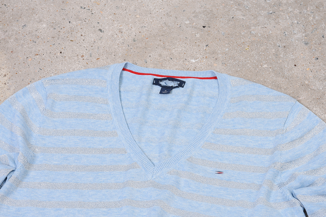 男款横纹V领毛衣!秋冬薄款!无成份标,棉质金属混纺。部分领标不同,部分码数标错码(按实现尺寸发货),领标剪标或无领标,洗标剪标,棉质面料手感非常舒适!胸前精致刺绣。衬衫百搭!