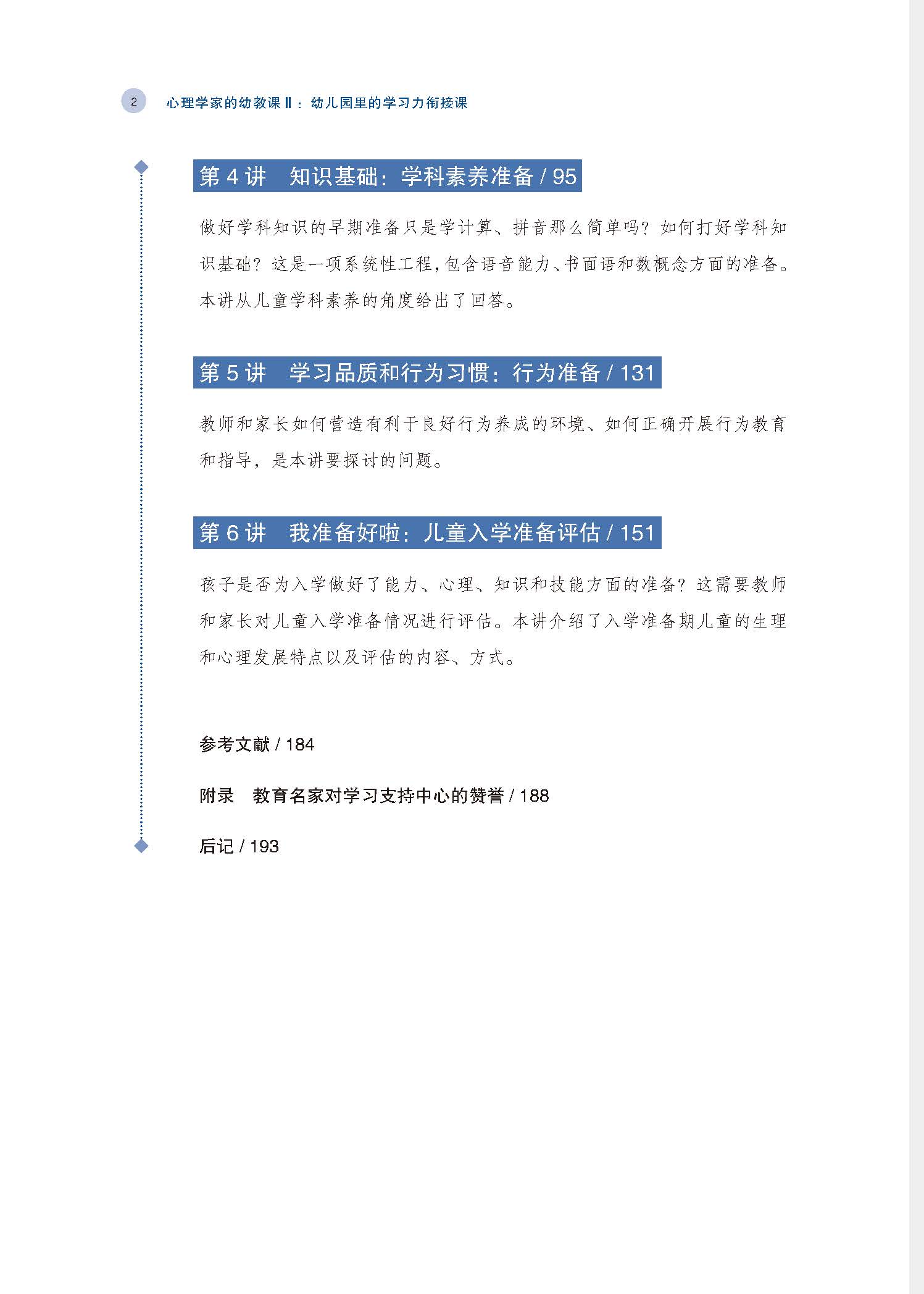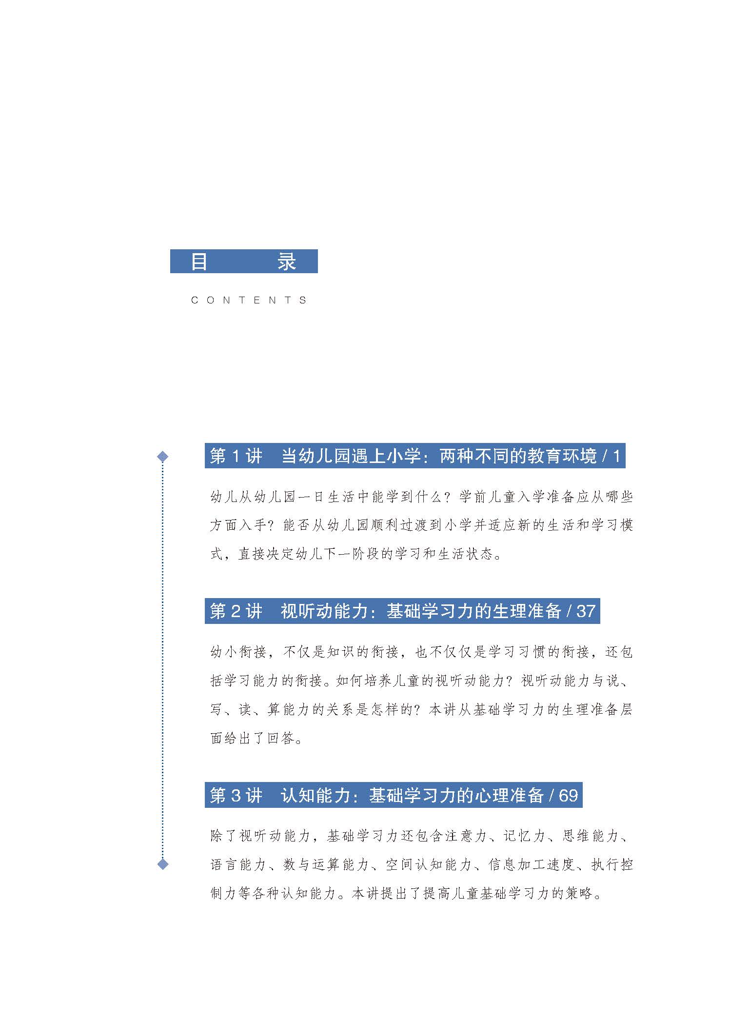 如何理解“零入学”?如何解答教师、家长面对的现实教育困惑?如何理解与实现小学与幼儿园的“科学双向衔接”?本书主编赵微教授与一线教育从业者从心理学和幼小教学实践中遇到的问题出发,提出“零入学”不等于“零准备”。从幼儿园向小学的过渡过程中,不仅仅要做好学习习惯的准备,更应该帮助孩子形成“基础学习力”,完成认知能力的准备。本书聚焦于学前儿童的入学准备教育,既包含儿童心理发展的理论解释,又汲取了学前教育工作者丰富的教育实践经验,列举了生动且真实的案例,为幼小衔接阶段的教学提供了具体可行的教育建议。