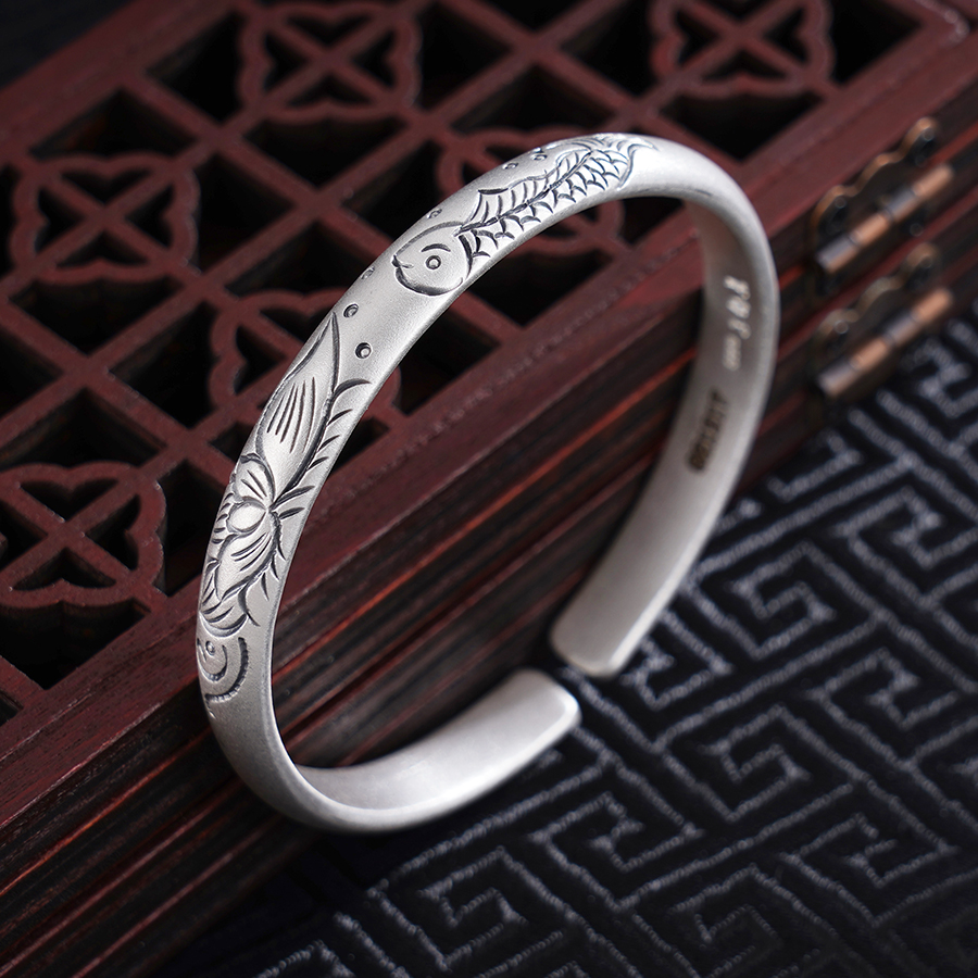 【寓意】:纯银开口手镯,镯面錾刻游鱼戏莲之景。寓意好运连连,吉庆有余。