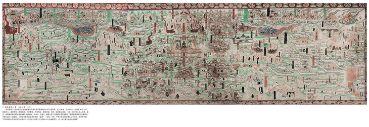 五台山图”是一幅难得的佛教史跡画,如 《敦煌莫高窟艺术 第61窟》书中所说,它保存了大量佛教历史资料,有的还补充了史书所未载 的内容。图中提供了大量古代佛教建筑(寺院、兰若、草菴、佛塔等)、高僧说法、信徒巡礼、著名史跡和灵異现象等,共有榜题 195 条。此外,“五台山图”还呈现了许多古代社会生活民俗场 面。图的下部描绘了从山西太原到河北镇州(今河北省正定县)的山川道路和旅行、送供、拜佛者, 看到不同身份各阶层的人物服饰和活动场面。“五台山图”也是一幅大型的山水画。它以山水串联各个独立画面,从中可以见到五代时期敦煌山水 画的风格。