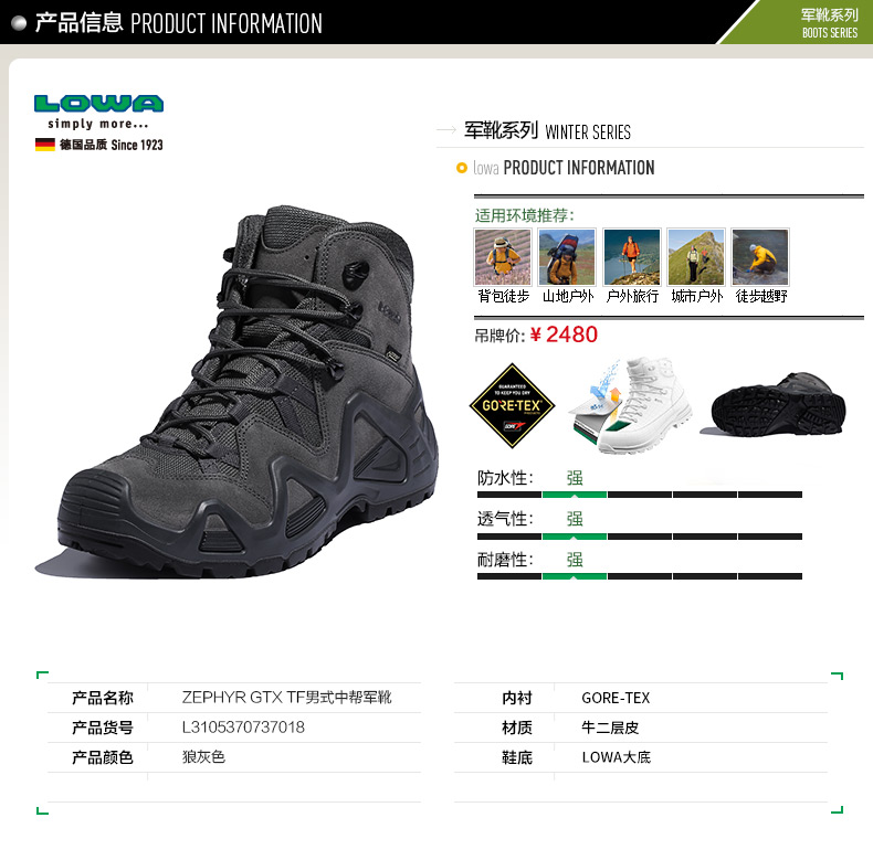【LOWA】ZEPHYR GTX TF男式中帮军靴L310537