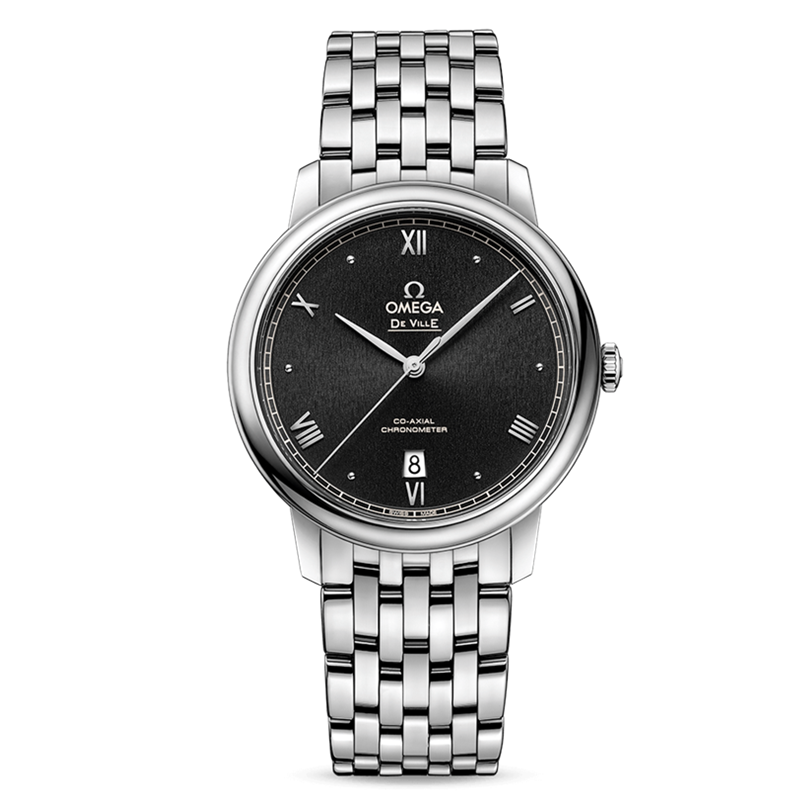 镜面材质 | 蓝宝石水晶玻璃 | 表盘 | 精钢表壳 黑色PVD处理的太阳光芒射线表盘,环绕“轨道式”分钟圈。腕表的6点位置设有日历窗,欧米茄品牌标识、间隔出现的罗马数字与弧面形小时刻度,以及指针均经过镀铑处理。 大三针 密底 |