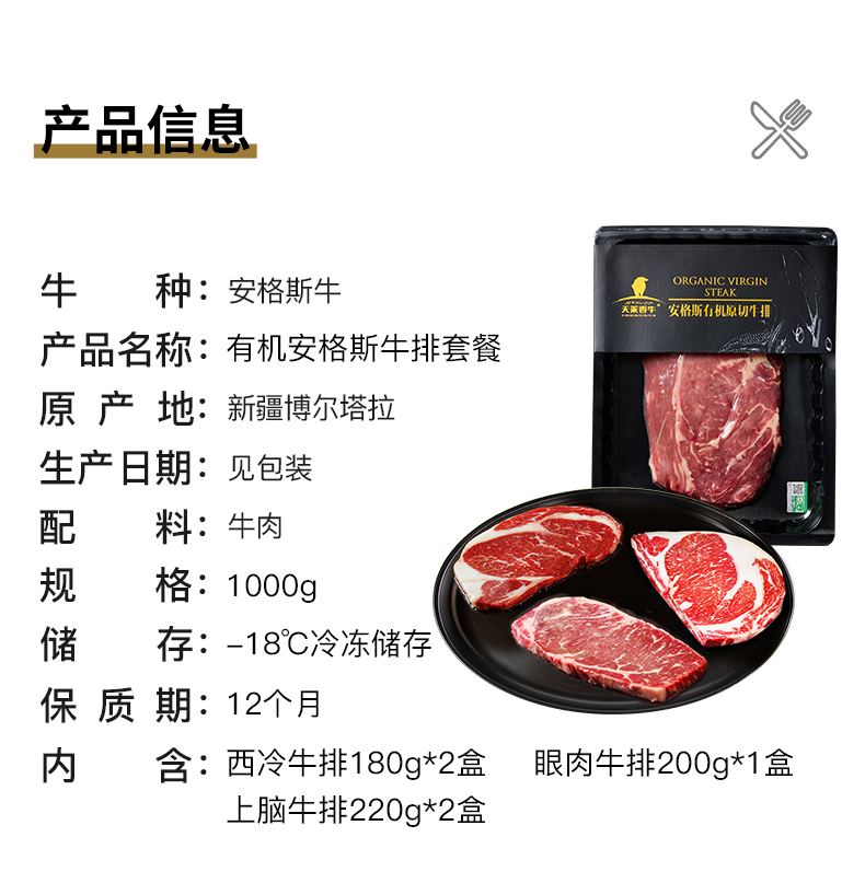 【冷冻】天莱香牛安格斯有机牛排套餐1000g