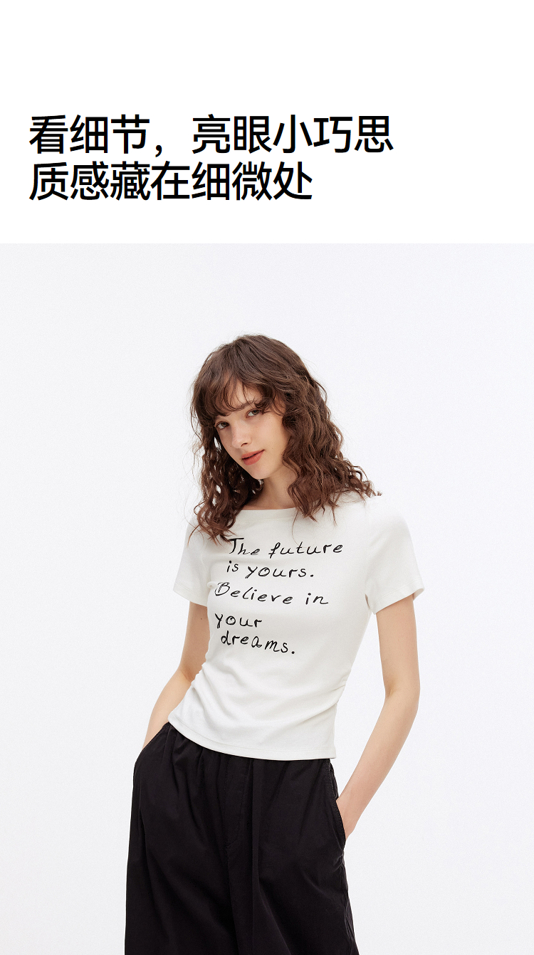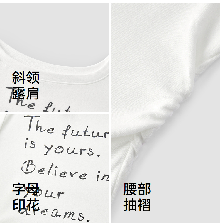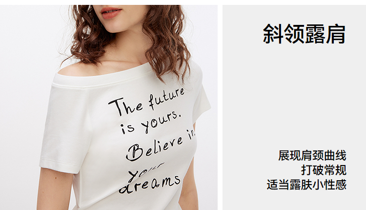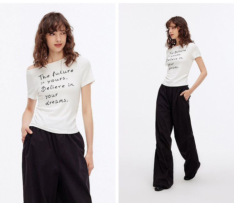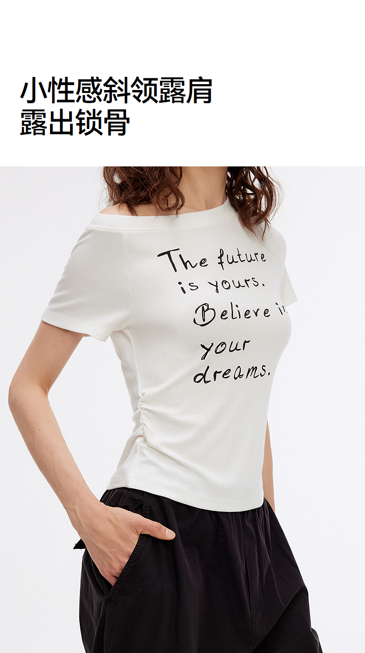 【99元任选2件】森马短袖T恤女夏季短款斜肩露肩字母修身褶皱显瘦个性小性感衣服