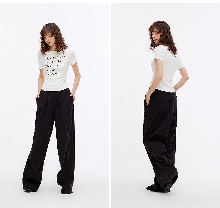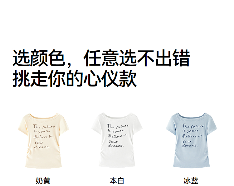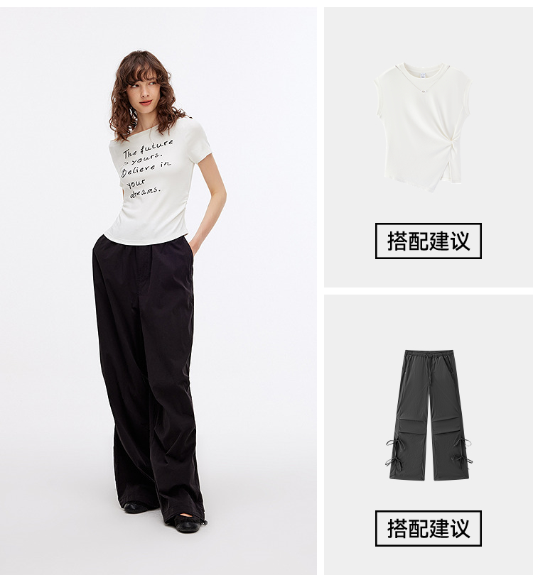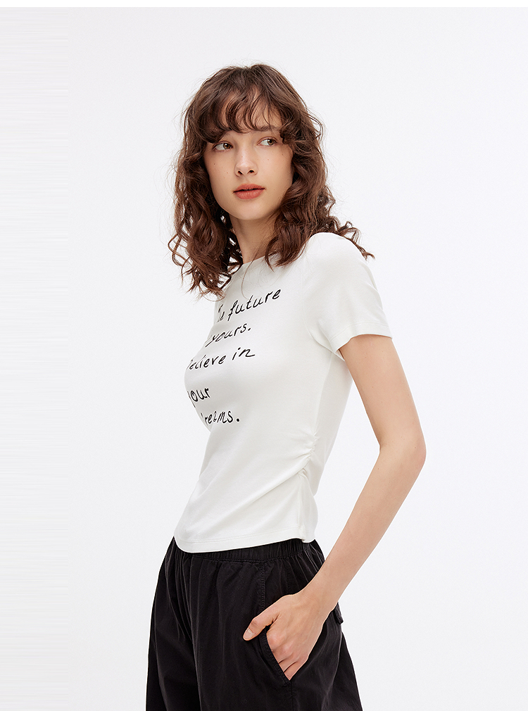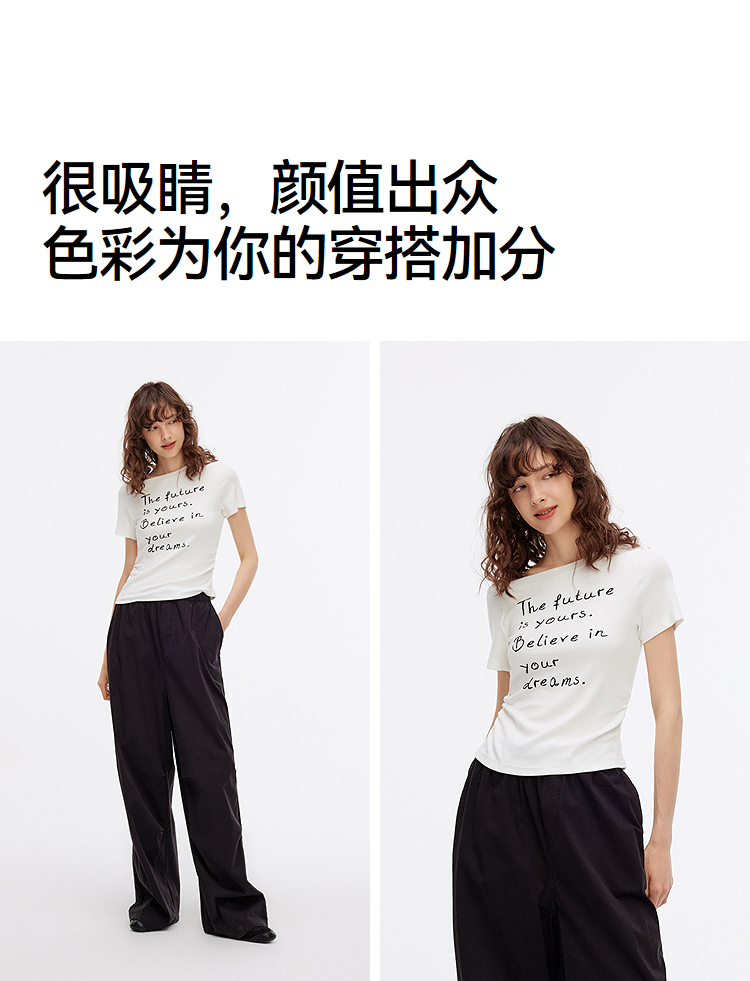 【99元任选2件】森马短袖T恤女夏季短款斜肩露肩字母修身褶皱显瘦个性小性感衣服