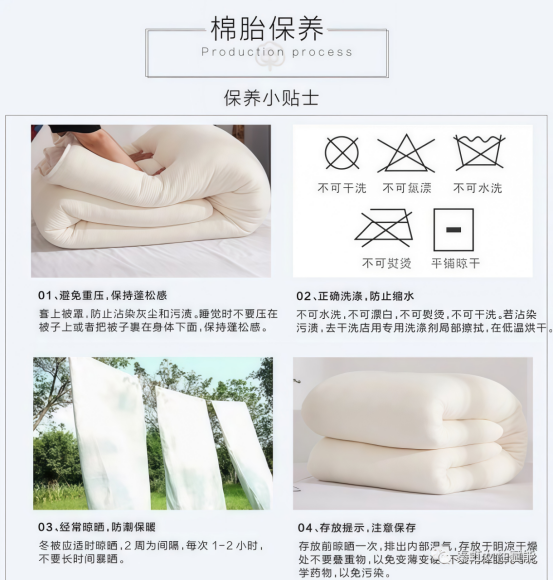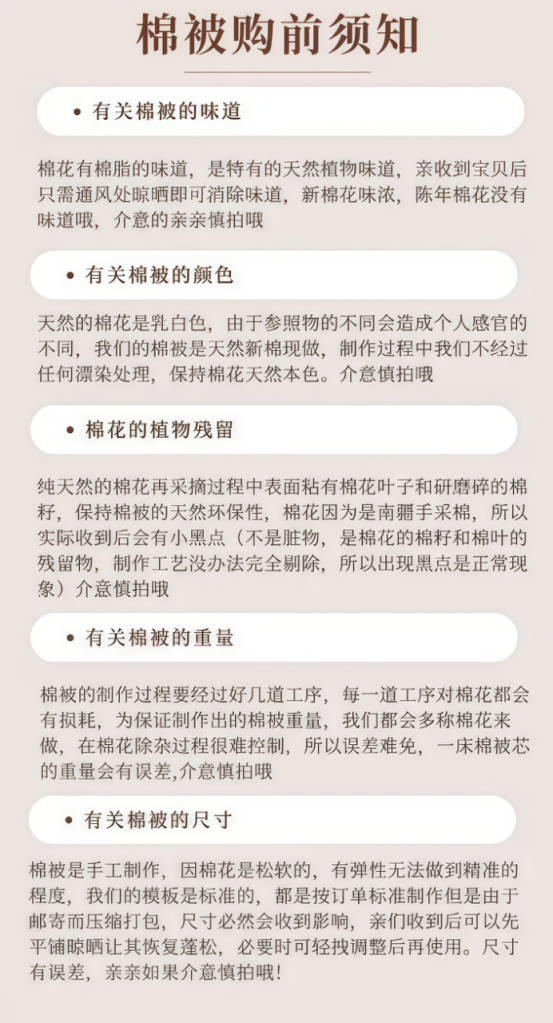 3.有关棉被的颜色 天然的棉花是自然白,也就是米白色,不是纯粹的雪白,雪白的棉花一定是经过漂染的, 由于参照物不同,会造成个人感官上的不同,我们的棉花被是自己种植的新棉花现做的,不经过其他处理。