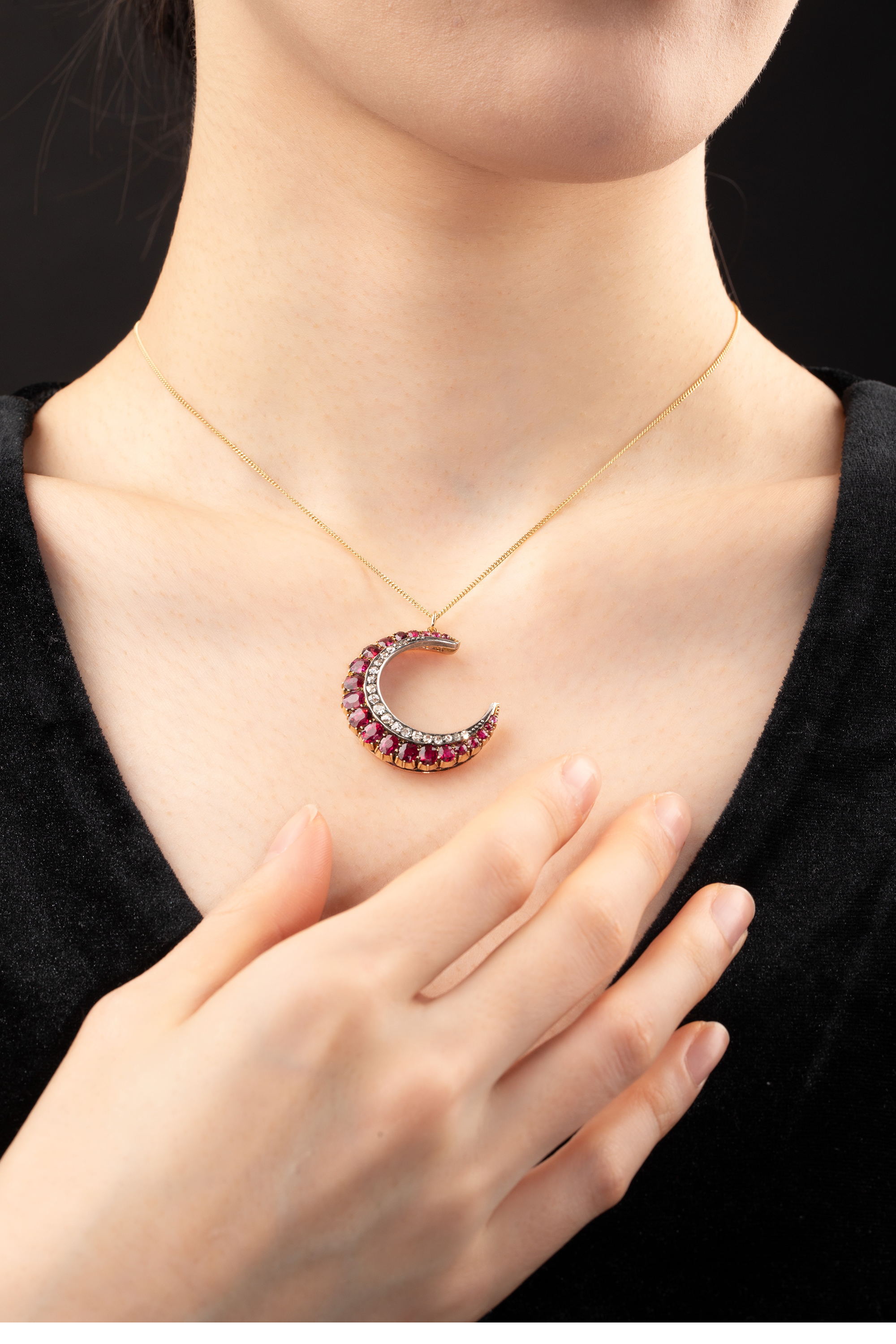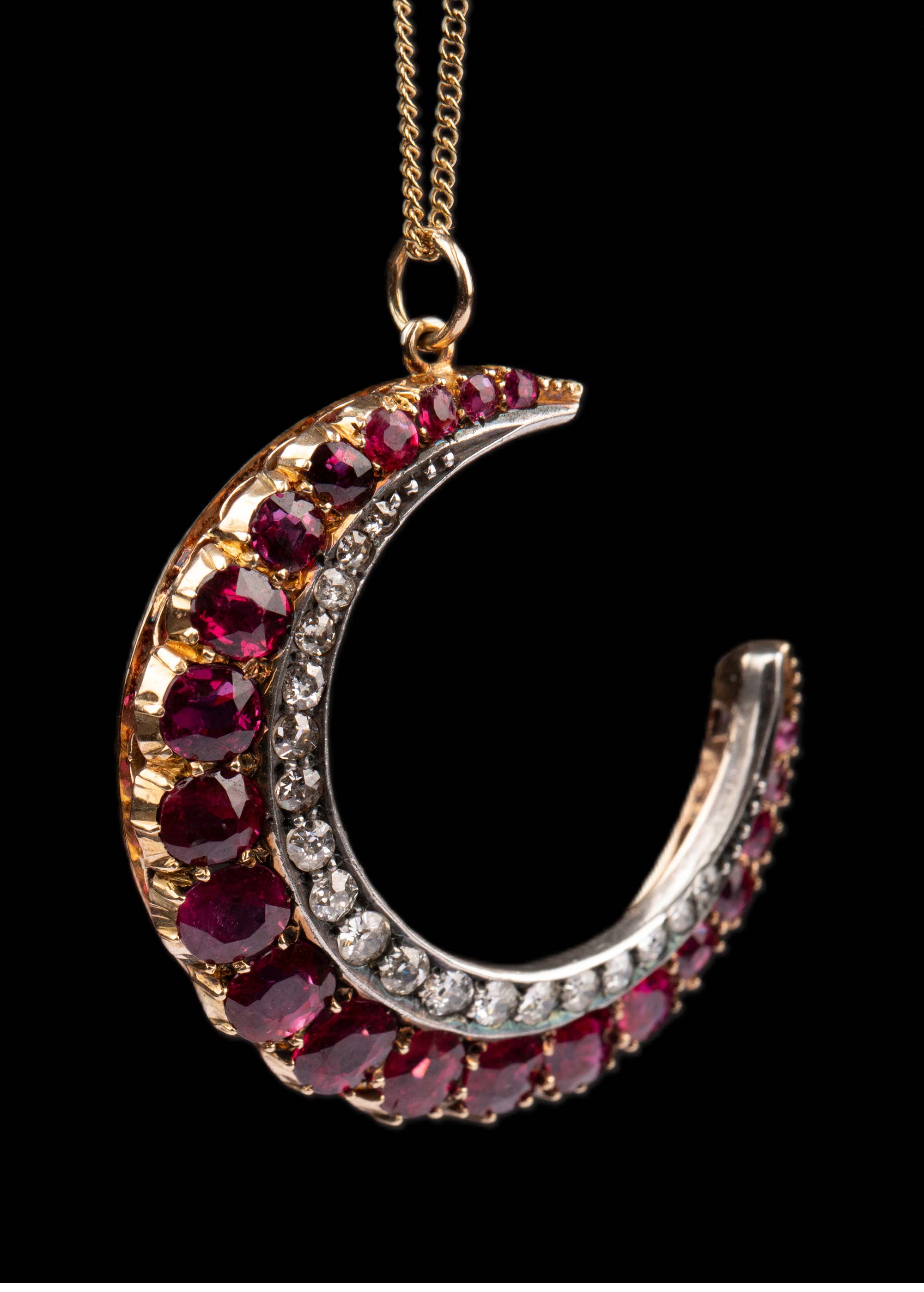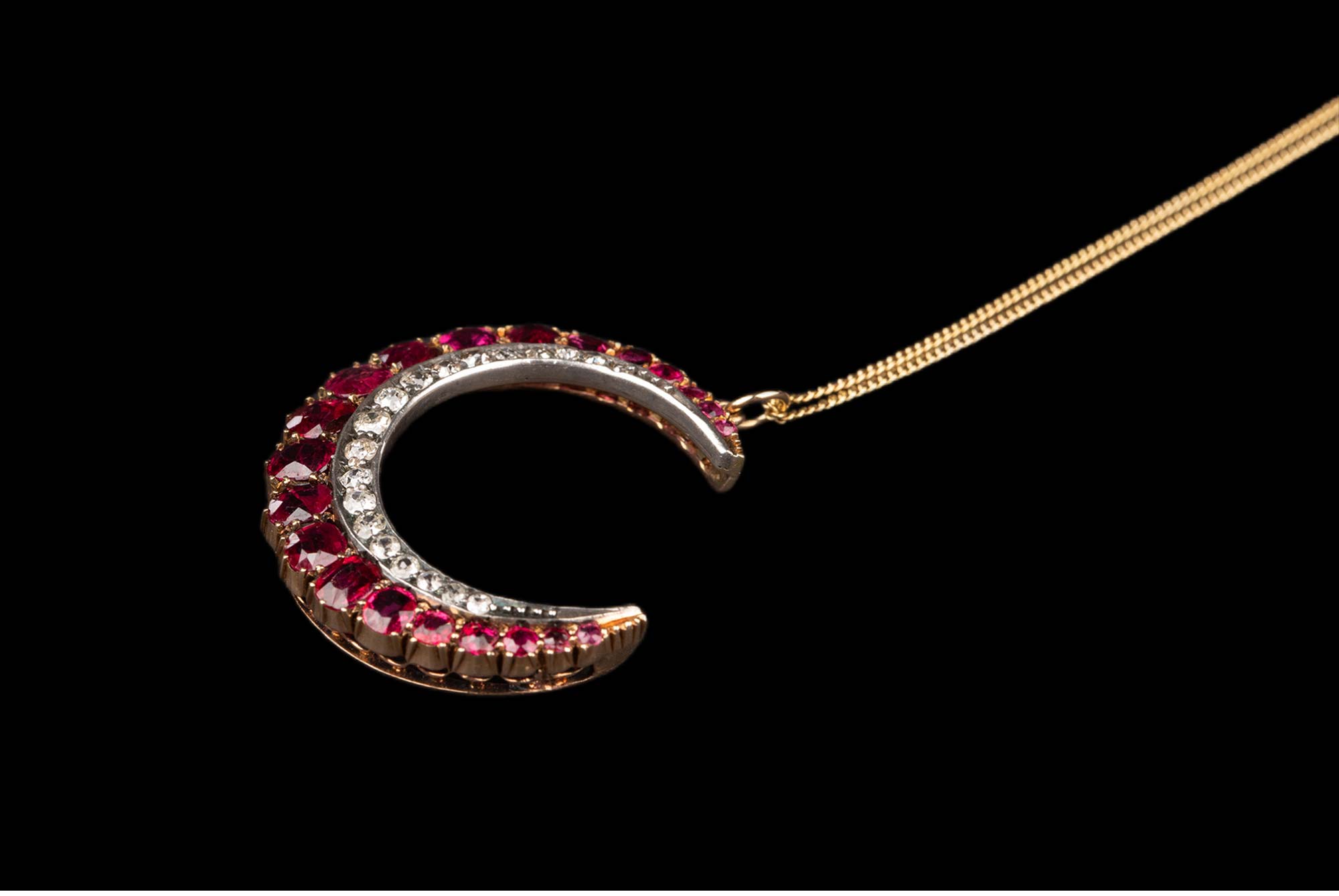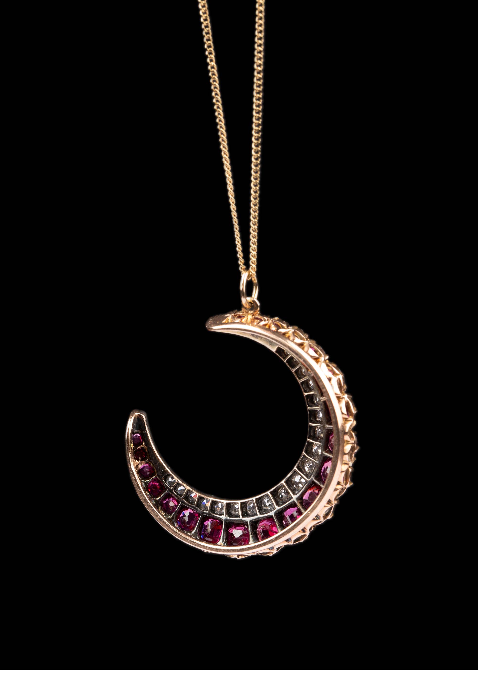 19世纪末英国出品黄金底纯银镶嵌红宝石及钻石新月造型吊坠项链