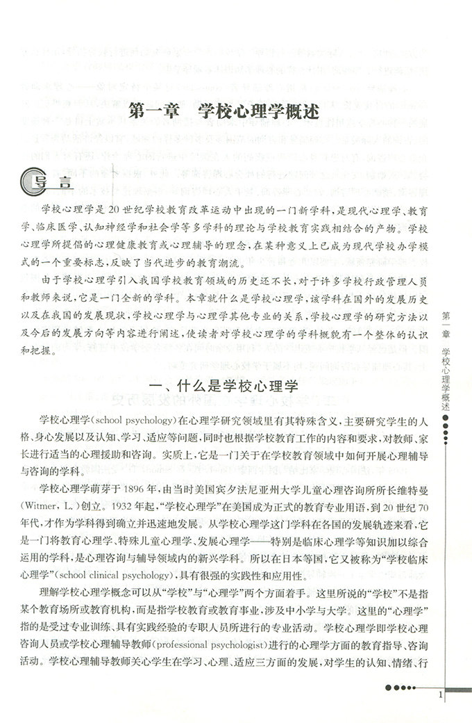 心理学专业本科学生 《学校心理学——教育与辅导的心理》(第三版)综合了教育学、行为科学、学习心理学、发展心理学和临床心理学等学科的真知灼见,并汲取了认知神经科学、社会学、生命科学和教育管理学等领域的最新成果,是一本研究儿童、青少年身心健康和全面发展的新兴教育学科的教材。也可作为相关培训、自学考试的参考书。本教材主要针对学生的学习问题、适应问题和身心发展问题,但不仅仅针对学生,而是从学校与教师、家庭与家长多视角探究问题产生的原因及可行的干预措施。教材内容包含学校心理学的基本的理论与技能,并以问题为导向侧重预防和干预学生行为不良、挫折、适应、考试升学、生涯规划、恋爱与性、网络成瘾、自杀和危机干预等具体问题。具有很强的实践性和可操作性。