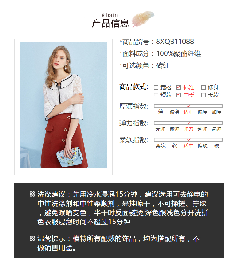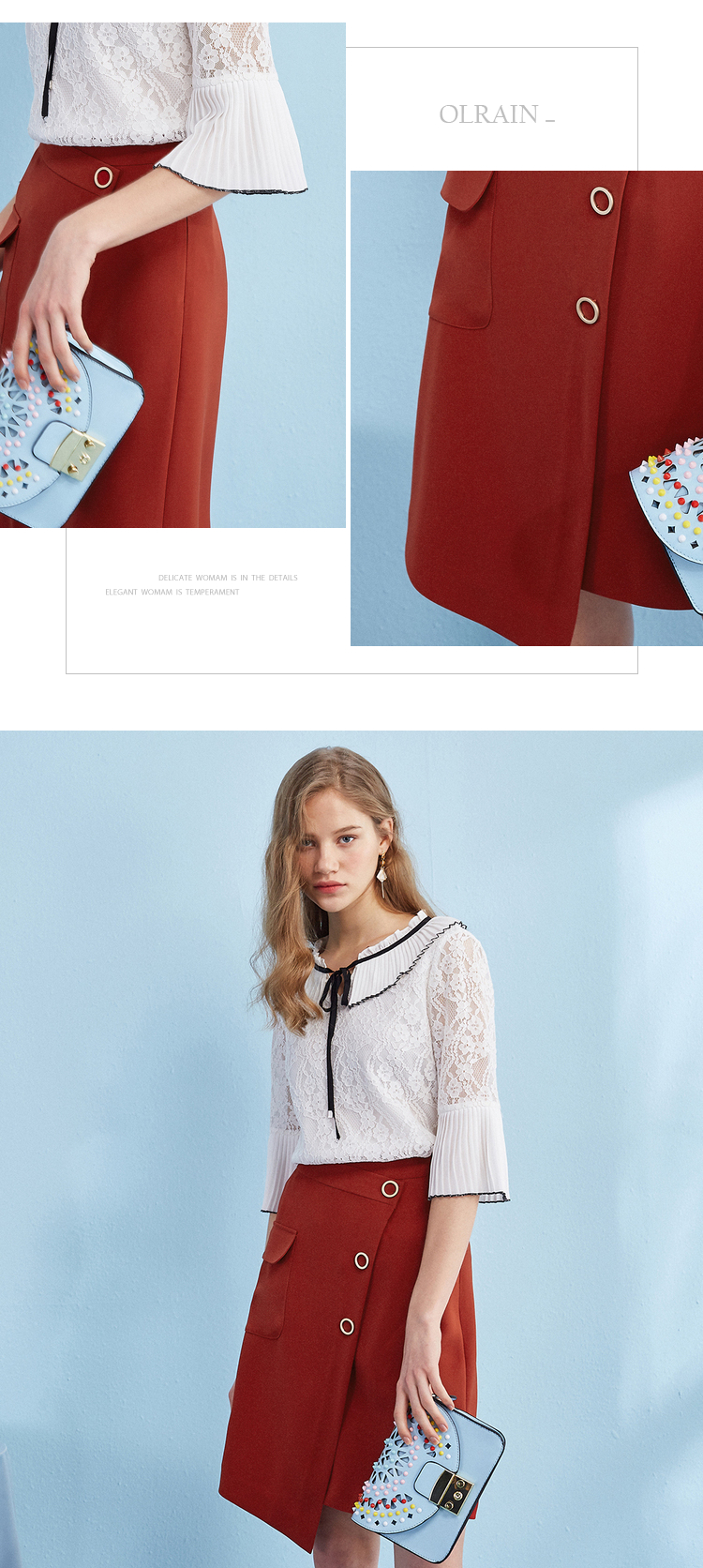 “精致”是欧芮儿olrain品牌文化的核心,欧芮儿认为,精致的女人,不但要外在动人,更要内在迷人,内外兼修,有魅力、有气质、有内涵,自信而不自傲,优雅而不矫揉,自有万种风情而不轻浮,更不故作矜持。