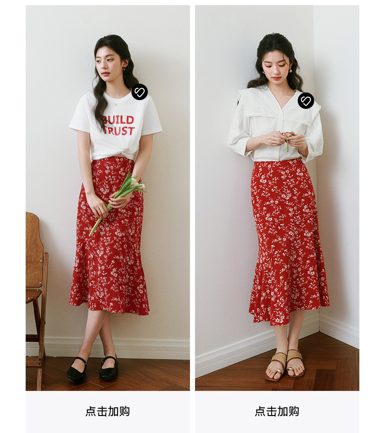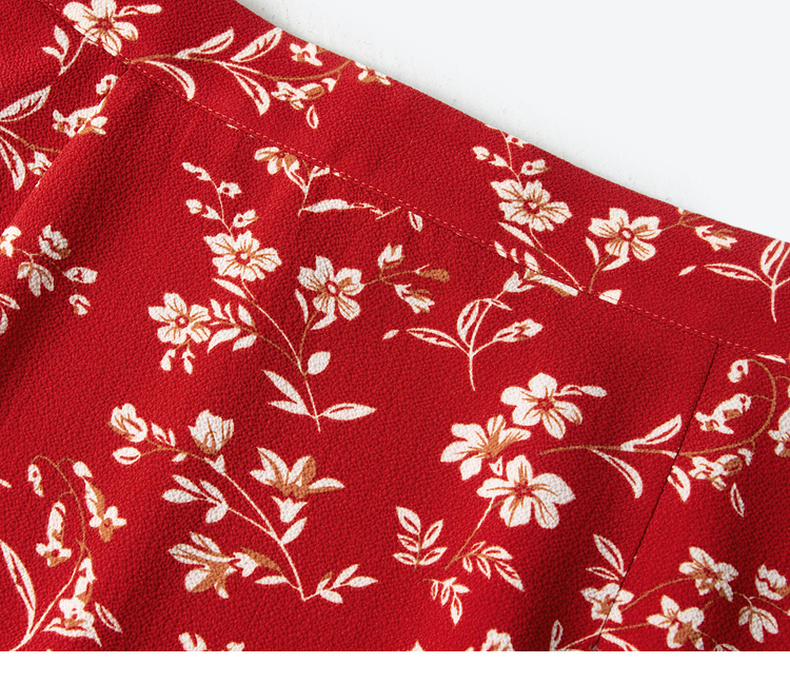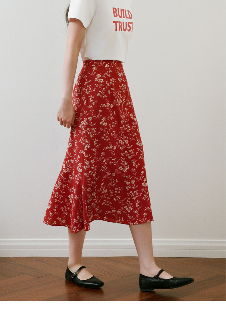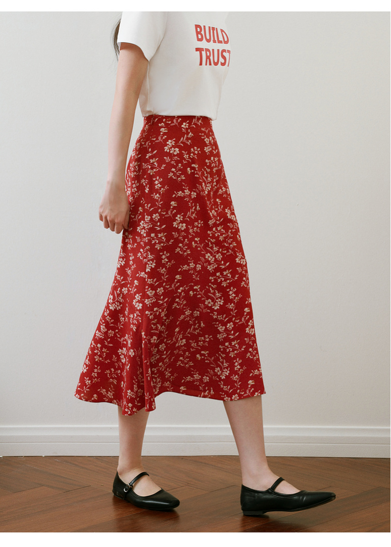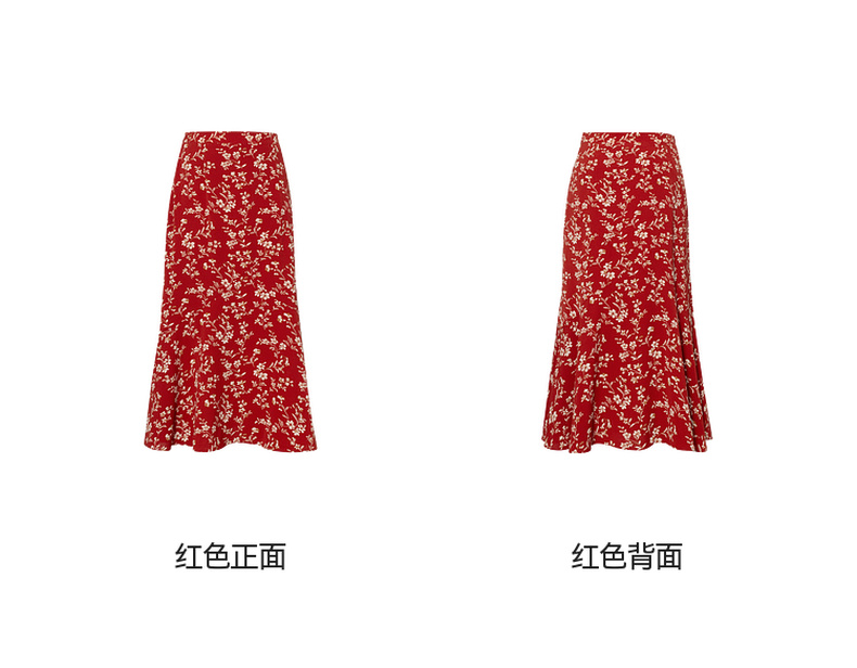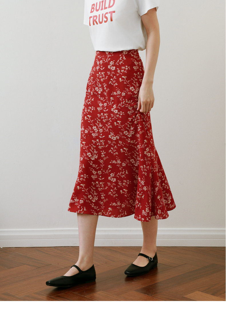 【严选】诗凡黎法式红色碎花半身裙2025夏新款高腰A字浪漫荷叶边鱼尾裙7G4240171