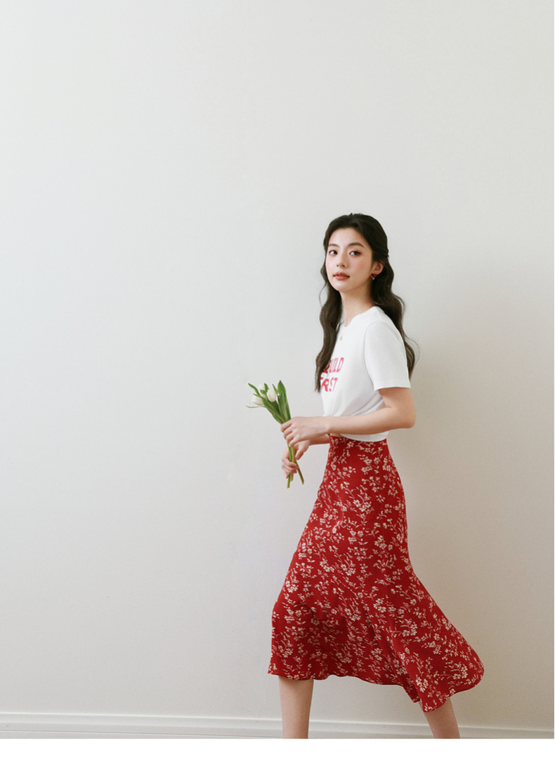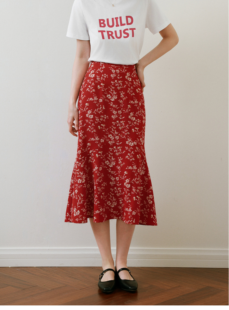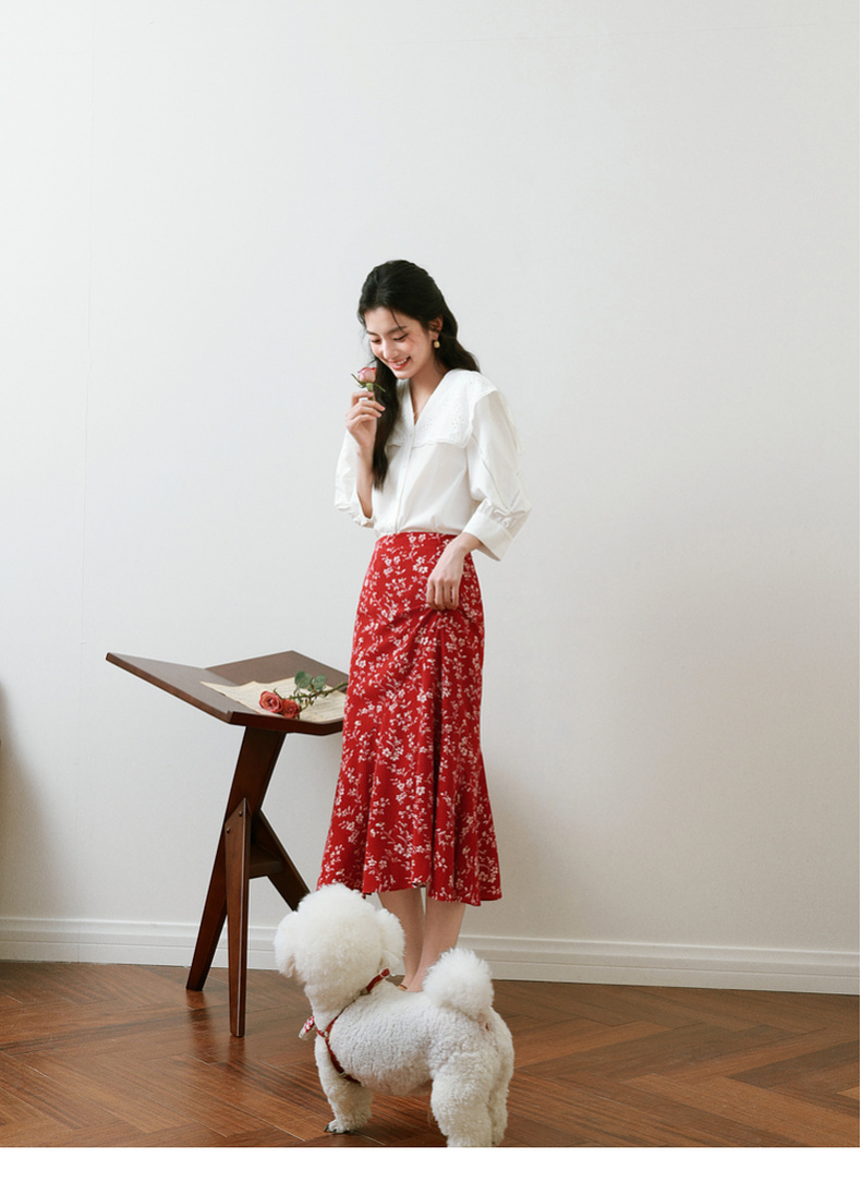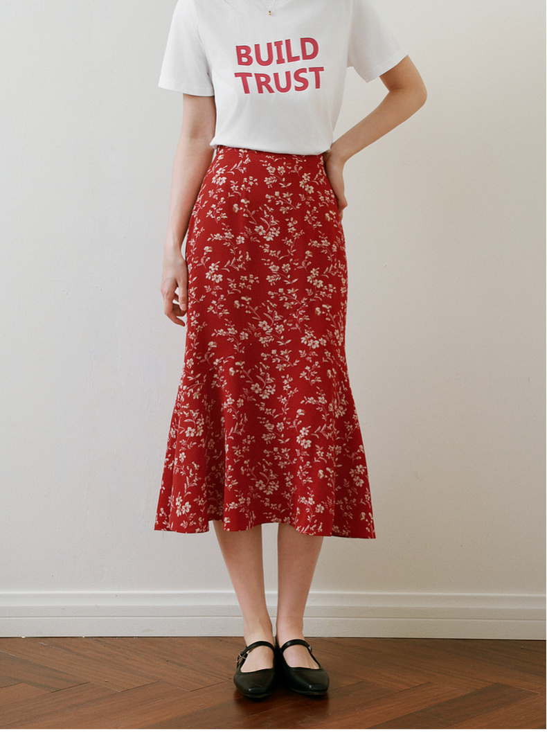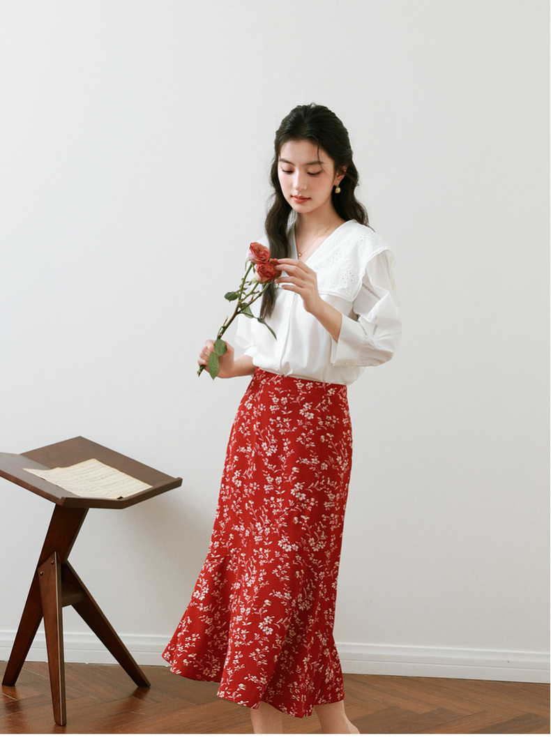 【严选】诗凡黎法式红色碎花半身裙2025夏新款高腰A字浪漫荷叶边鱼尾裙7G4240171