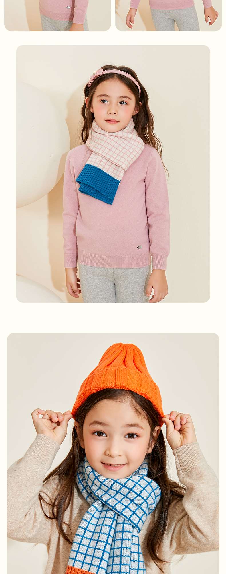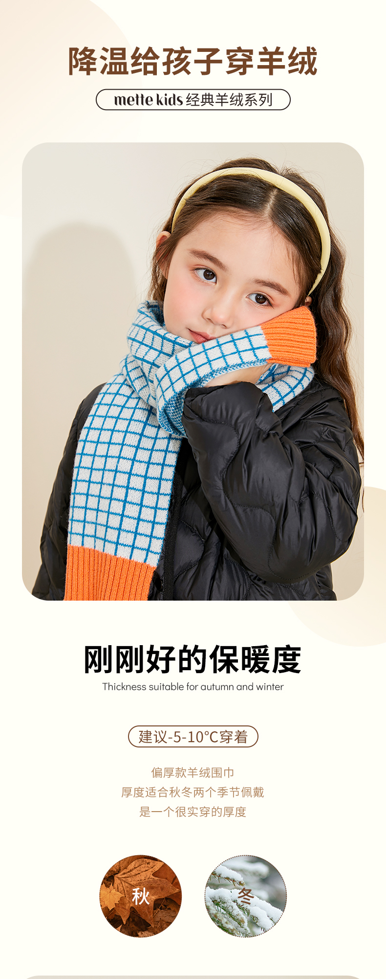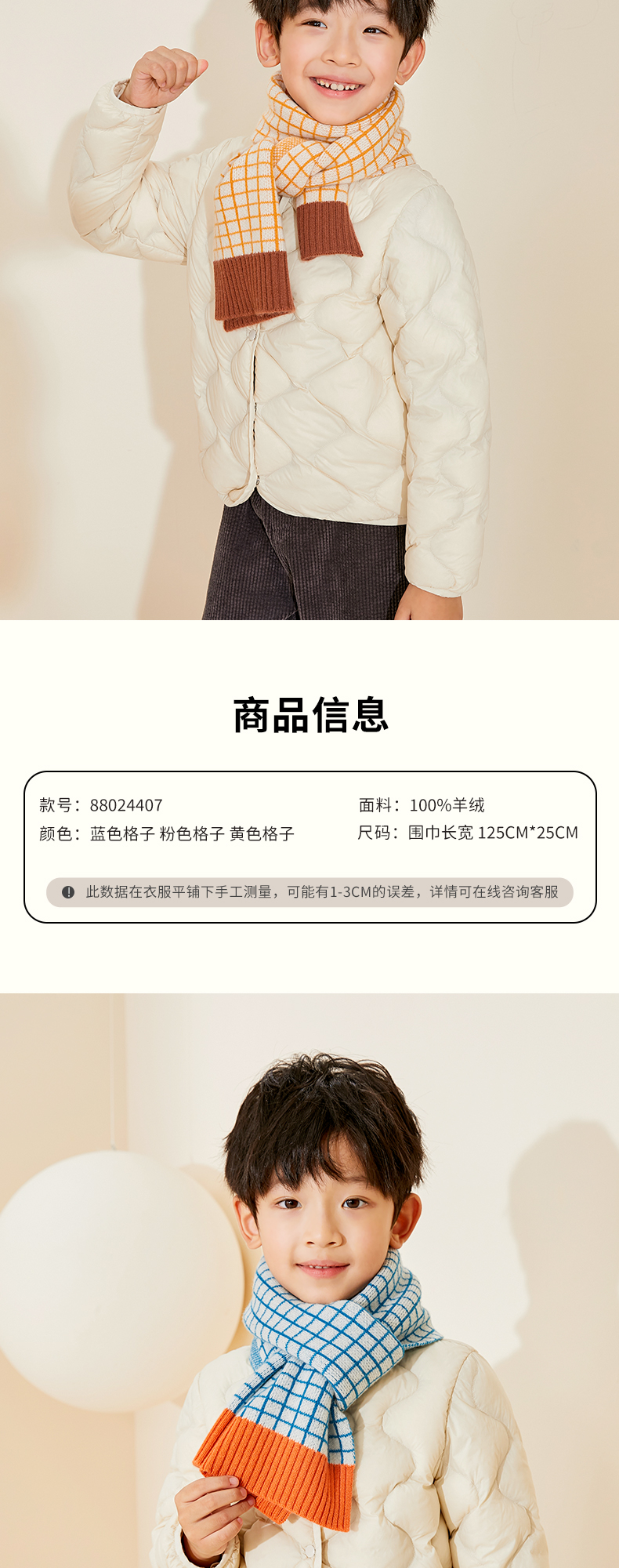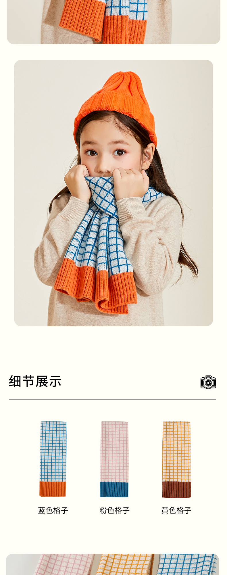 mettekids儿童围巾纯羊绒男童女童新款格子针织秋冬季保暖围脖