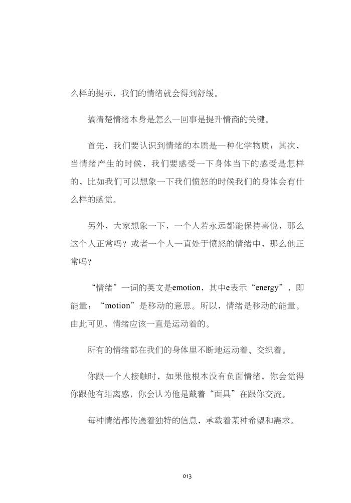 “情绪”一词的英文是emotion,其中e表示“energy”,即能量;“motion”是移动的意思。所以,情绪是移动的能量。由此可见,情绪应该一直是运动着的。