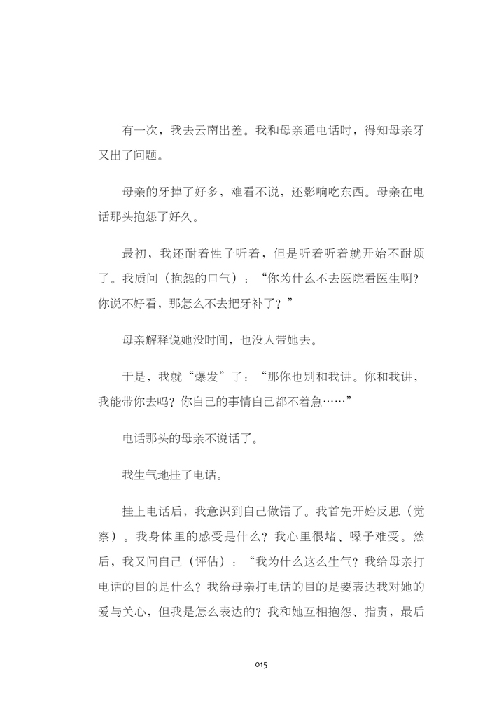 挂上电话后,我意识到自己做错了。我首先开始反思(觉察)。我身体里的感受是什么?我心里很堵、嗓子难受。然后,我又问自己(评估):“我为什么这么生气?我给母亲打电话的目的是什么?我给母亲打电话的目的是要表达我对她的爱与关心,但我是怎么表达的?我和她互相抱怨、指责,最后不欢而散。”