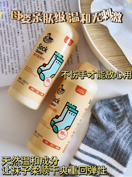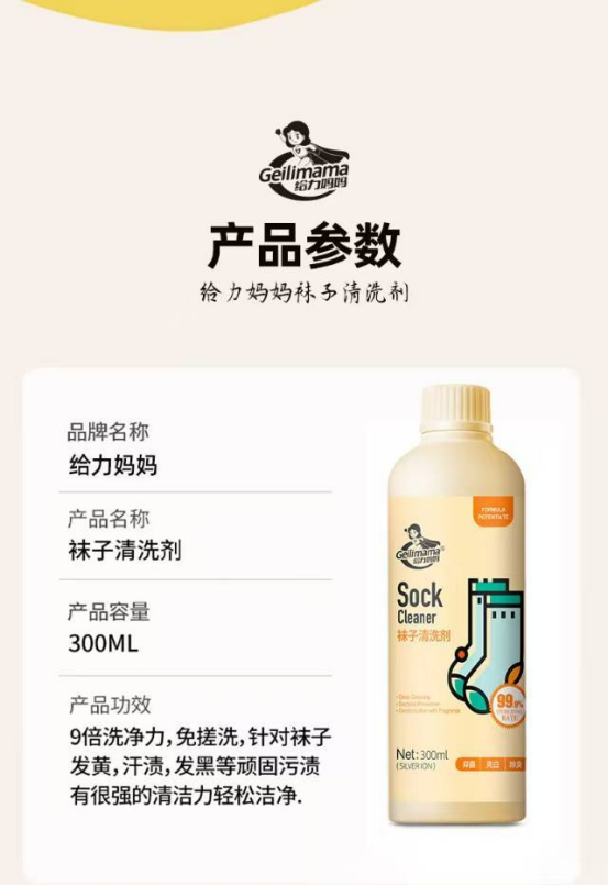 💧高倍洁净力 ⏰给力妈妈 让每条纤维都很‘袜’噻 🧸高浓缩活性成分 🧦深入袜子纤维精准去除 💡常见的汗渍、黄渍、皮脂残留物等