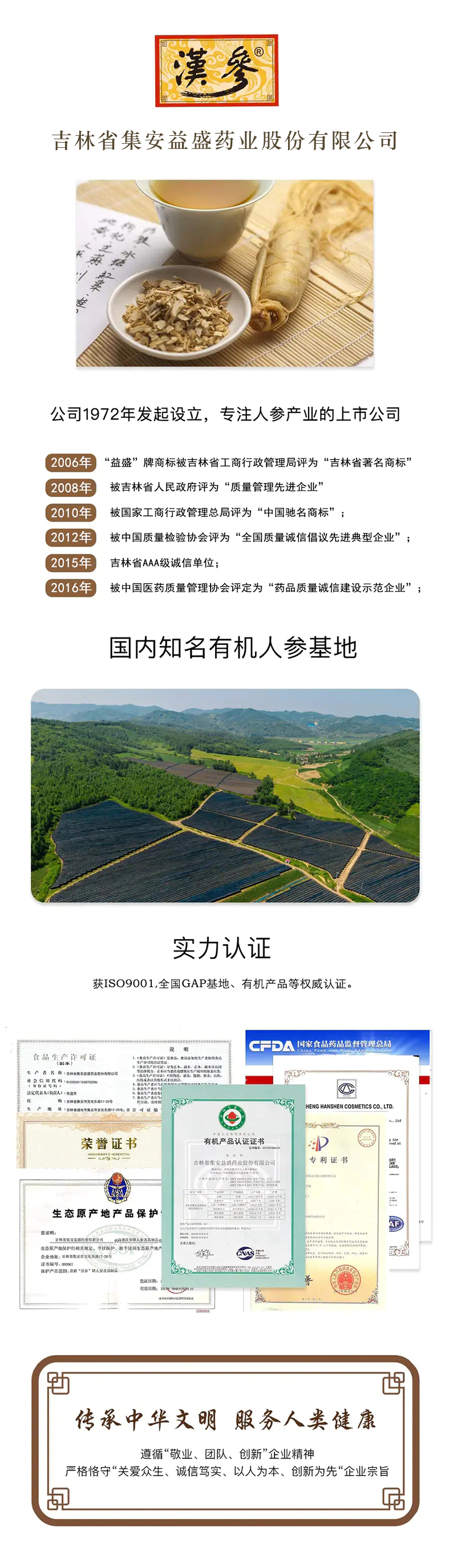 汉参,源自国家GAP非林地有机人参种植基地。益盛药业致力于“扎根传统文化,依靠现代科技”打造完整的人参产业链。以优质的原材料和一流的机械设备为依托,打造出带有中华印记的民族品牌——汉参。