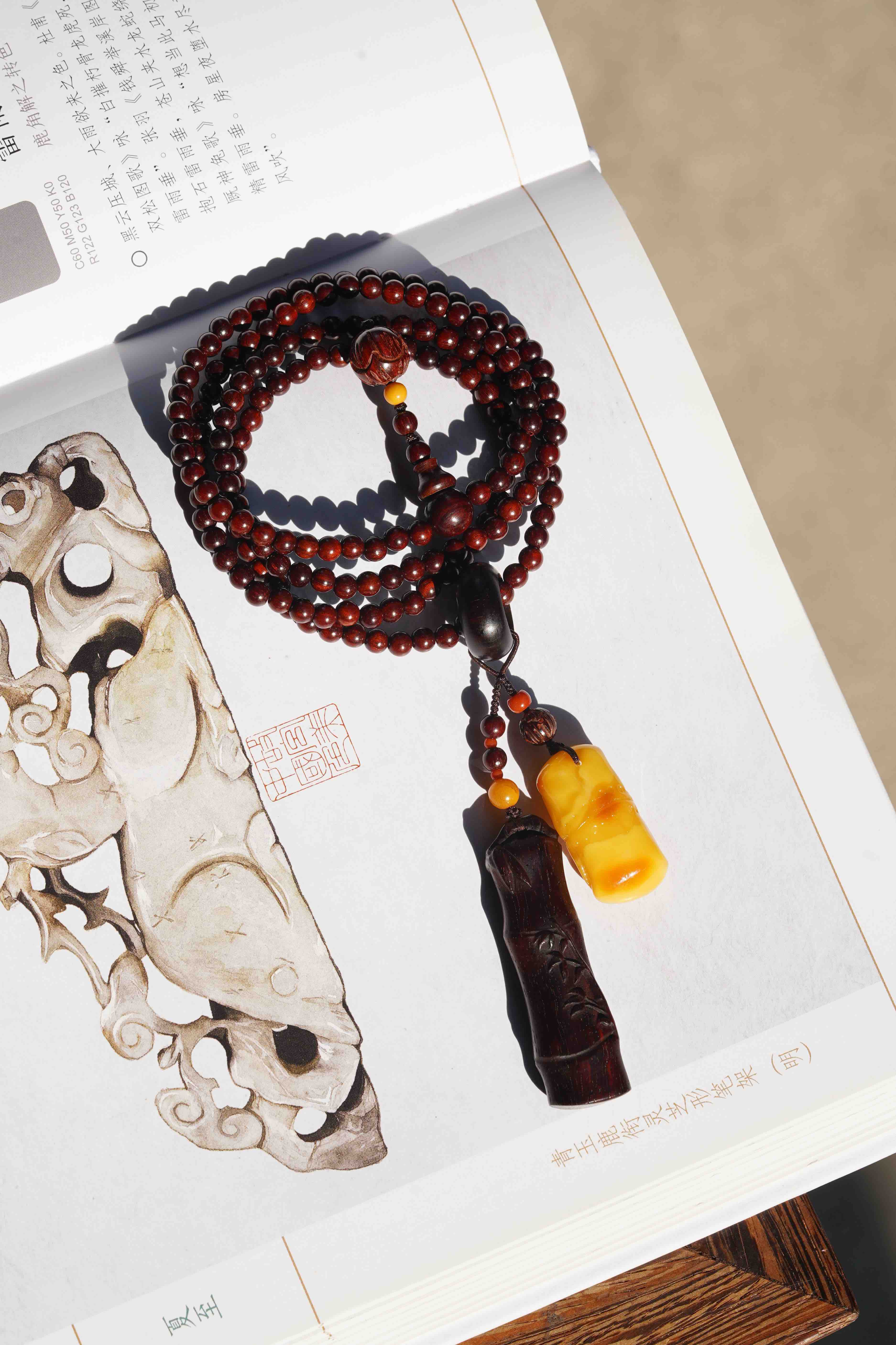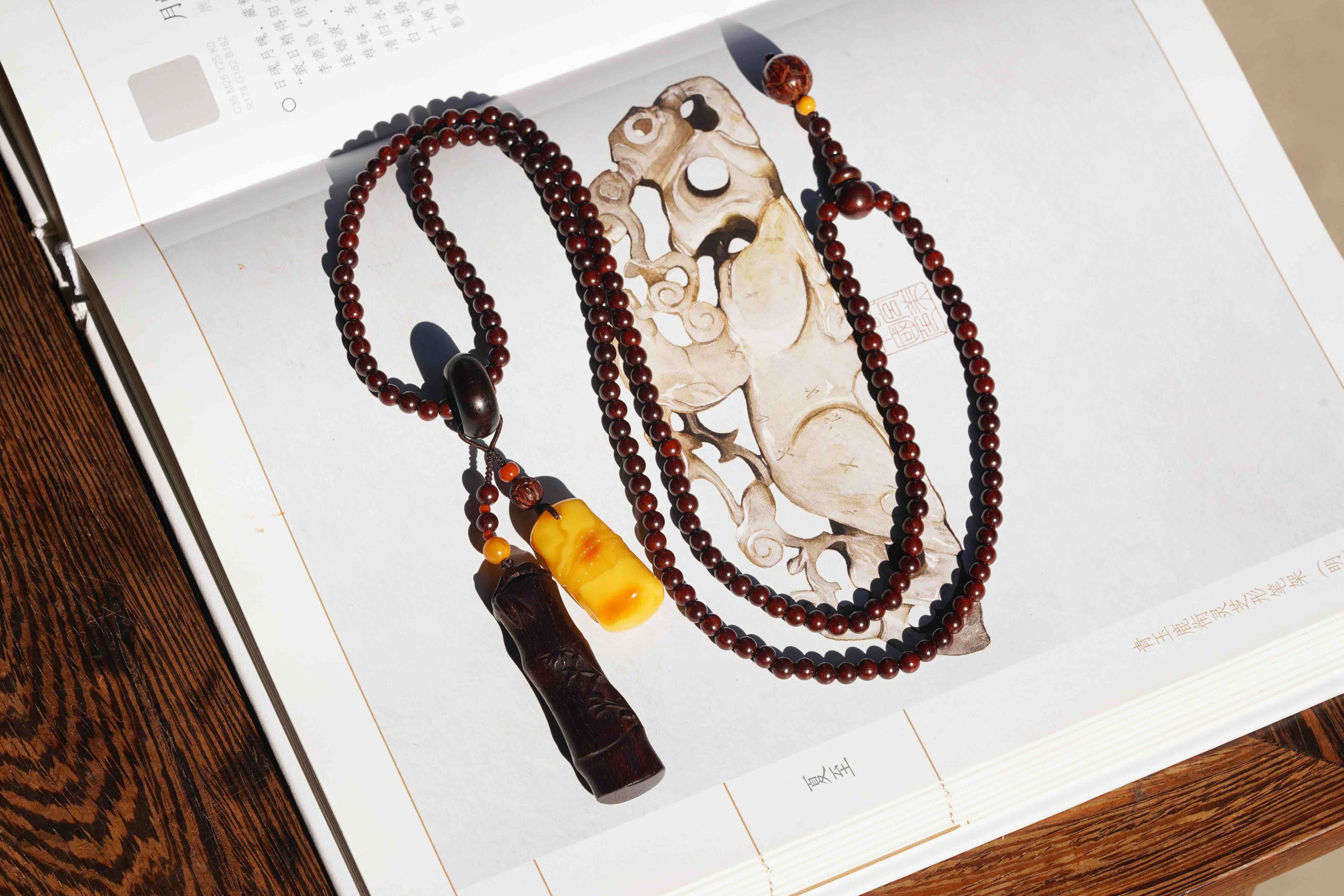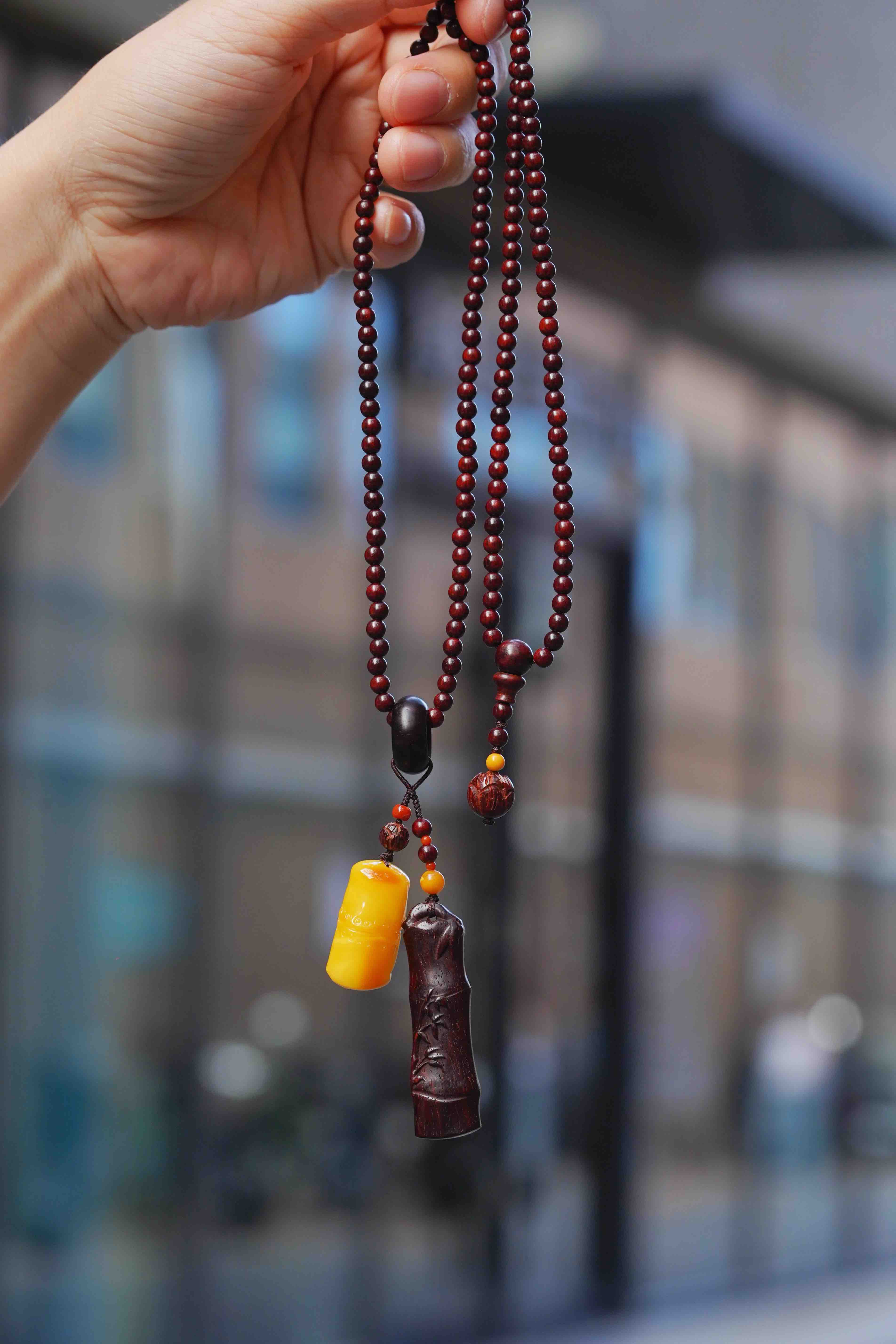 气味上、油脂上、触感上差距都很大。这一条,我们用小叶紫檀竹节混搭蜜蜡竹节
