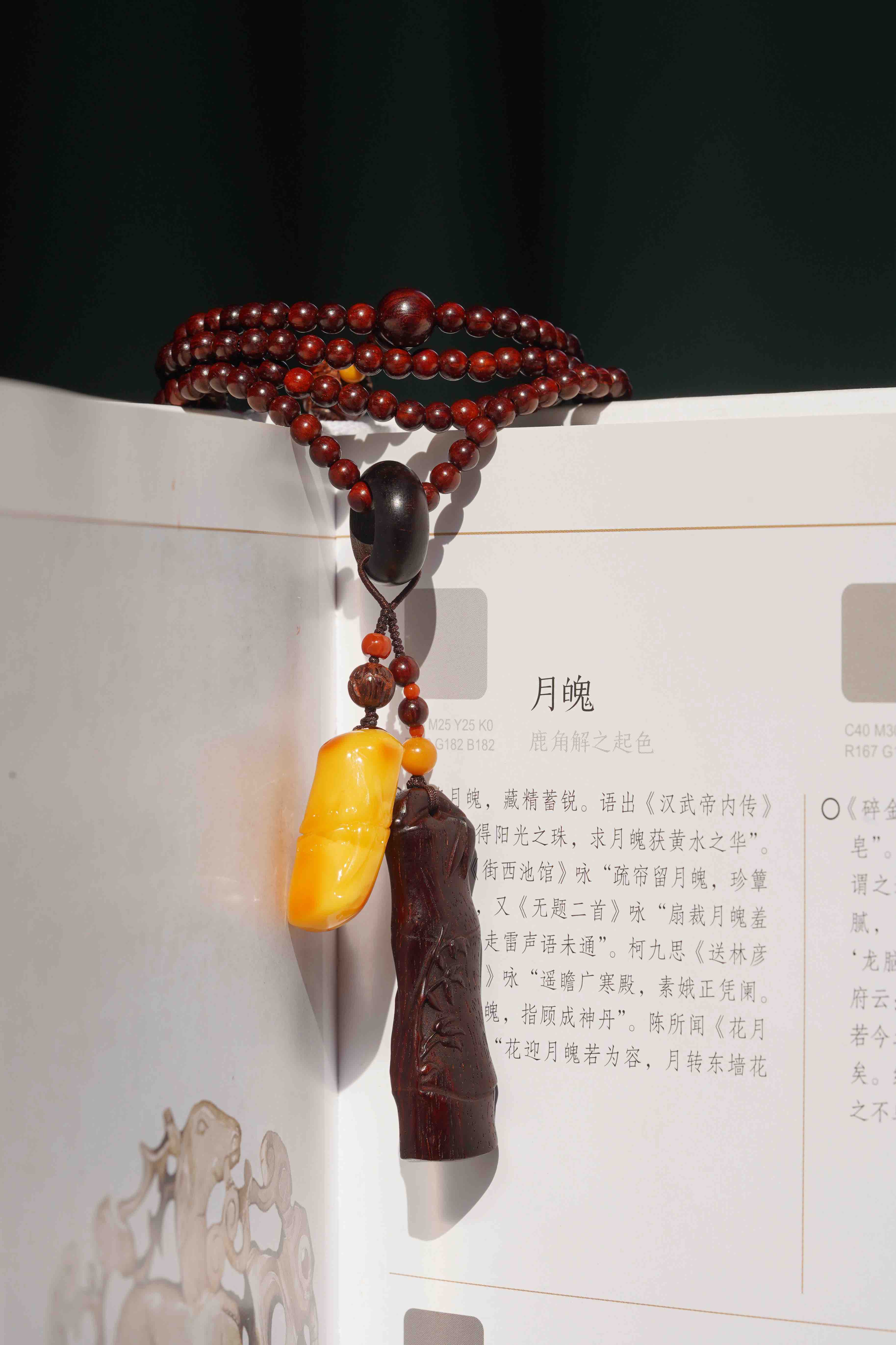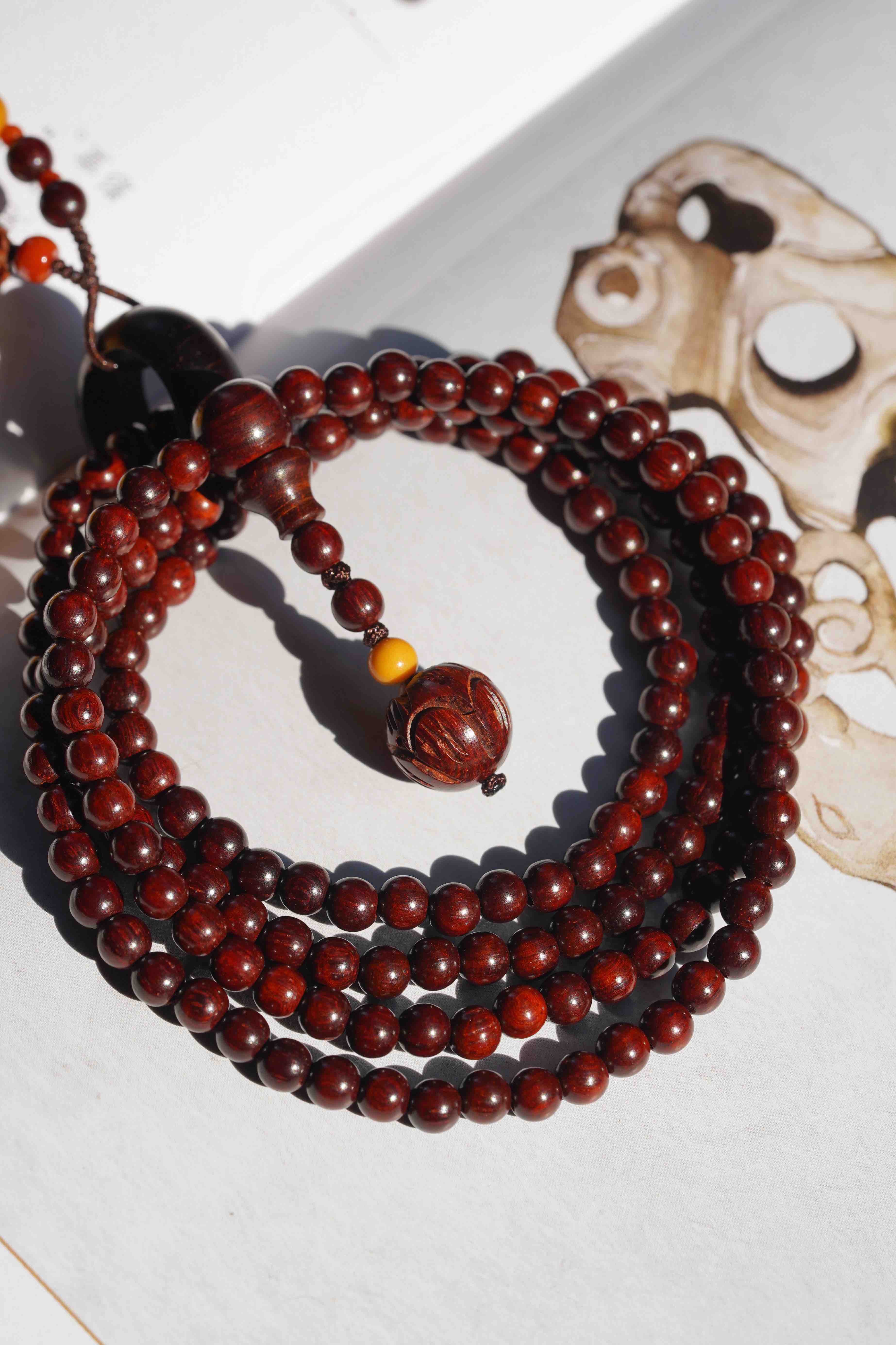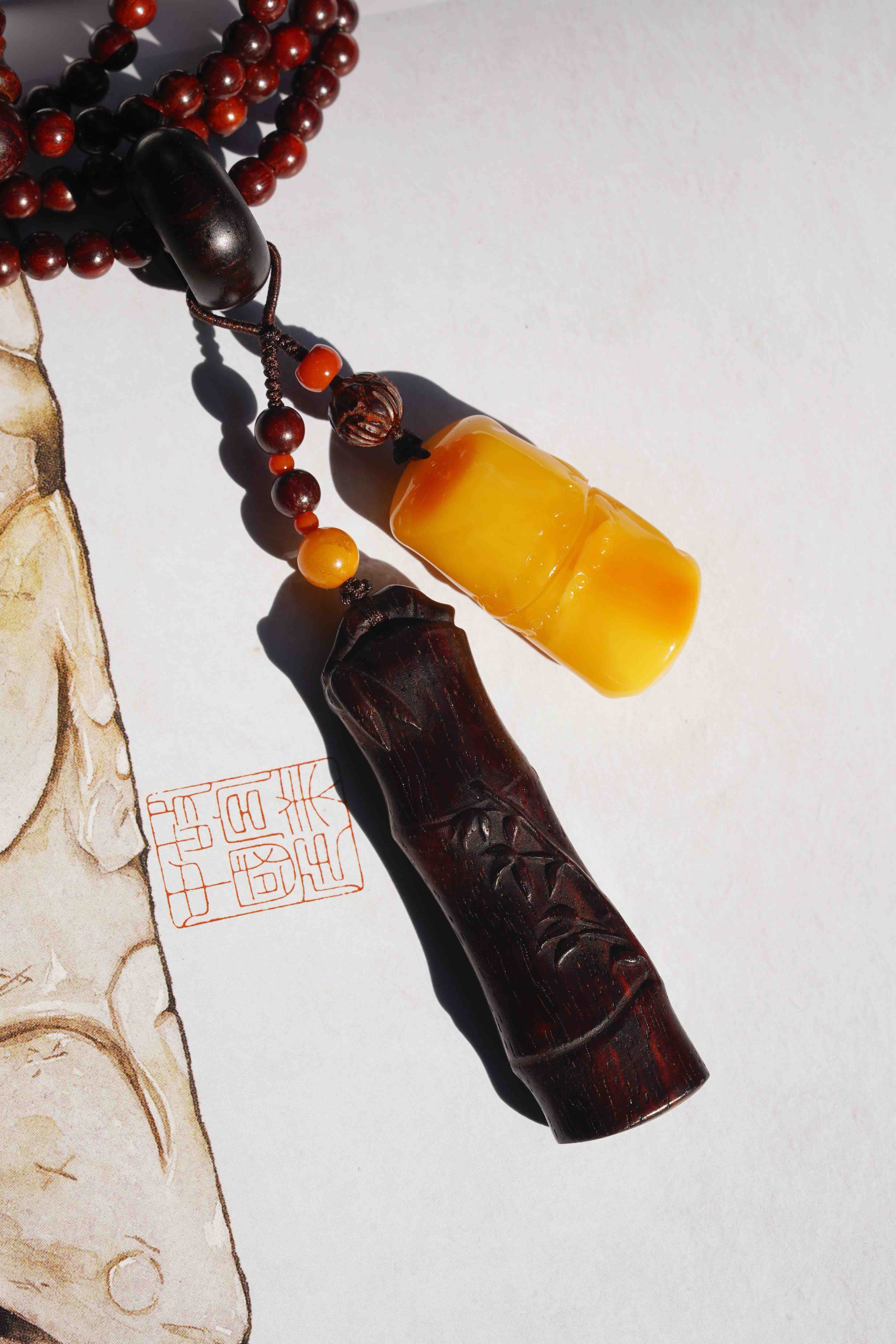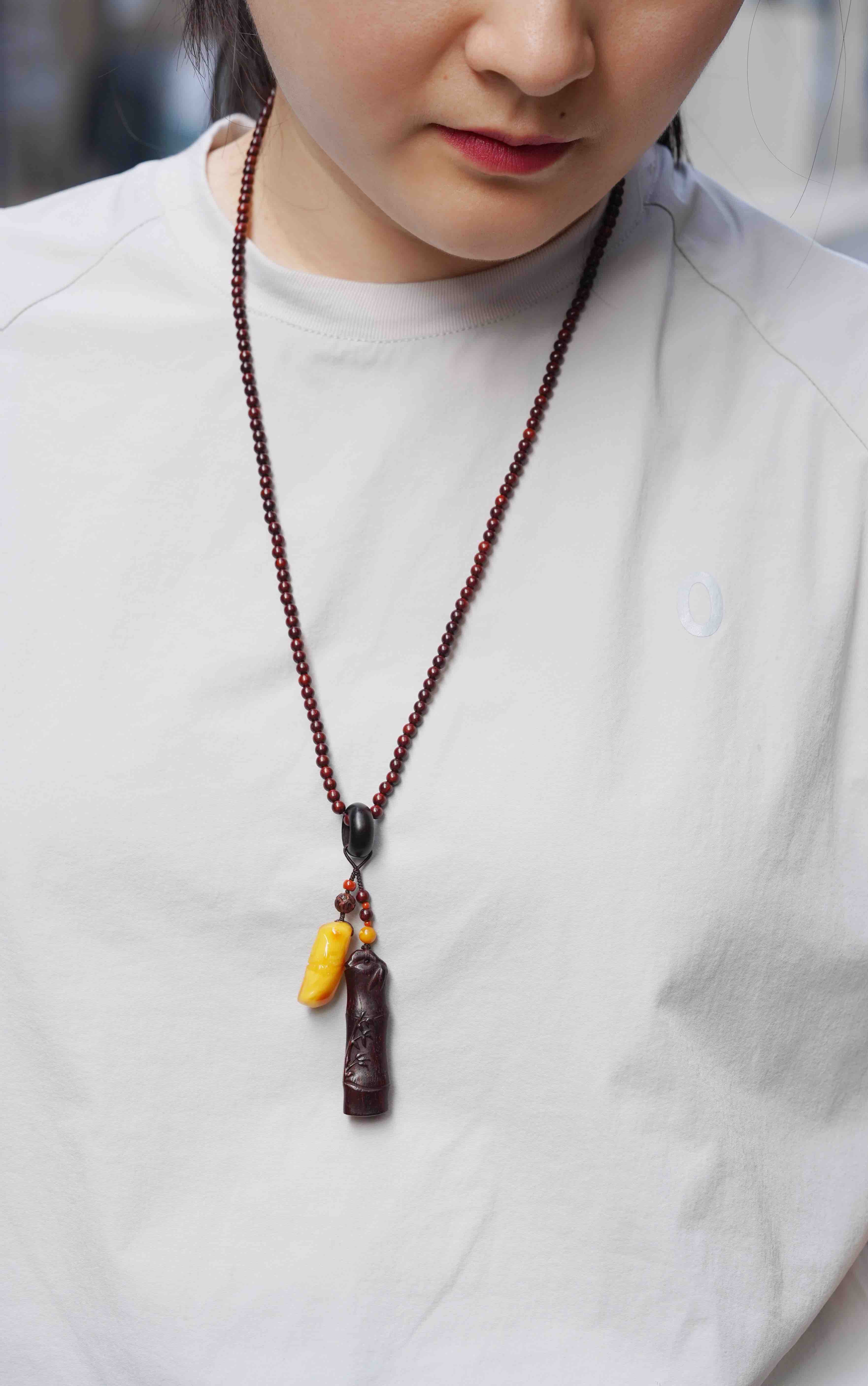 气味上、油脂上、触感上差距都很大。这一条,我们用小叶紫檀竹节混搭蜜蜡竹节