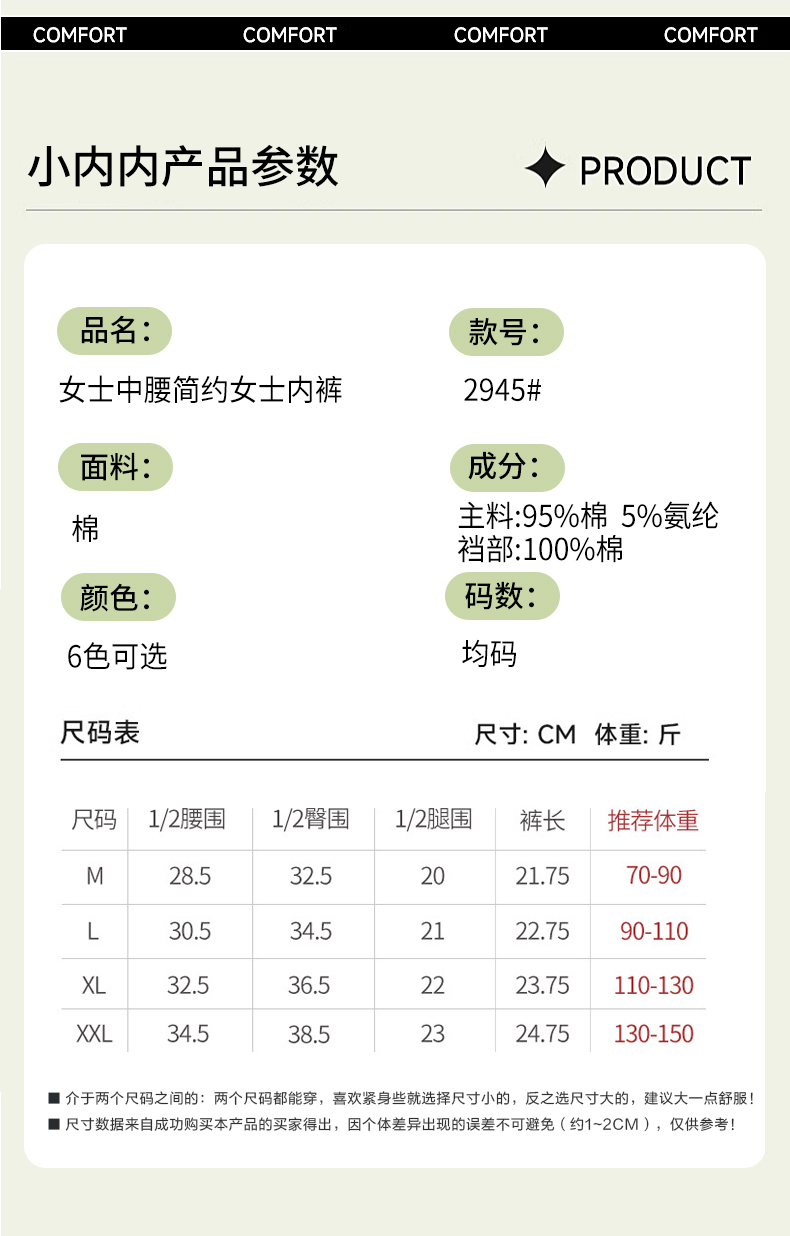 女士云感棉内裤无痕细腻亲肤纯棉加长透气底裆2945