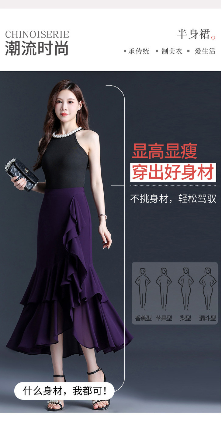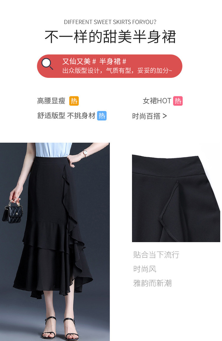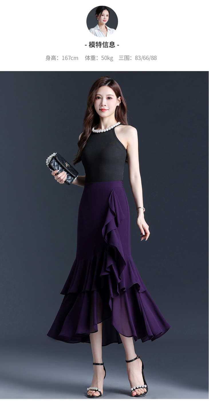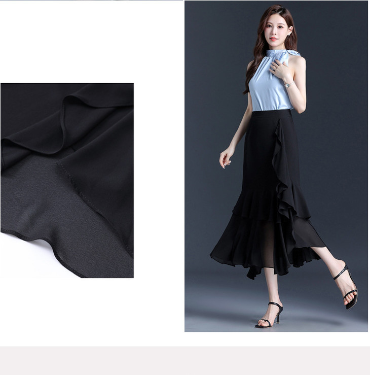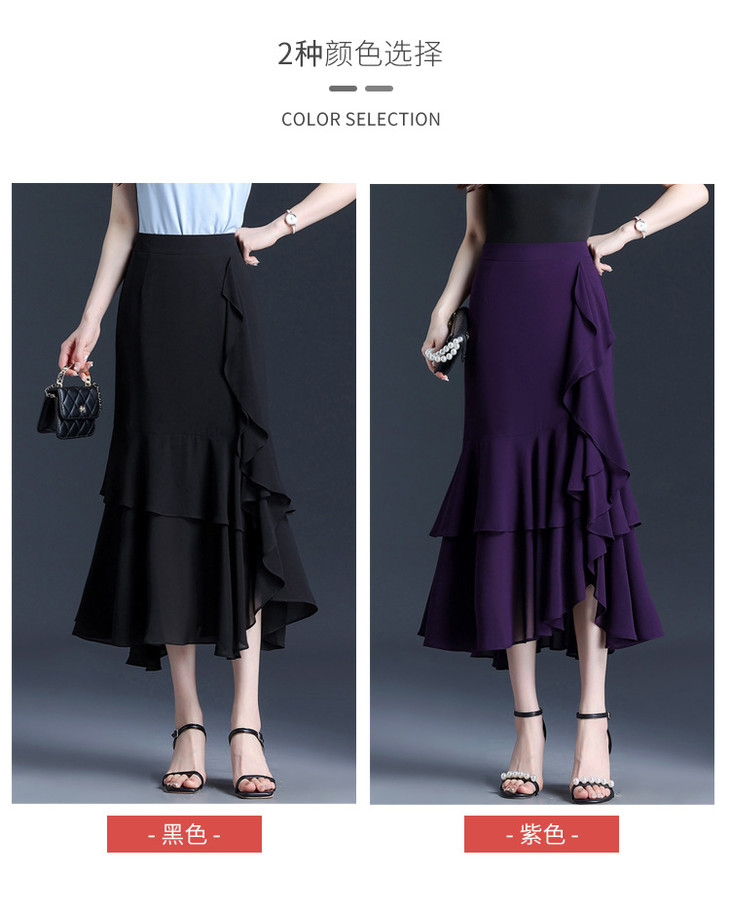 夏款中长款荷叶边拼接雪纺修身鱼尾裙MYX6792
