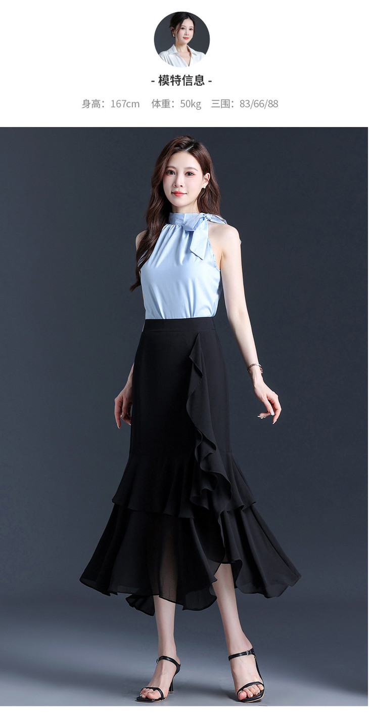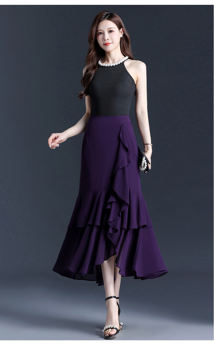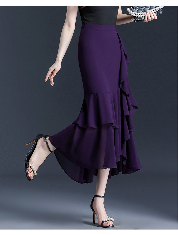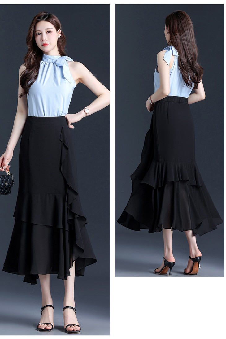 夏款中长款荷叶边拼接雪纺修身鱼尾裙MYX6792