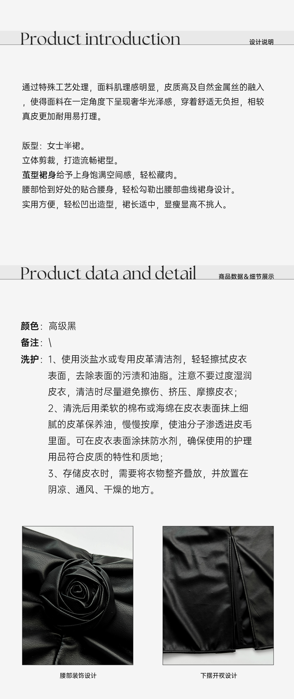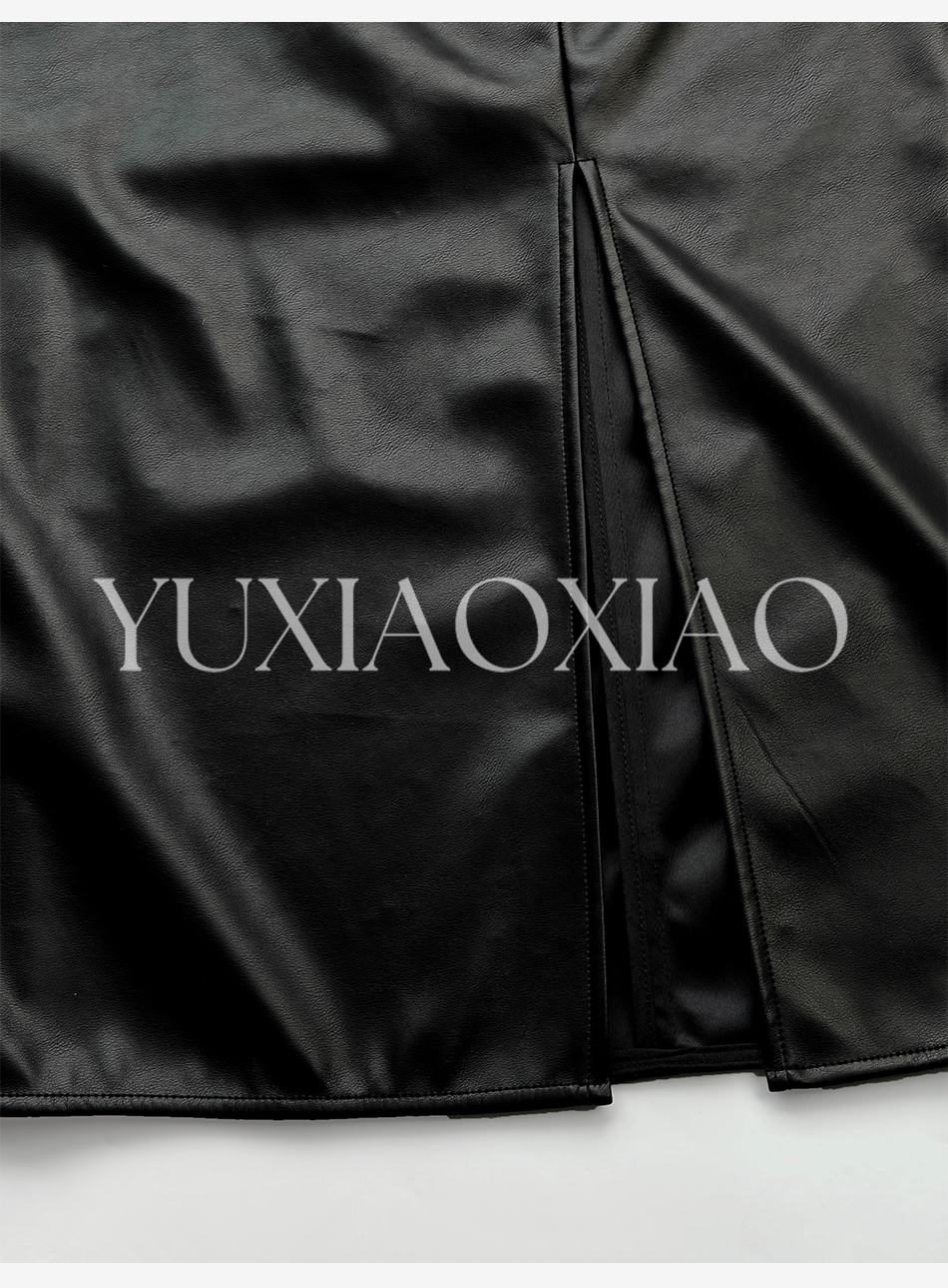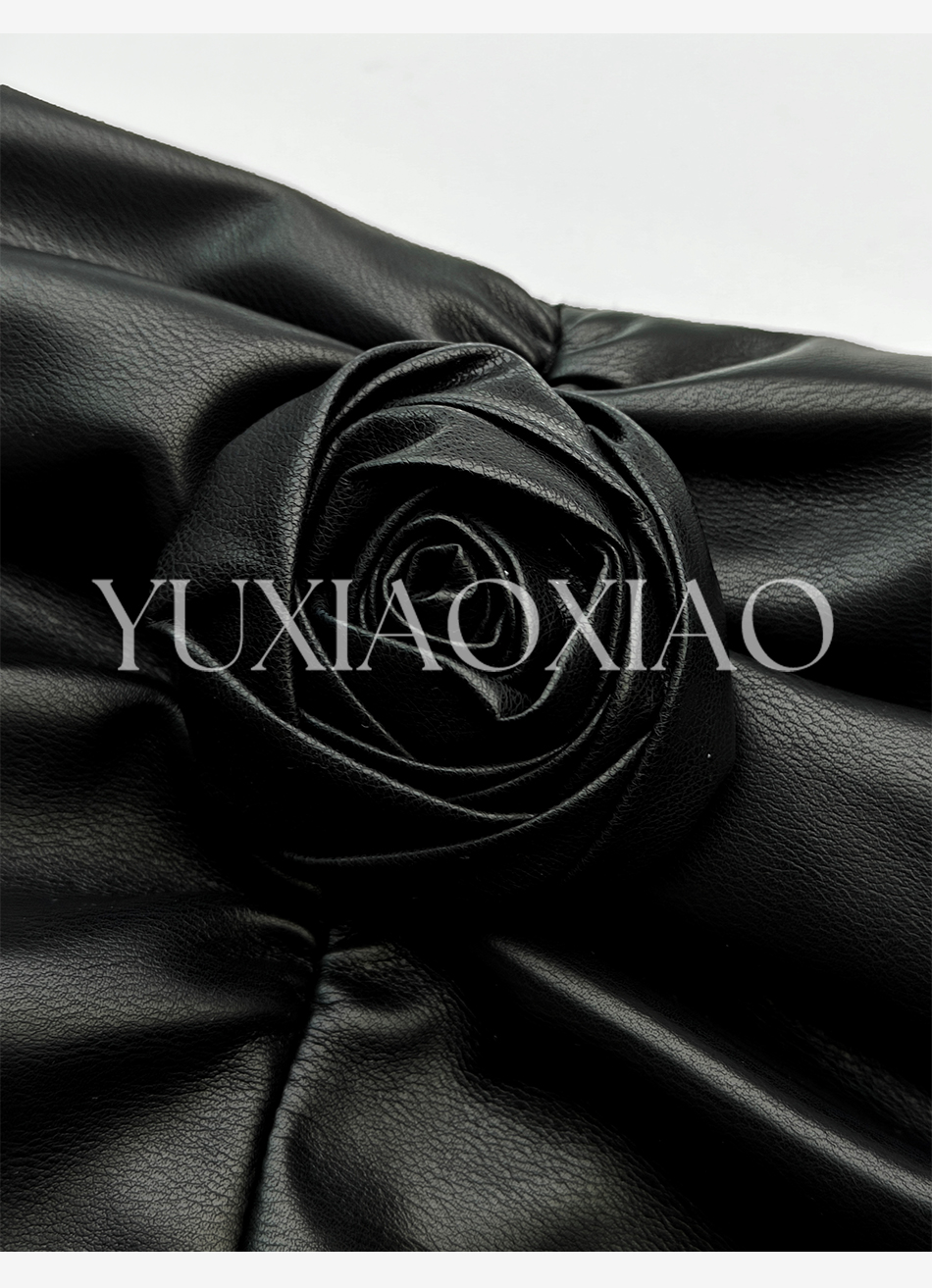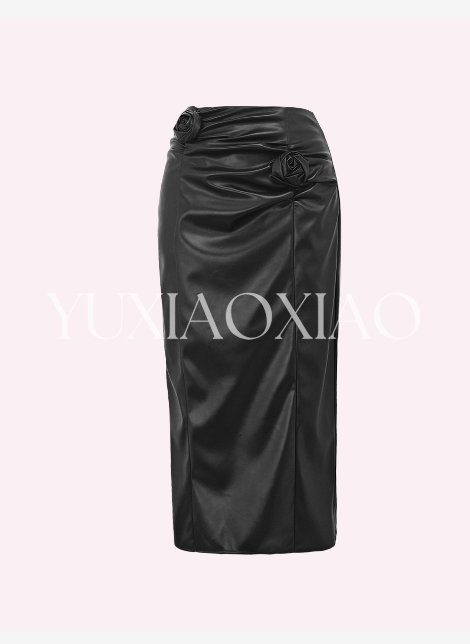 余潇潇【黑玫瑰】时尚高级简约拼接褶皱立体花朵女士皮裙2025新款