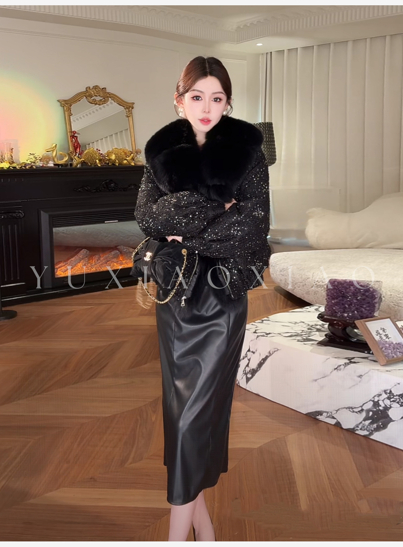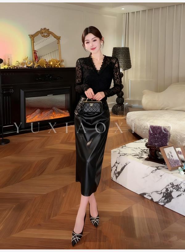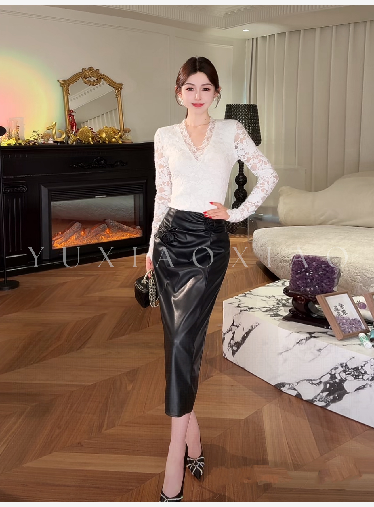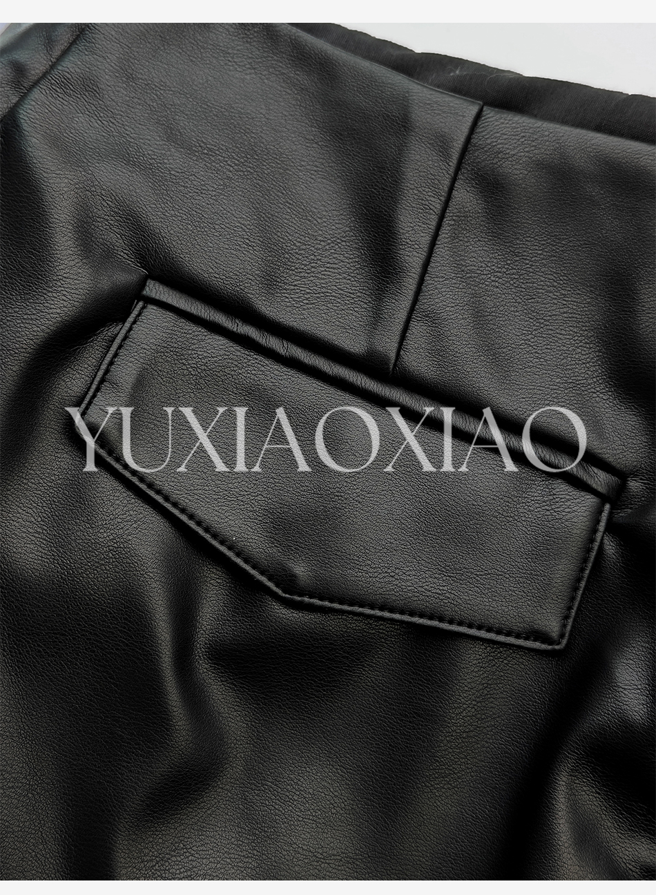 余潇潇【黑玫瑰】时尚高级简约拼接褶皱立体花朵女士皮裙2025新款