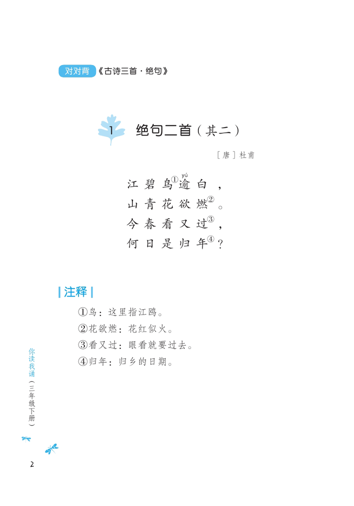 不论是老师还是家长,都可以像下面的例子这样,用“读”来提示孩子背诵,也就是“你读我诵”。比如五年级上册第四单元“革命理想”主题中李大钊的《口占一绝》: