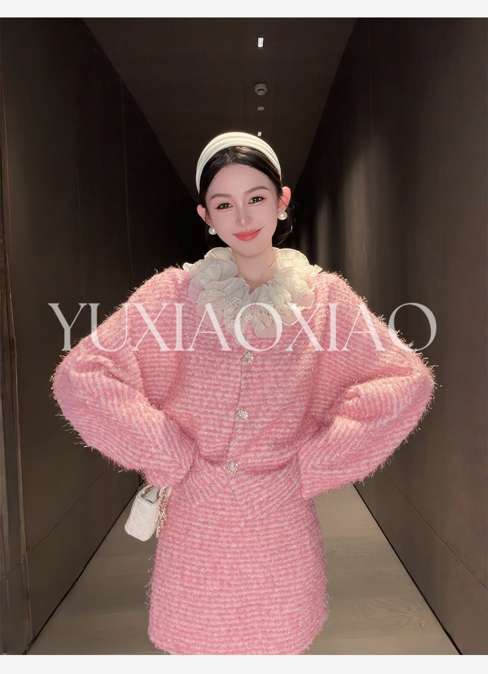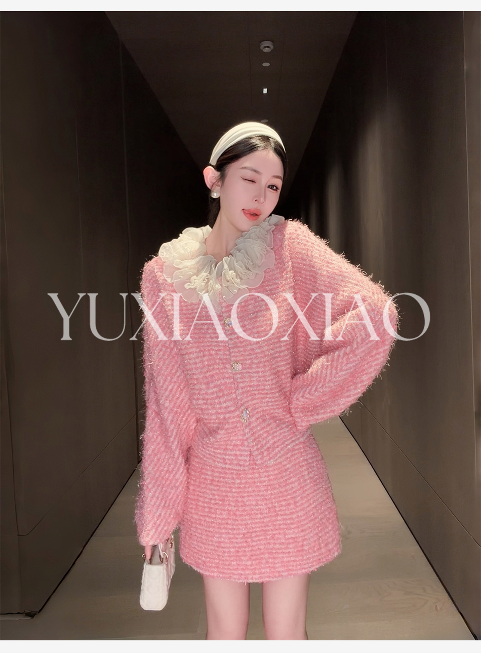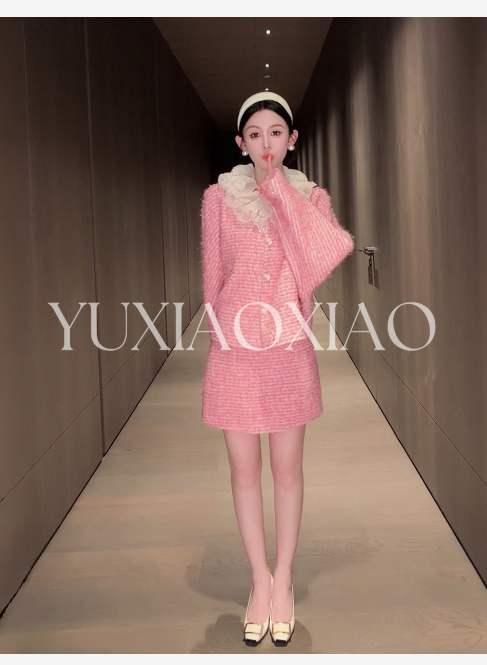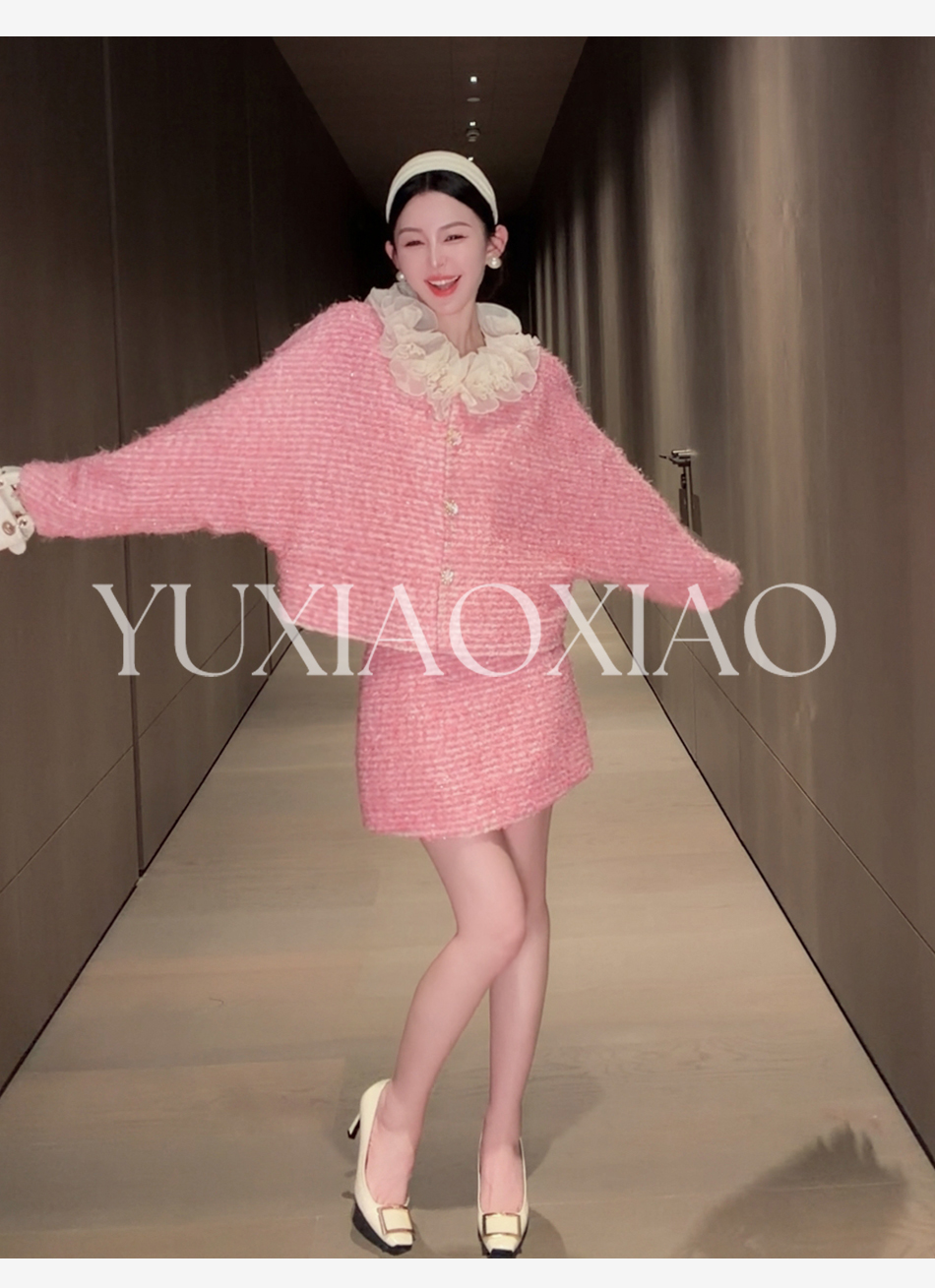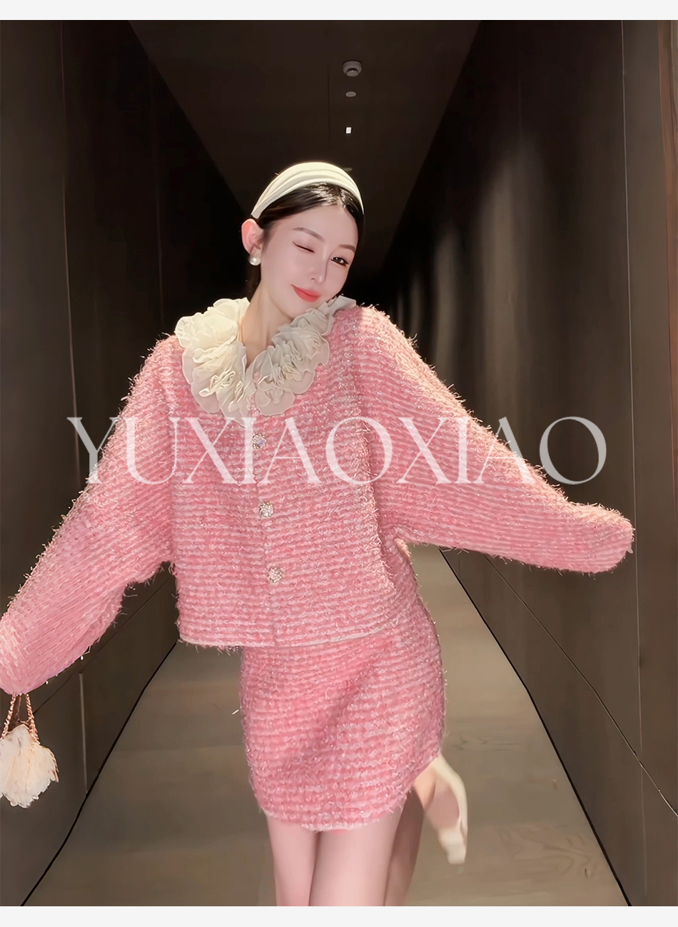 余潇潇【香榭花蕊】含羊毛立体花边连肩蝙蝠袖小香外套&包臀短半裙