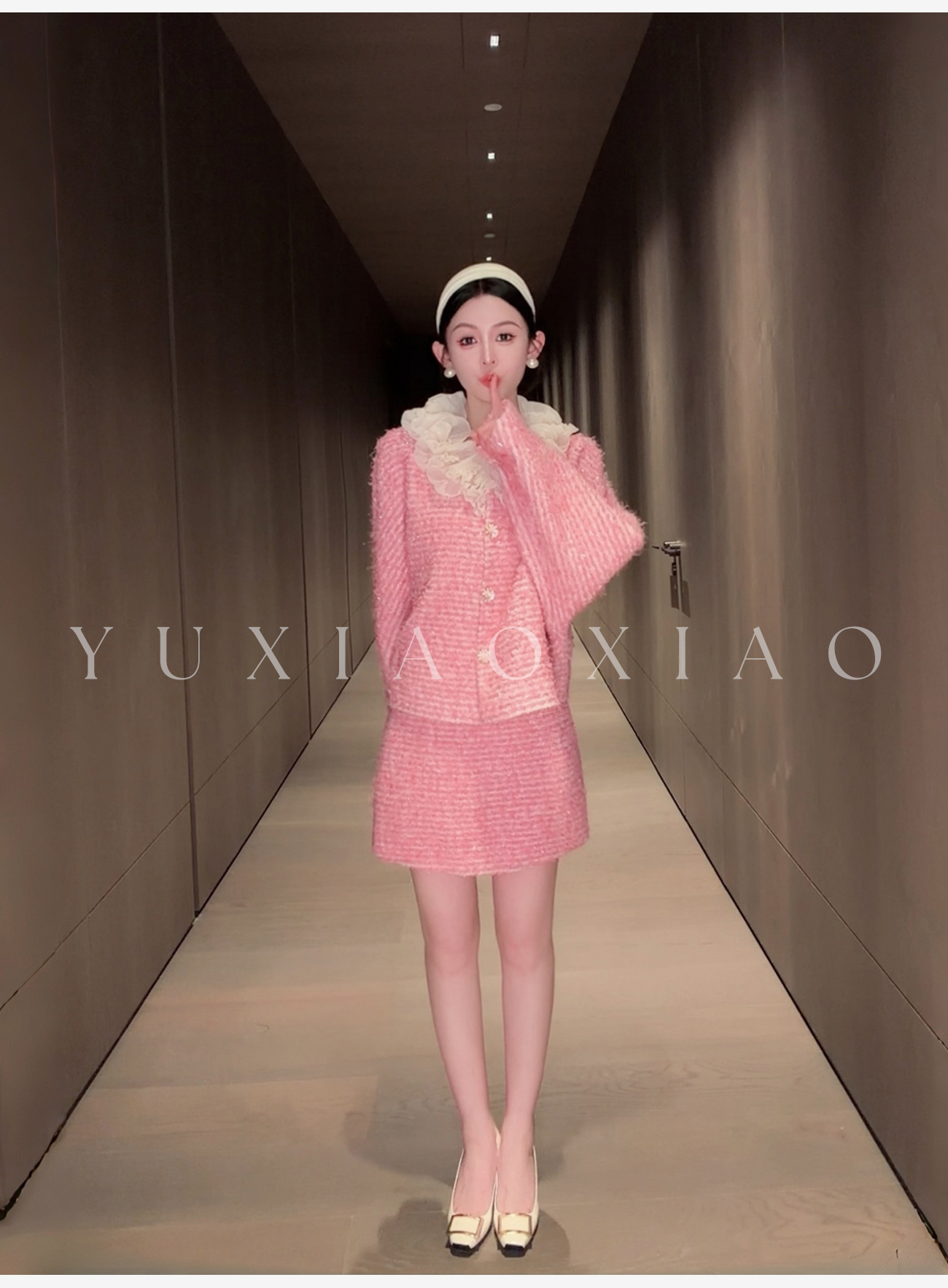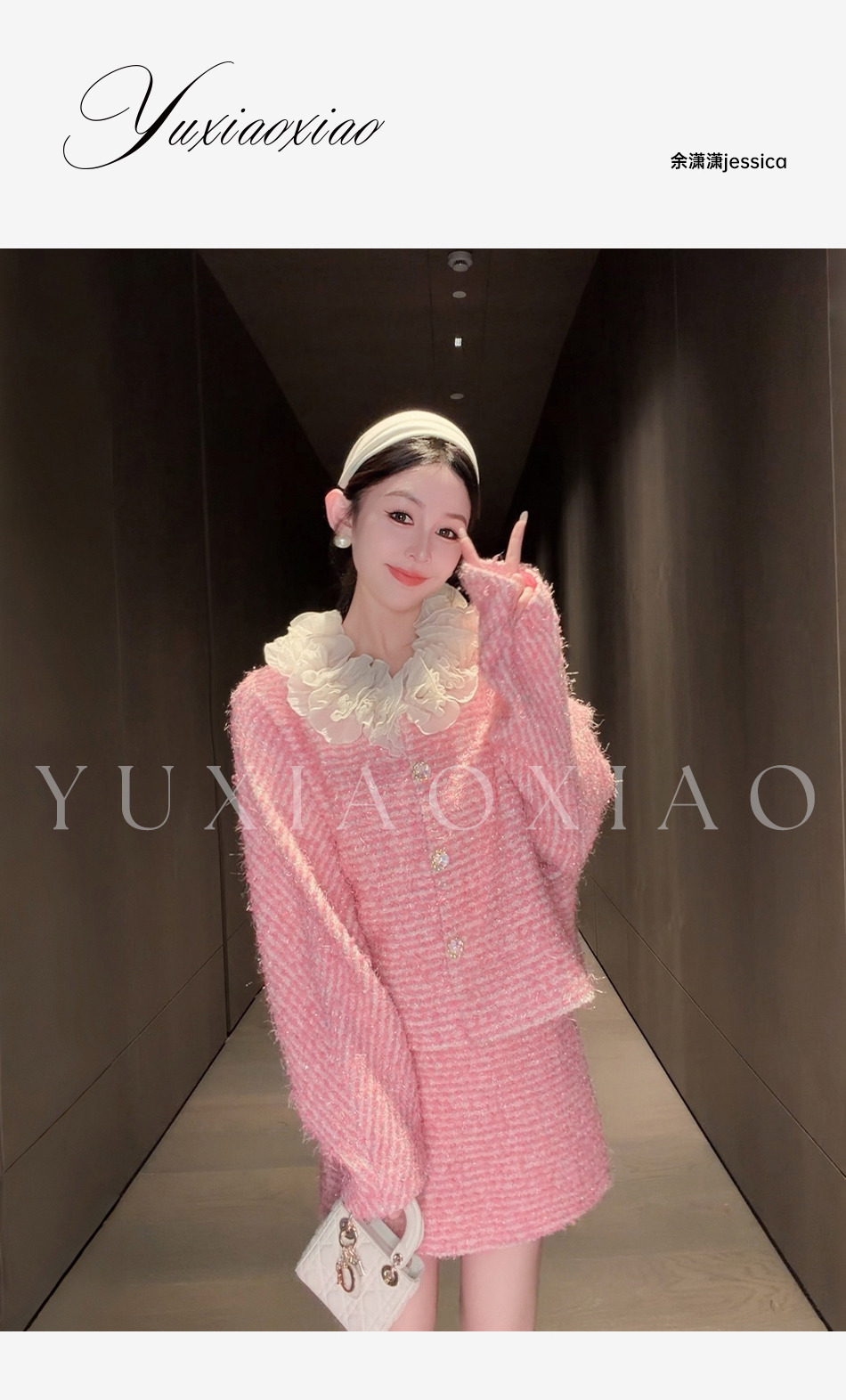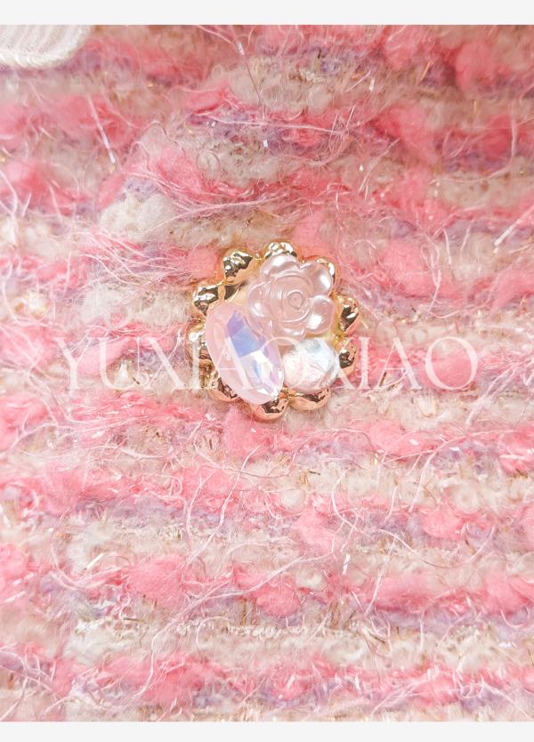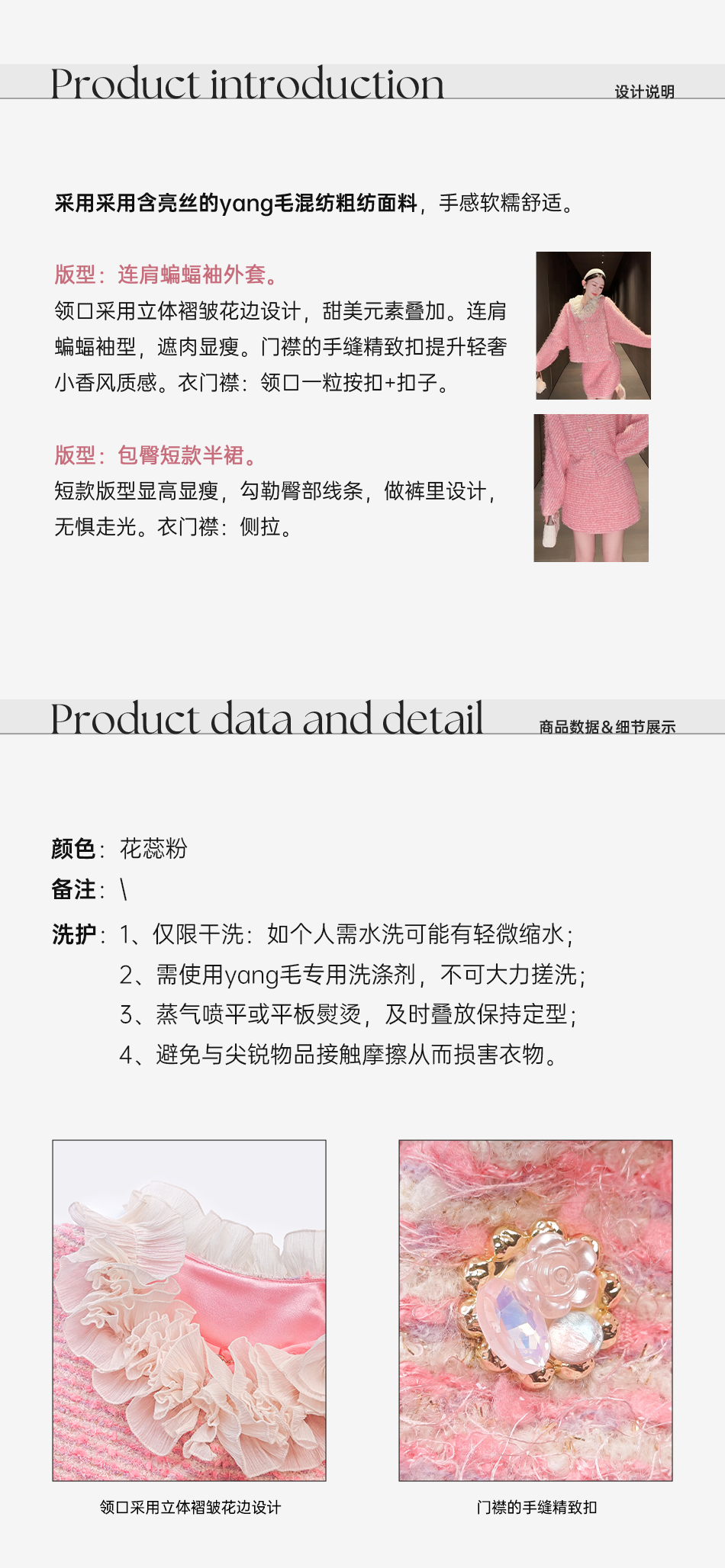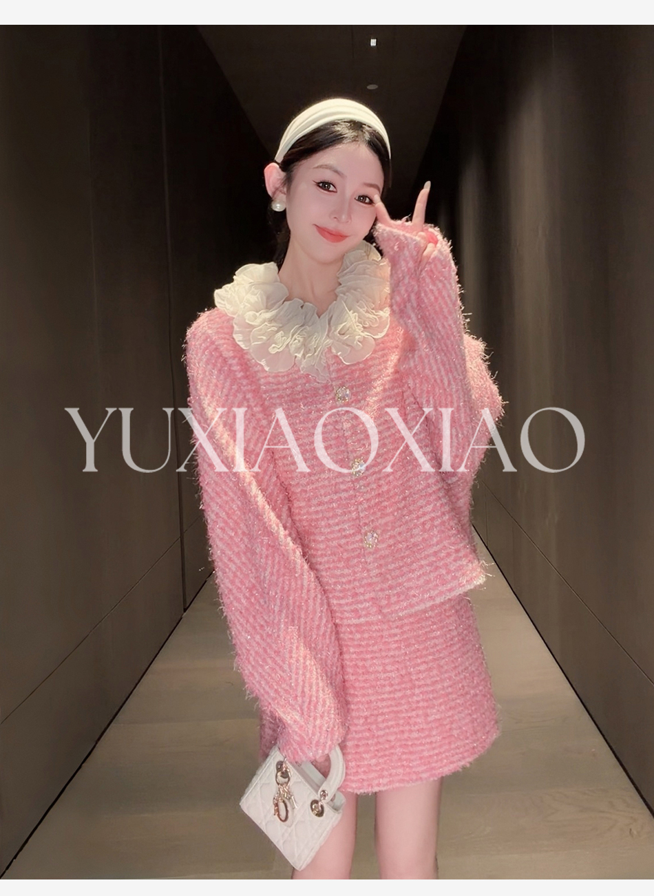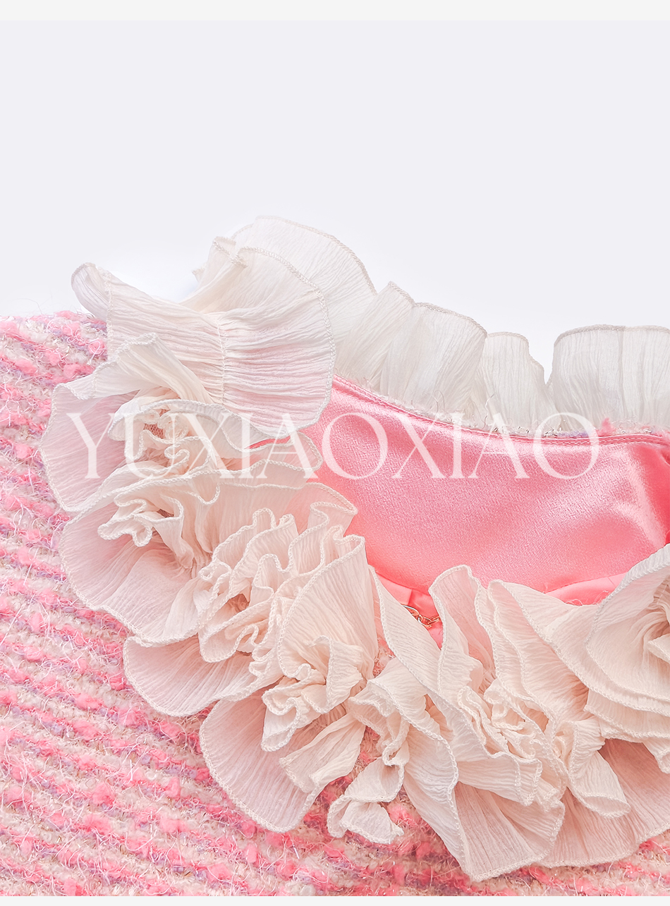 余潇潇【香榭花蕊】含羊毛立体花边连肩蝙蝠袖小香外套&包臀短半裙