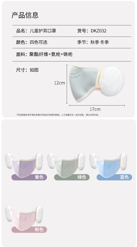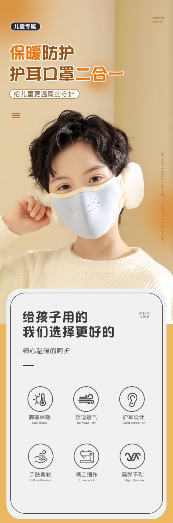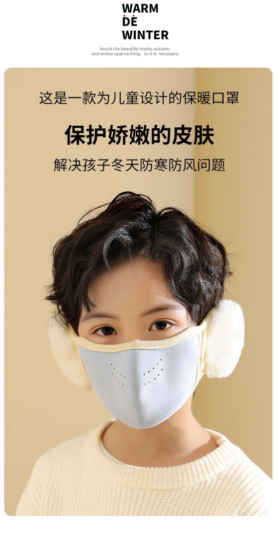 根据儿童面部特征 设计的立体剪裁工艺 毛绒绒耳罩设计,戴上超温暖,外出再也不怕冻耳朵了。 搭配亲肤弹力绳,材质柔软还能防滑落 自由调节耳朵处的松紧,长时间佩戴不勒耳朵 非常友好,适用于各种脸型。